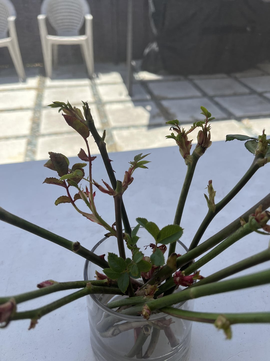 これらのバラはプレゼントでいただきました。水をきれいに保つために、ろ過した水、スプライト、漂白剤を一滴入れて置きました。 2週間ほど持ち、新しい葉と枝が芽生え始めました!それで、増殖させてみようと思いました。何をしているのか全く分からないので、アドバイスをいただければ幸いです。
