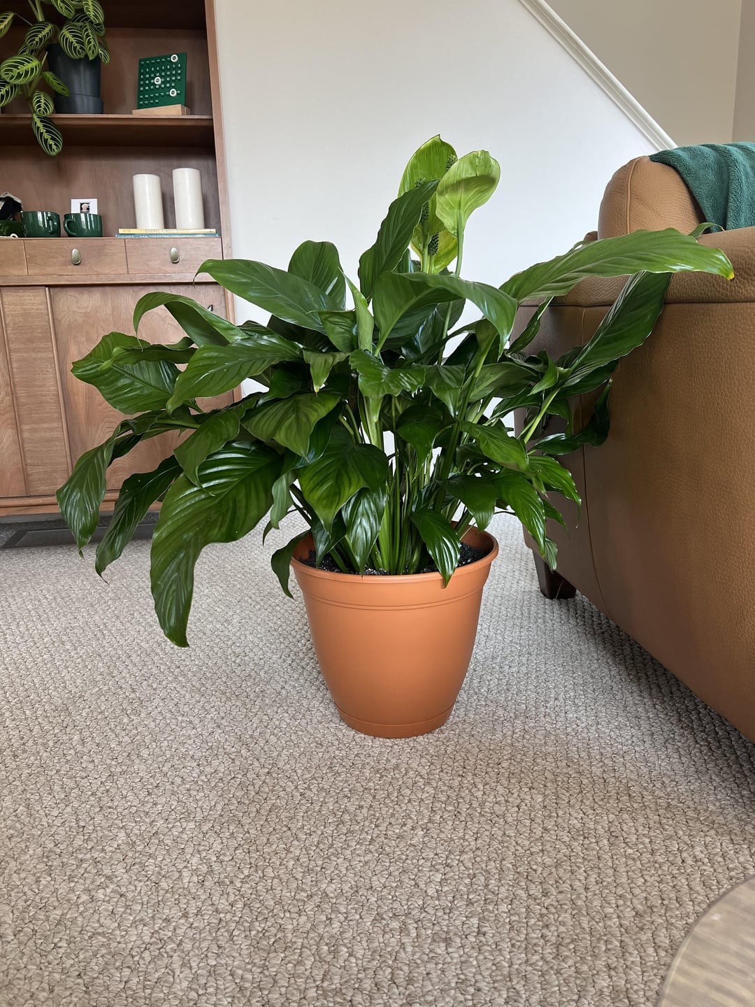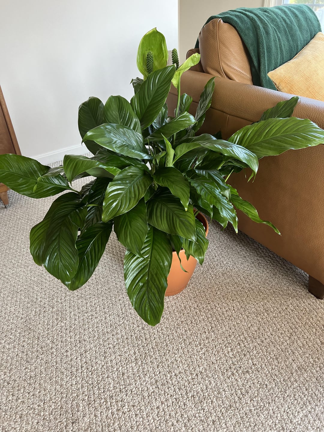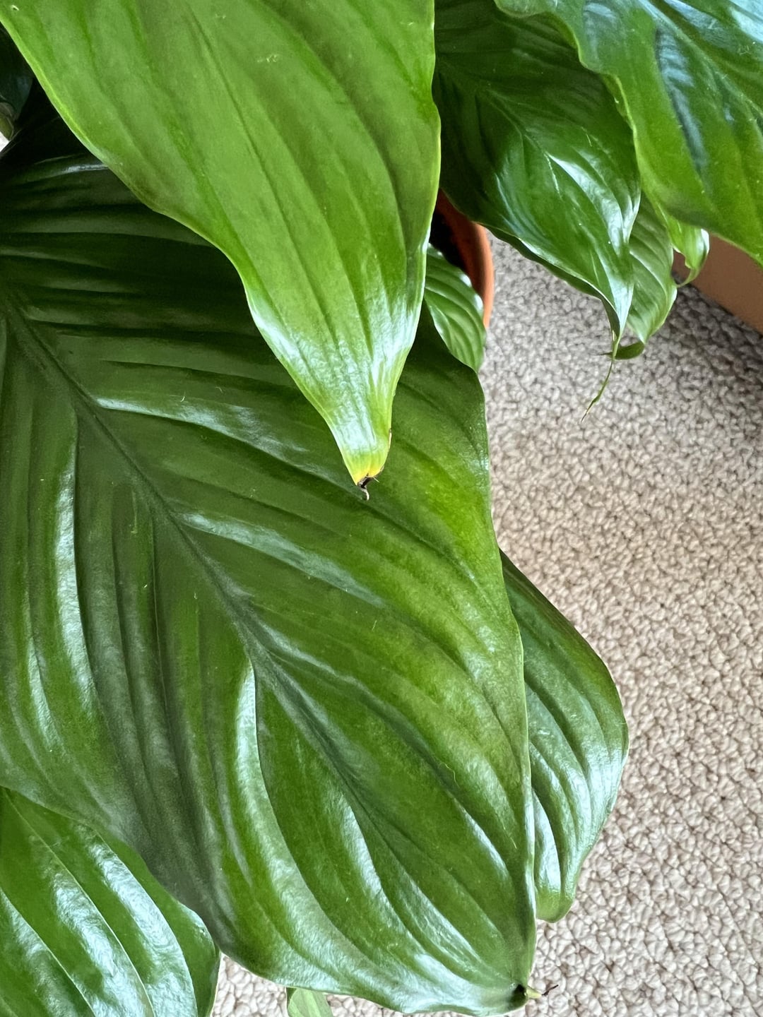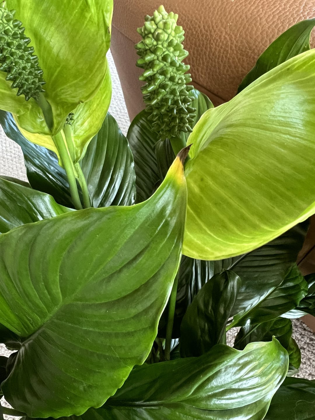 こんにちは!これは私が初めて育てたピースリリーで、私にとっては大切なものなので、心配無用かもしれませんが、聞いてみてもいいかなと思いました。この植物を育て始めてちょうど2か月になりますが、その間に植え替え(根をあまり動かさず、腐っていないか確認するだけ)、また1週間ほど窓の近くに置いていたため、日光が当たりすぎて花が緑色になってしまいました。心配なのは、葉が4枚枯れてしまい、先端の多くが黄色/茶色になっていることです。葉の上の2インチが乾いたらろ過水で水やりをし、底面からの水やりと通常の水やりを交互に行っています。湿度の問題かもしれないと思い、ろ過水で霧吹きも始めましたが、よくわからないし、この植物の状態が悪化してほしくありません。他にもたくさんの植物を育てていますが、葉がこんな風になったことは一度もありません。写真はすべて、植物に水をやる直前のものです。