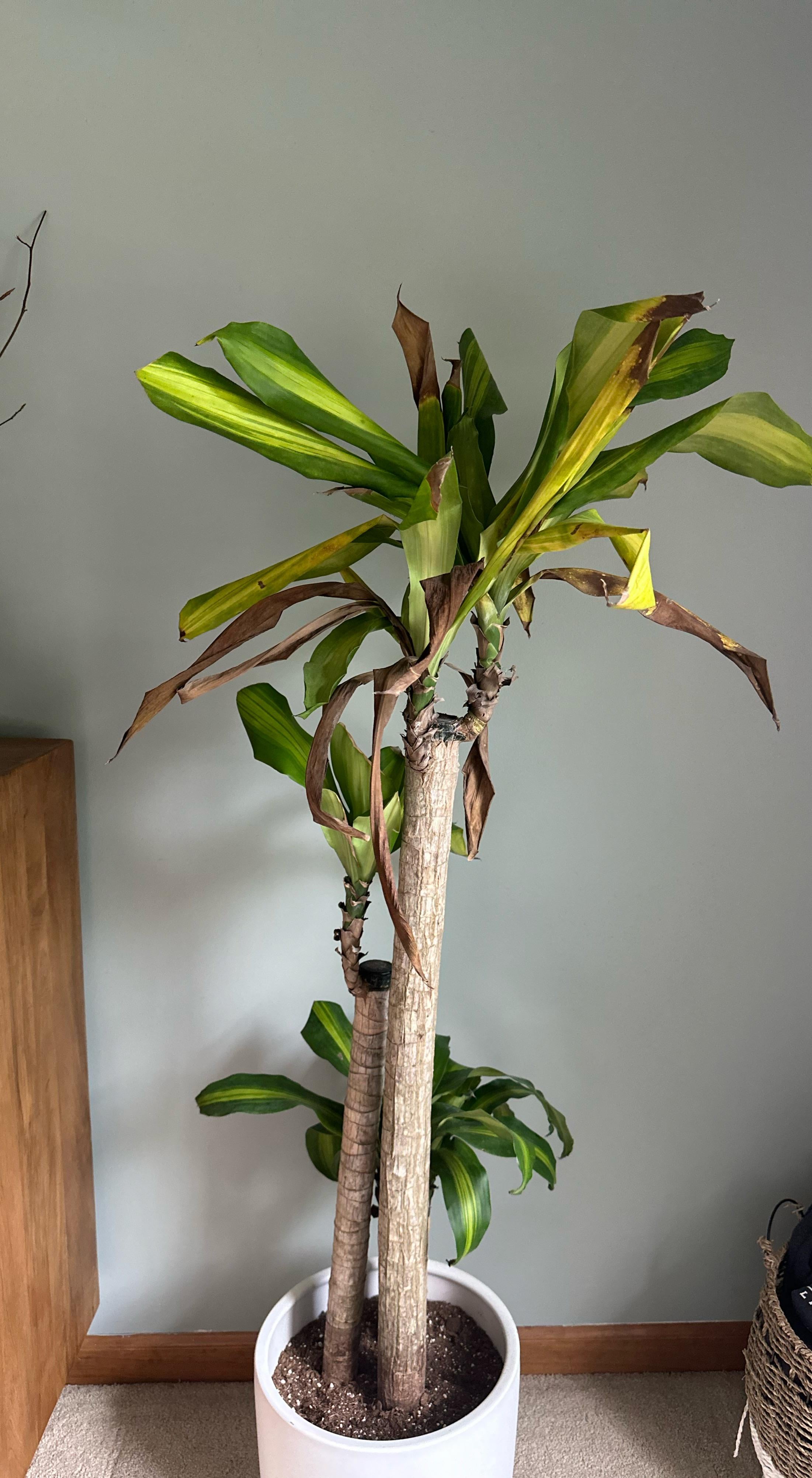 私の植物は、過去 4 か月間に 2 回の引っ越しと 1 回の植え替えに耐えてきましたが、だんだん弱ってきています。水やりの問題 (表土は乾いているのに、裏土は湿っている)、植え替えの失敗 (植え替え時に古い土を残しておいたので、裏土が根に触れていないのかもしれません)、あるいは他の原因があるのかはわかりません。助けてください! 🙏