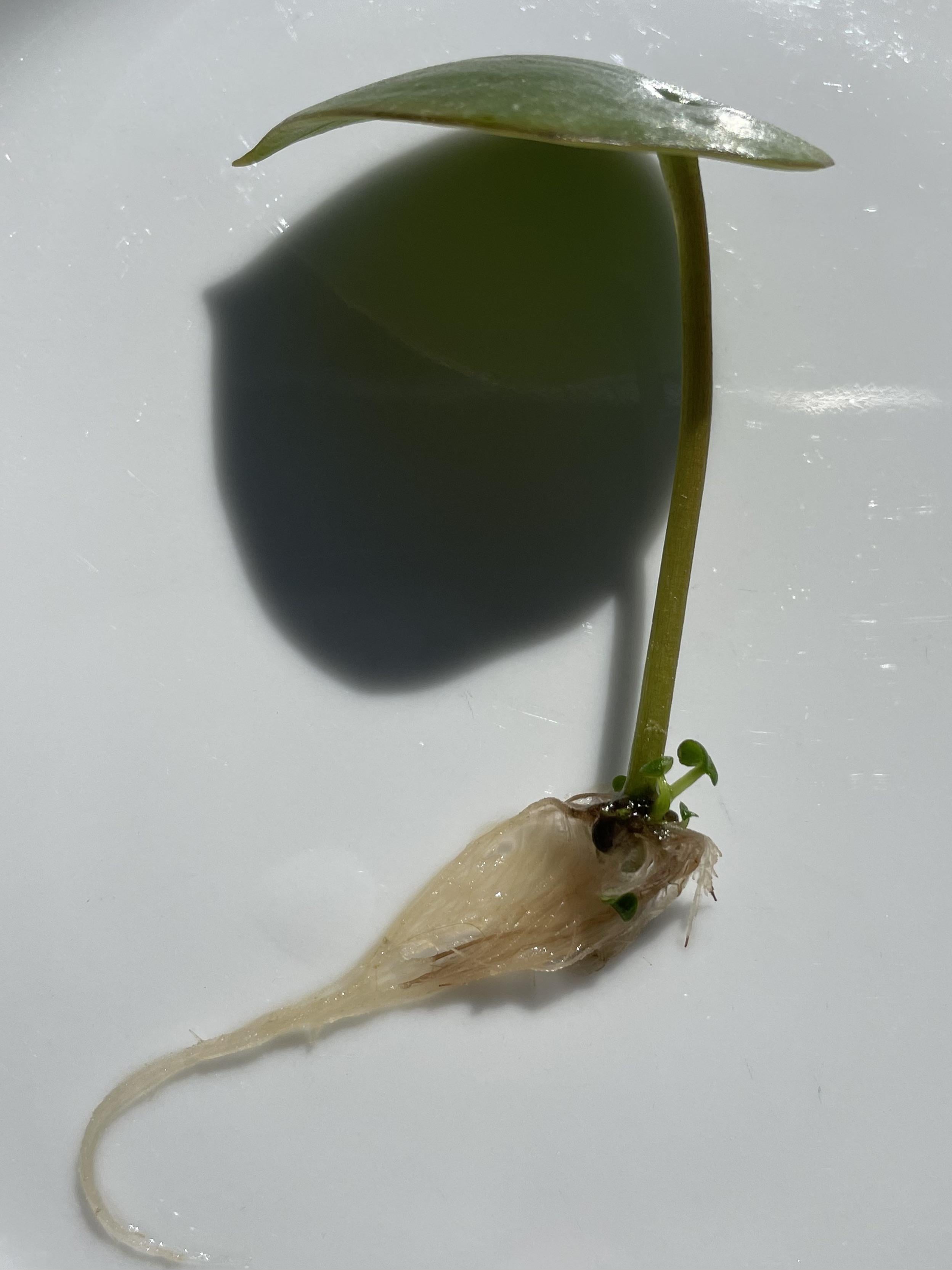 これは不可能だと読んだのですが、思い切って試してみました。パイレア・ペペロミオイデスの葉を一枚水に浸したところ、子株ができました!