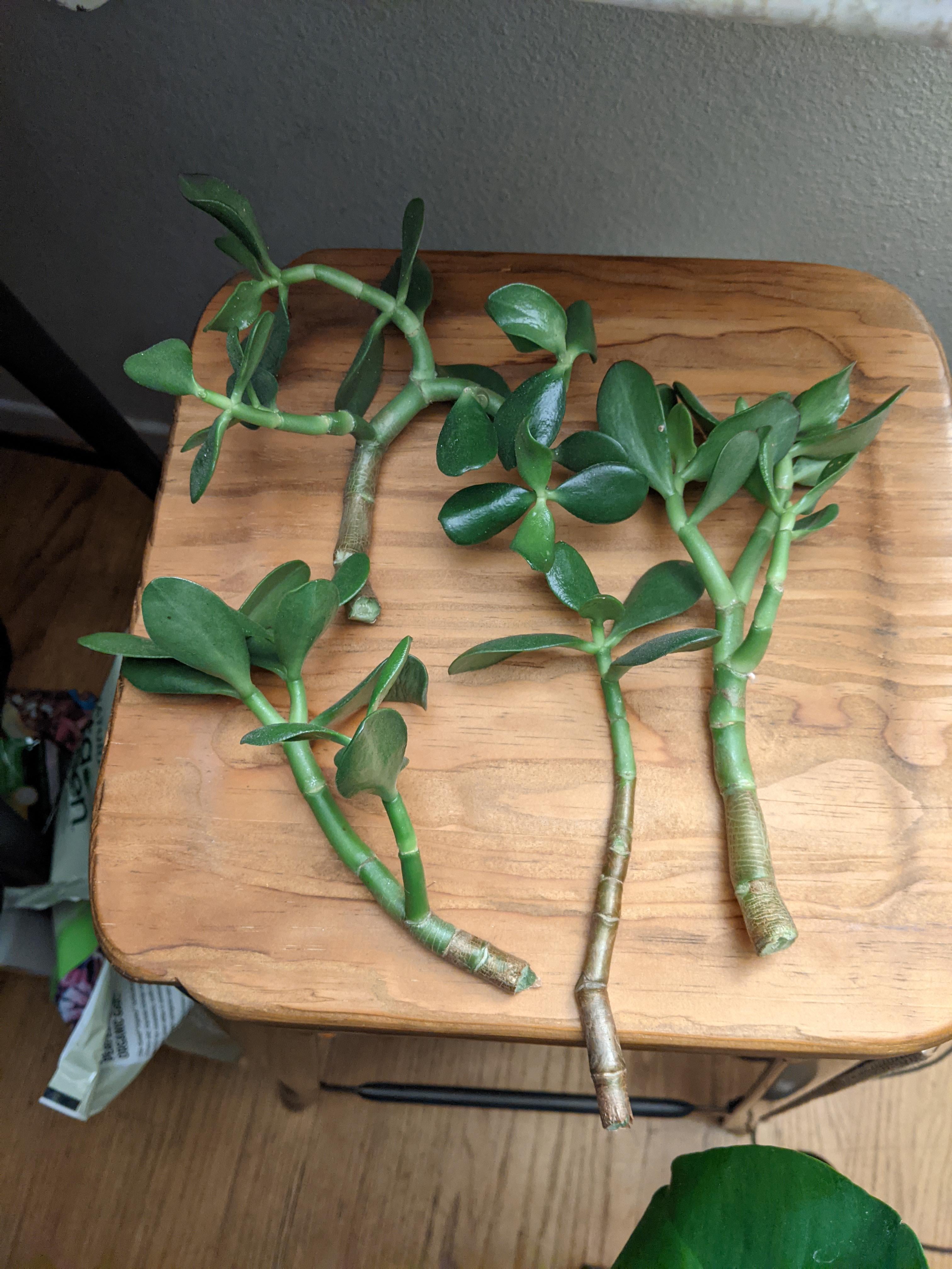 長い間、潜入者でしたが、初めて投稿します。私はいつもプロップリフトをしたい気持ちでいっぱいですが、実際にやったことはありません。正直、これはおそらくカウントされないでしょうが、私が働いている図書館を改装していて、これらの見事な巨大なヒスイの植物を照明のない屋内に移動しました😤。パティオにどれくらい長く置かれていたのかはわかりませんが、図書館の歴史の特別な一部です(少なくとも私にとっては)。今日そこに行ったのですが、私はこう思いました。 "万が一、この子たちが成功しなかったときのために、枝をいくつか取っておこうと思います。" そして、私と一緒にいた同僚は、それ以上の刺激を必要としませんでした。ただ興奮して、 "はい!私は間違いなくこれに興味があります。" 保険として植えるつもりです。元の植物が生き残れば、子孫も増えるでしょう。とにかく、初めての経験を皆さんと共有したかったのです 😊