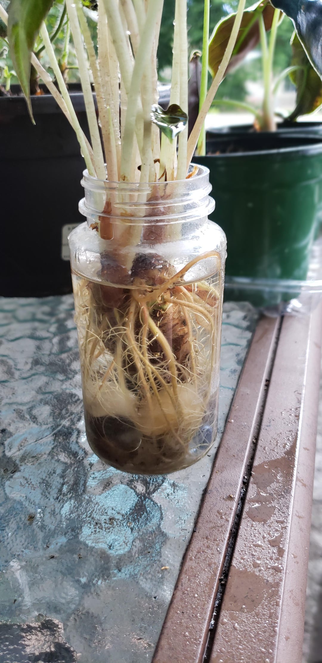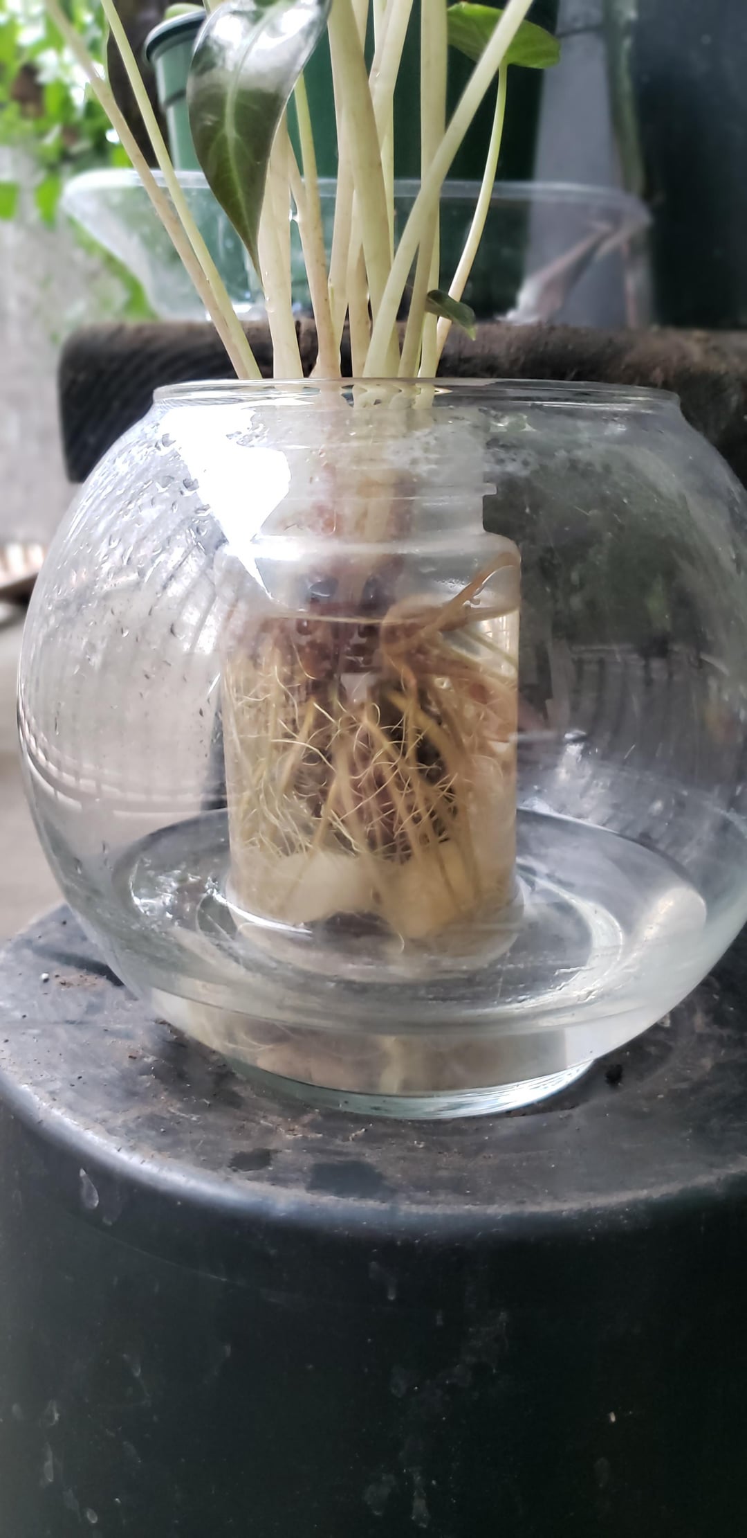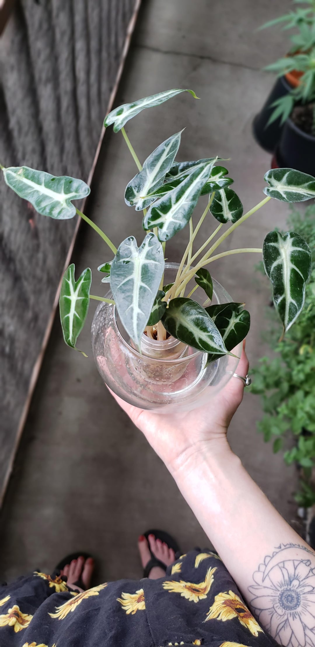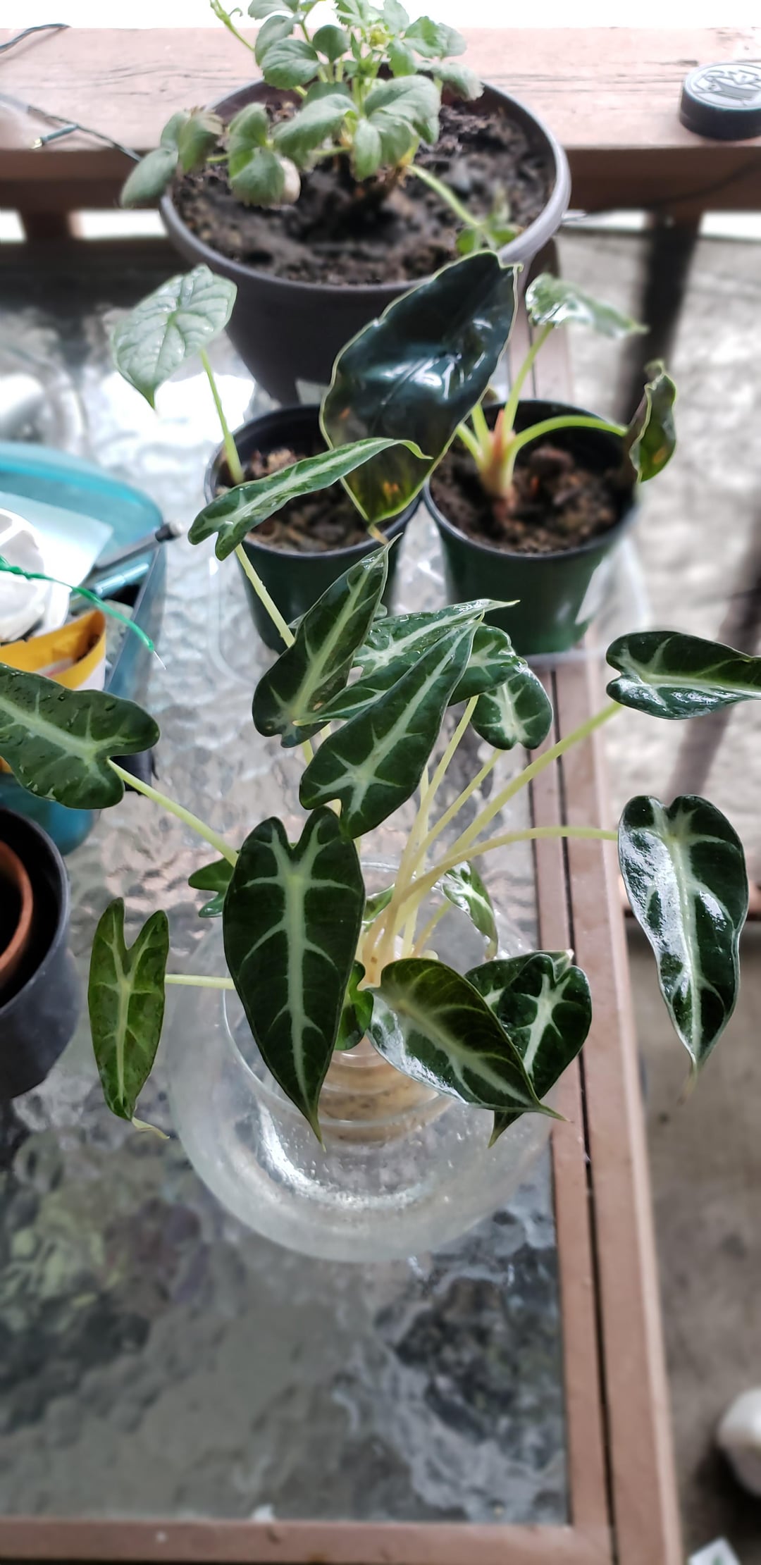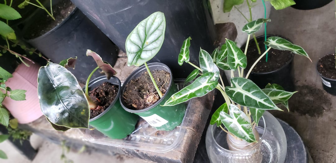 私のアロカシア・シルバー・ドラゴンとアズラニを背景にしておいてください。それについてもアドバイスできると思います。 店で割引価格で購入したシルバードラゴンには新しい芽が出てきていますが、土の配合がとても荒いように見えます