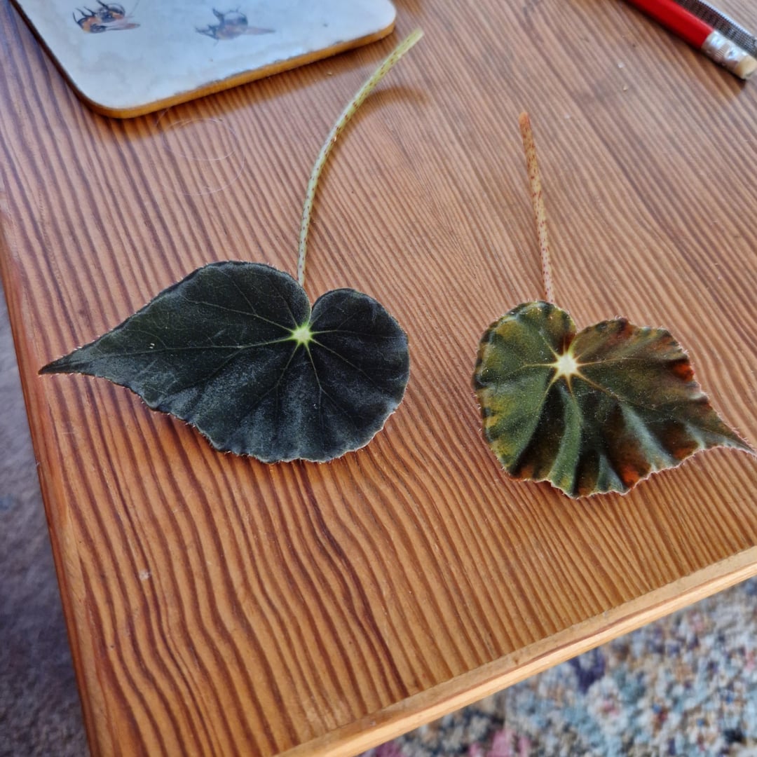 友達と一緒に、彼女が世話している猫に餌をあげに行きました。飼い主は植物人間です。 2 つの異なるベゴニアから数枚の葉を摘み取りました。 硬化したベゴニアの栽培者が私に何かアドバイスを持っていますか? 😁
