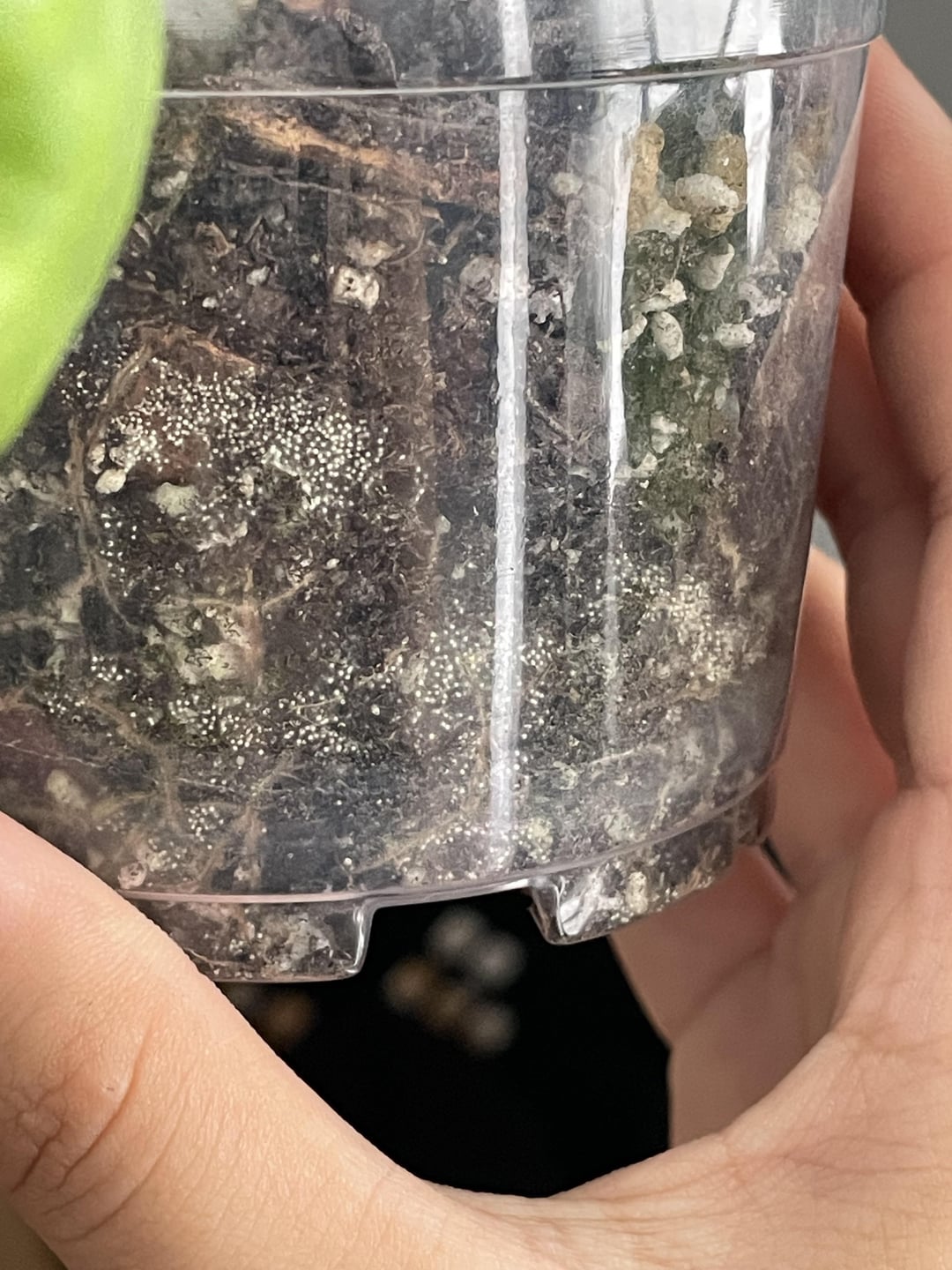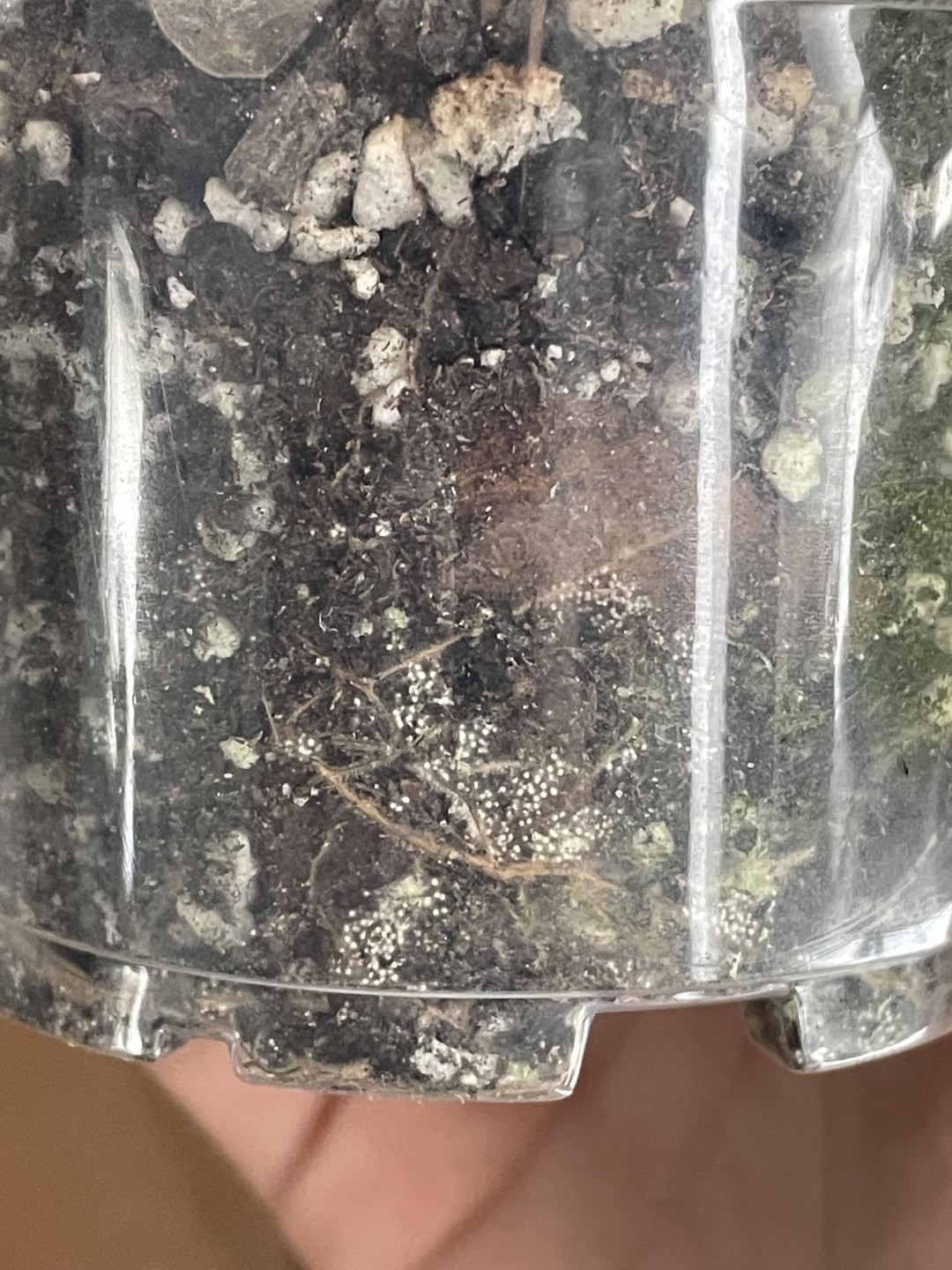 私はこれを東向きの窓辺に置いて、間接光と時々直射光が当たるようにしています。ここのところ、曇りや雨が多く、あまり日が当たっていませんが、この植物をチェックしに行ったところ、土の中にこれらのものを見つけました。さらに奇妙なのは、土の表層、特にパーライトが茶色くなっていることです (土が茶色いのは知っていますが、他の植物ではそのようなことは起きていません)。私は通常、完全に乾くまで待ってから水やりをしますが、7 月 21 日以来、水やりをしていません。何が起こっているのか、そして最も重要なことに、どうしたら助けになるのか、誰か知っていますか?