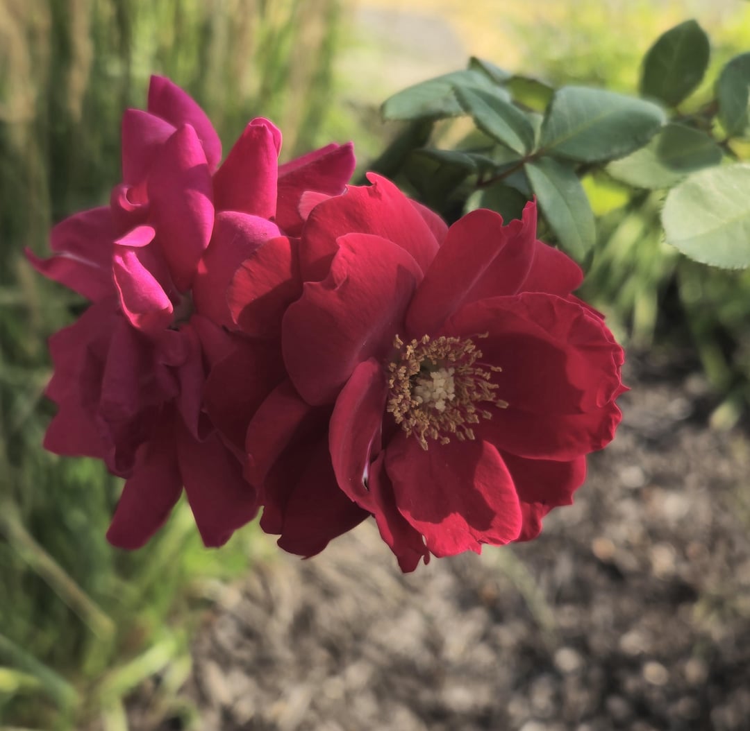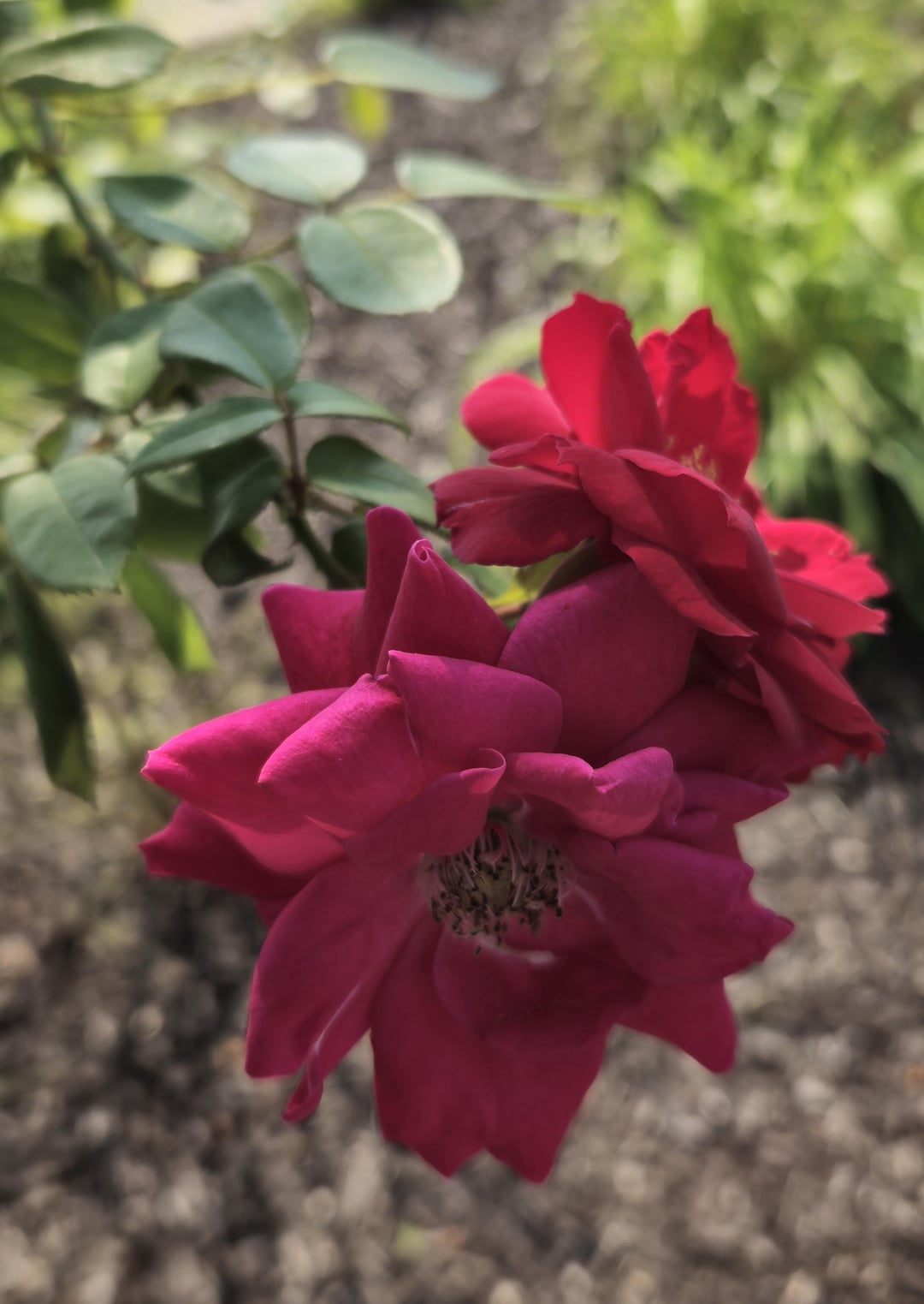 職場のバラの木に、2種類の色のバラが咲いています。赤とピンク
