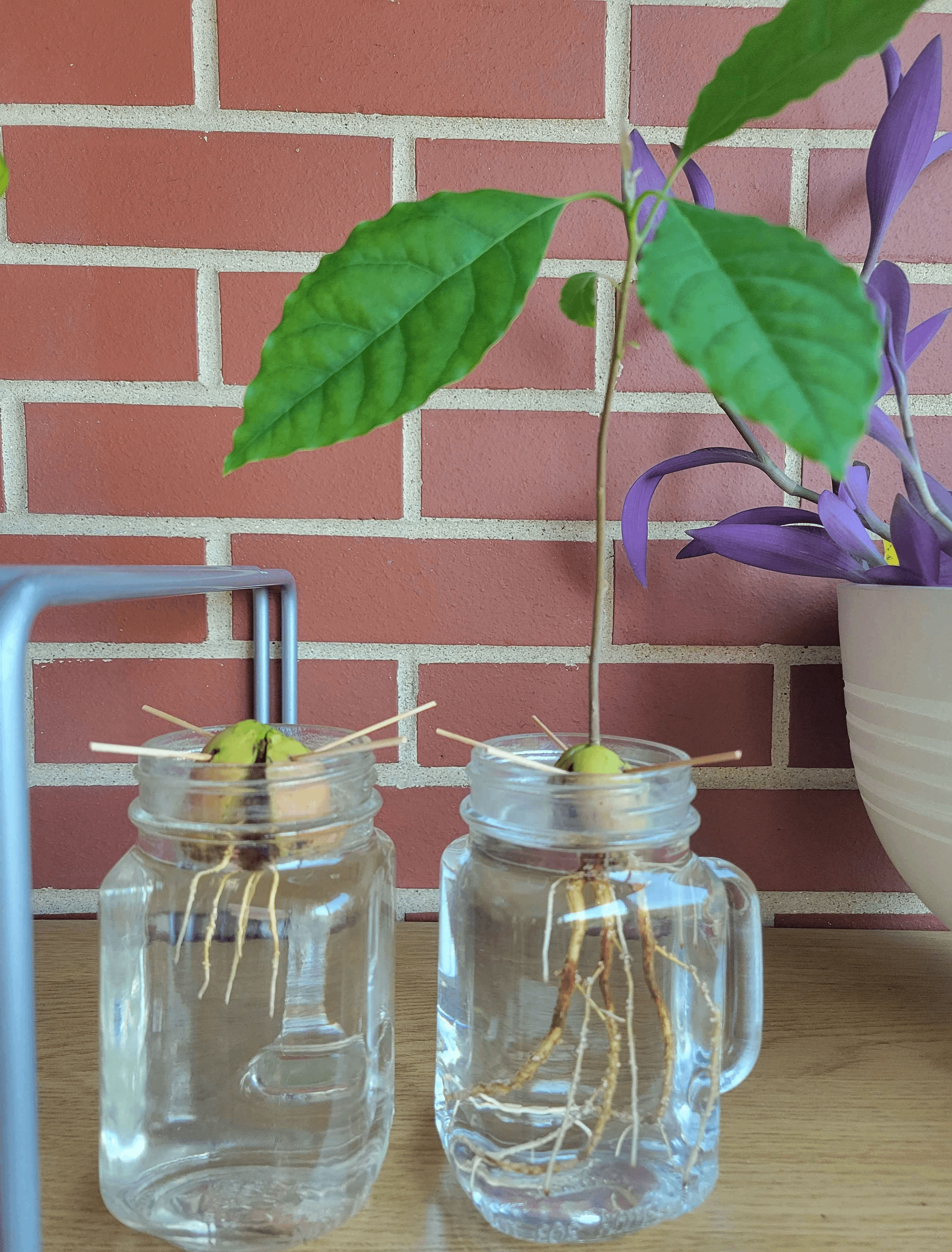 更新!アボカドの種 #2 がついに根を張り始めました!もう 1 つを土に植える時期でしょうか?茎を切ったほうがいいでしょうか?5 月下旬からずっと根を張り続けています