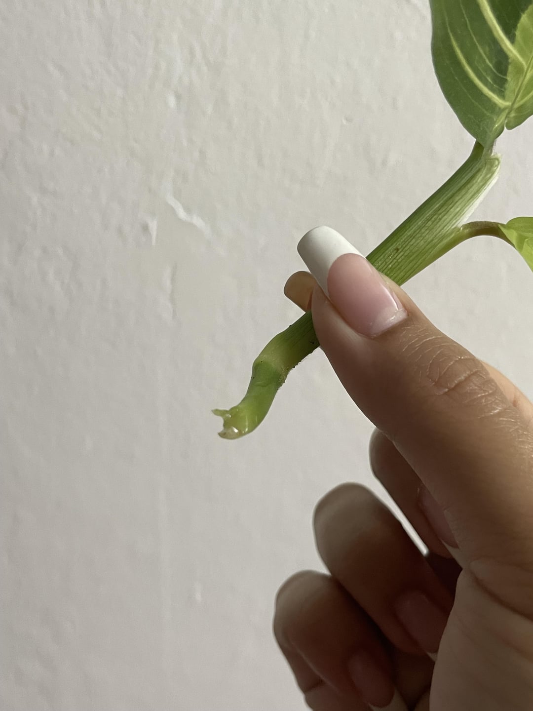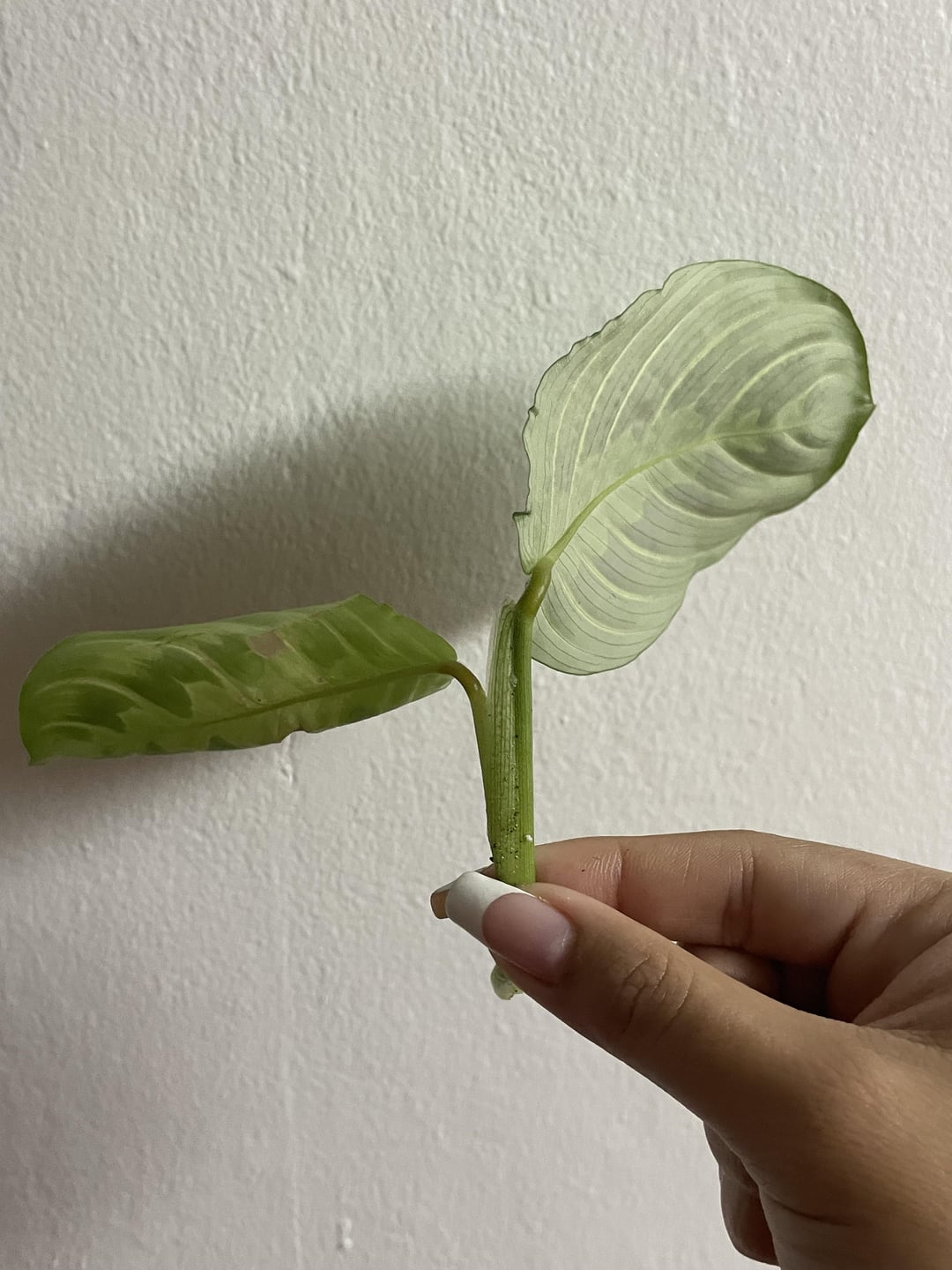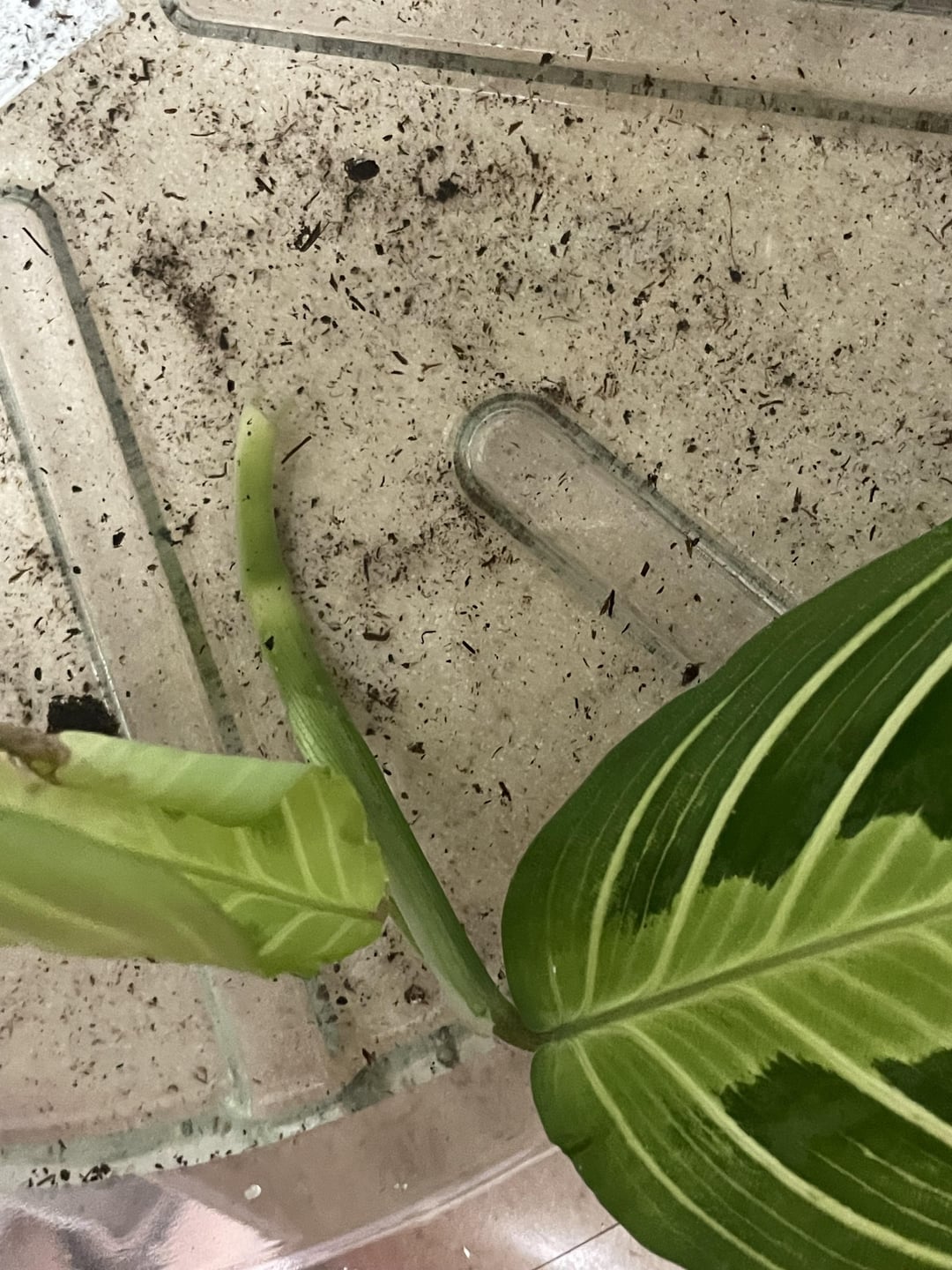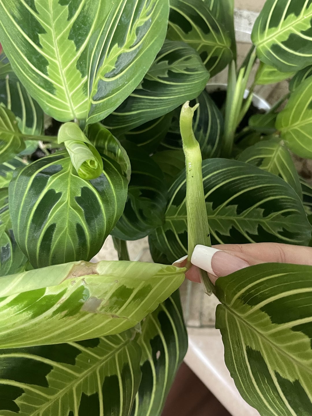 猫が祈りの植物を倒してしまいました。新しい葉が茶色くなっていたのでずっと害虫に気をつけていたのですが、ついに茎が折れていることに気づきました…根が生えるでしょうか?それとも捨てたほうがいいのでしょうか? よろしくお願いします🫶🏼🪴