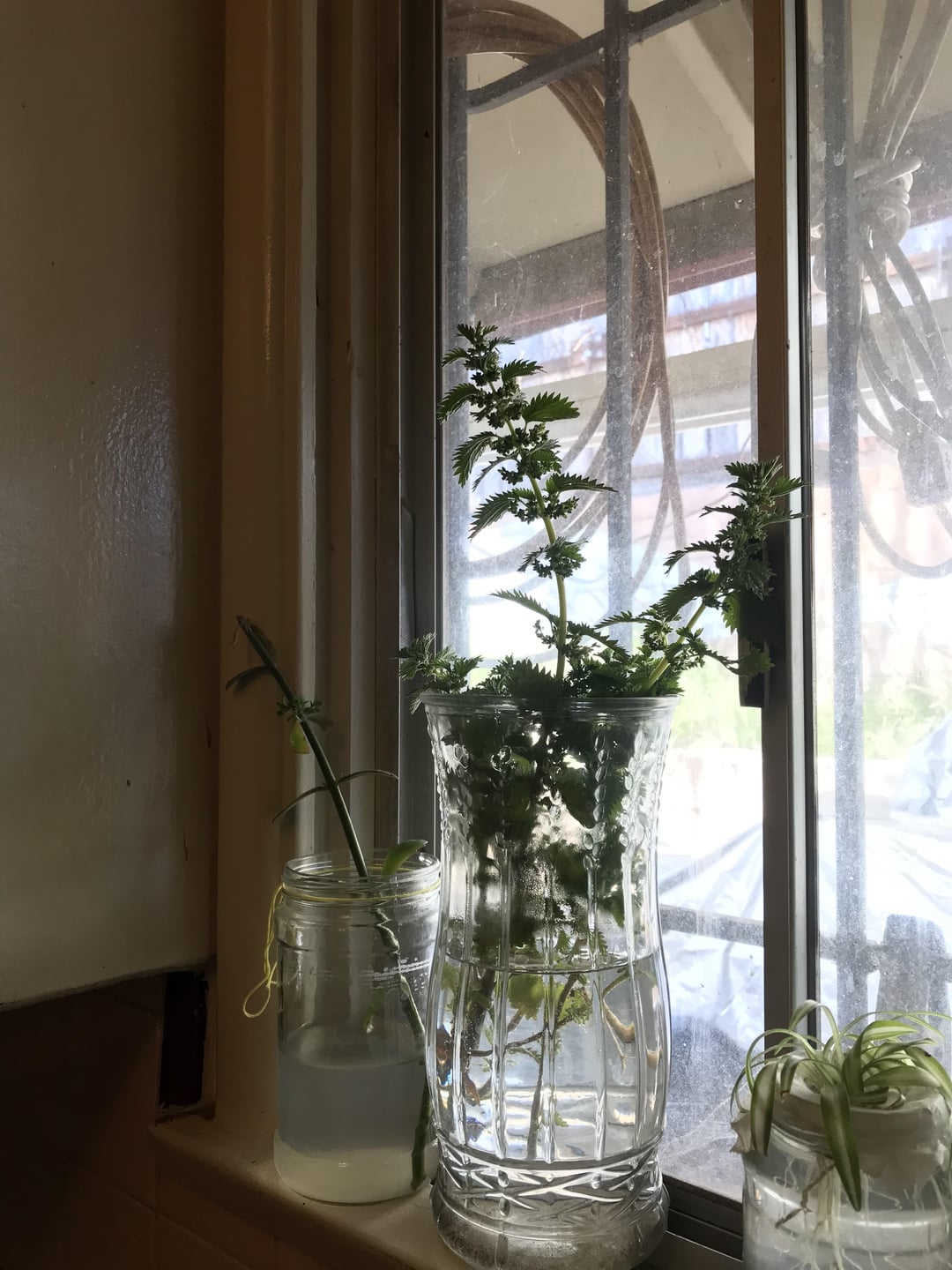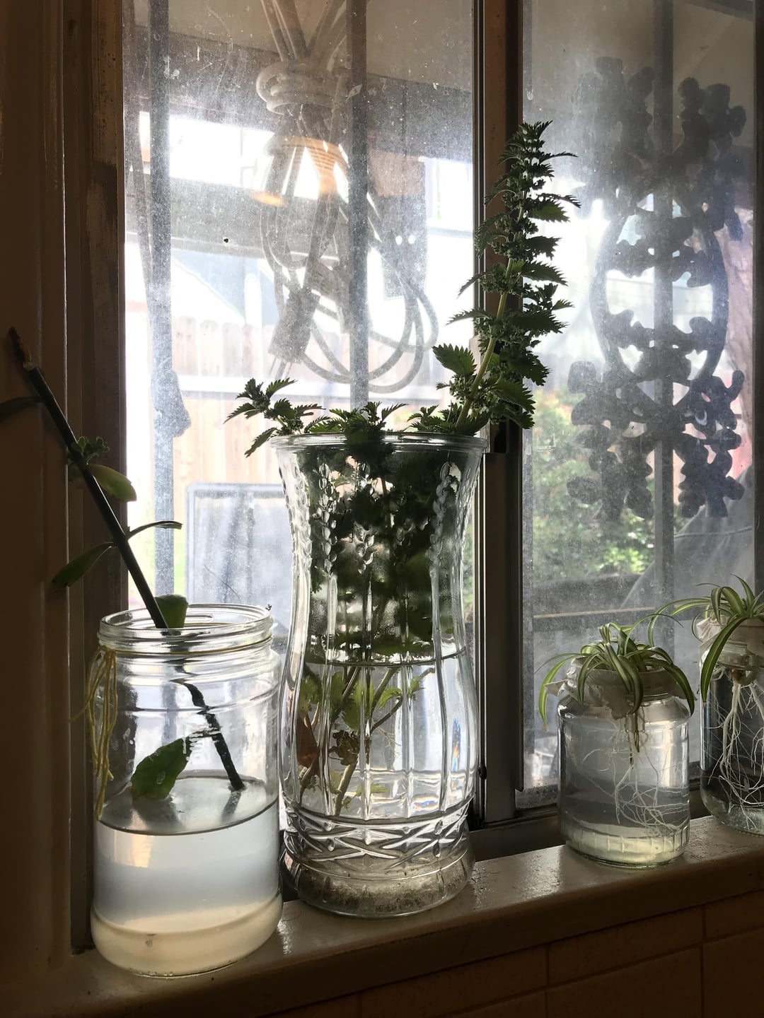 すでに根が出ているので、もしかしたら生きて水の中に根を張り続けてくれるかもしれません。 私は水中で植物を育てるのが大好きです。 スパイダープランツが2本と、多肉植物から挿し木したものが1本あり、水中で育てています。 さて、このイラクサ。 この花瓶の中で生き続けるか、いつか鉢に移植できることを願っています。 イラクサには多くの薬用用途があることを私は知っています。 でも、私はそれがいかに明るい緑でふさふさしているかということも大好きです。とても生き生きとしていて、それが窓辺の「見物人」として(ただ見て楽しむためだけに)残っているなら、それも私は大丈夫です:)