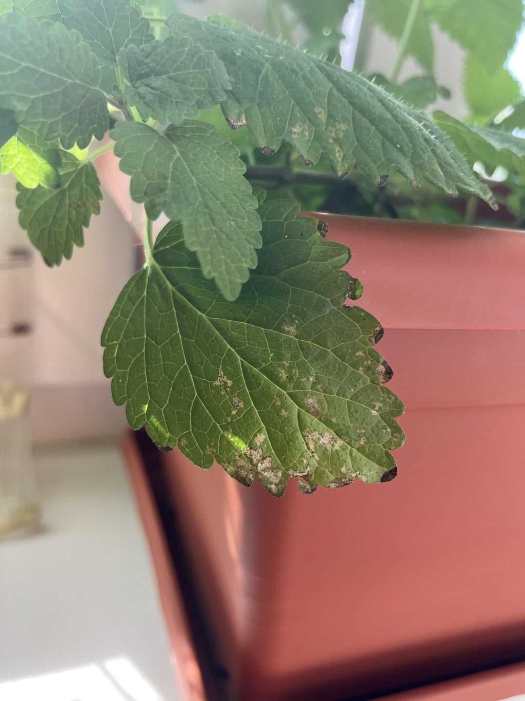 ハーブの葉の周りに白い跡を残す黒い点が何度も見られます。ハーブ栽培は初めてなので、これらの害虫や病気についてはよく知りませんが、植物を救う方法はあるでしょうか?