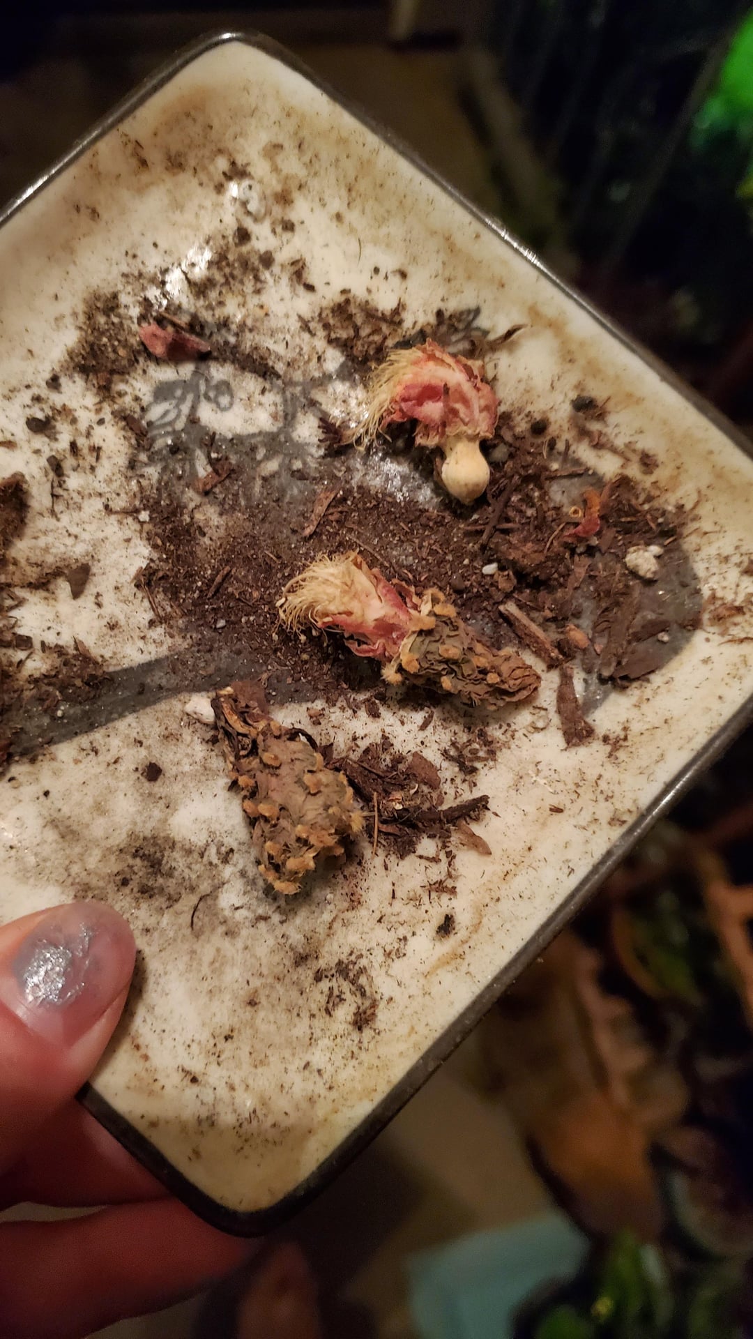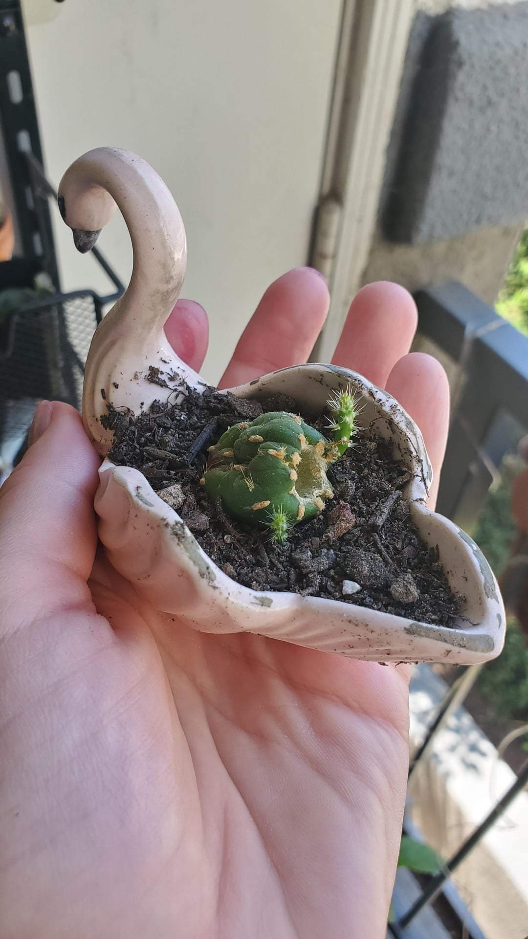 しばらく前に駐車場で落ちていたウチワサボテンの実 (?) を 4 つ拾い、1 週間ほど放置しました。そのうち 3 つはしおれて何も残っていませんでしたが、種がいくつかあるので試してみる価値があると思います。この実を土に少し入れてみましたが、成長が見られて驚き、嬉しくなりました。数日前はここにはなかったはずです。でもどこにも根がないので、この実の長期的な計画はわかりません。