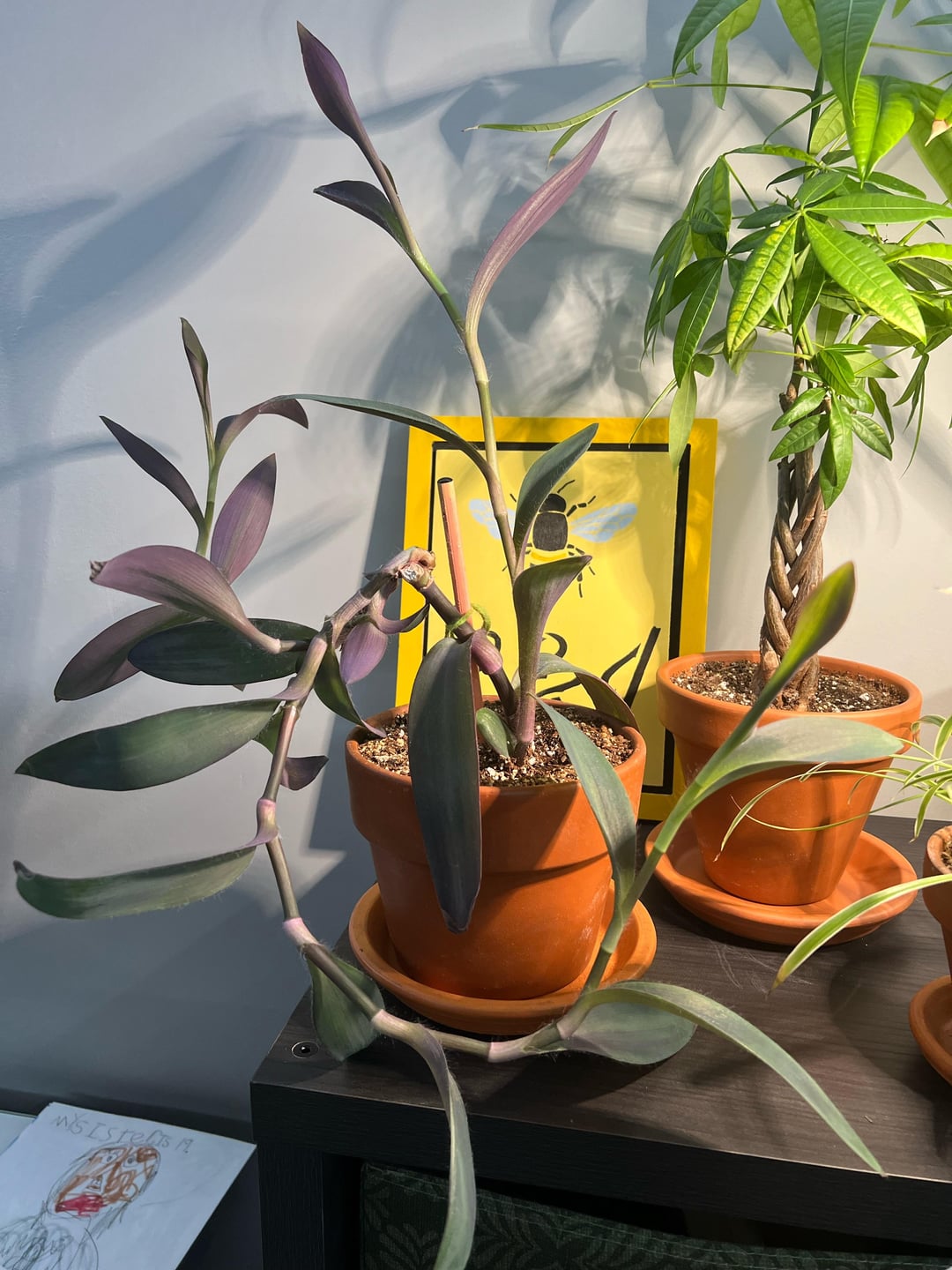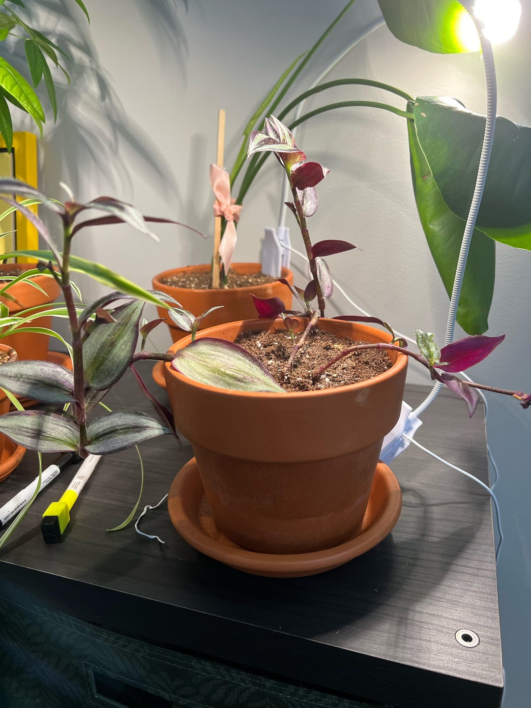 最近植え替えて、新しい環境に慣れるまで数週間待ちました。パープルハートがかわいそうに思えます。というのも、2 つの新しい成長点が、前の所有者がパープルハートを増やすために切ったと思われる場所を圧迫しているからです。そして、1 インチの植物は悲しそうに私のところにやって来ました。間違った増やし方で枯らしてしまうのは嫌です。