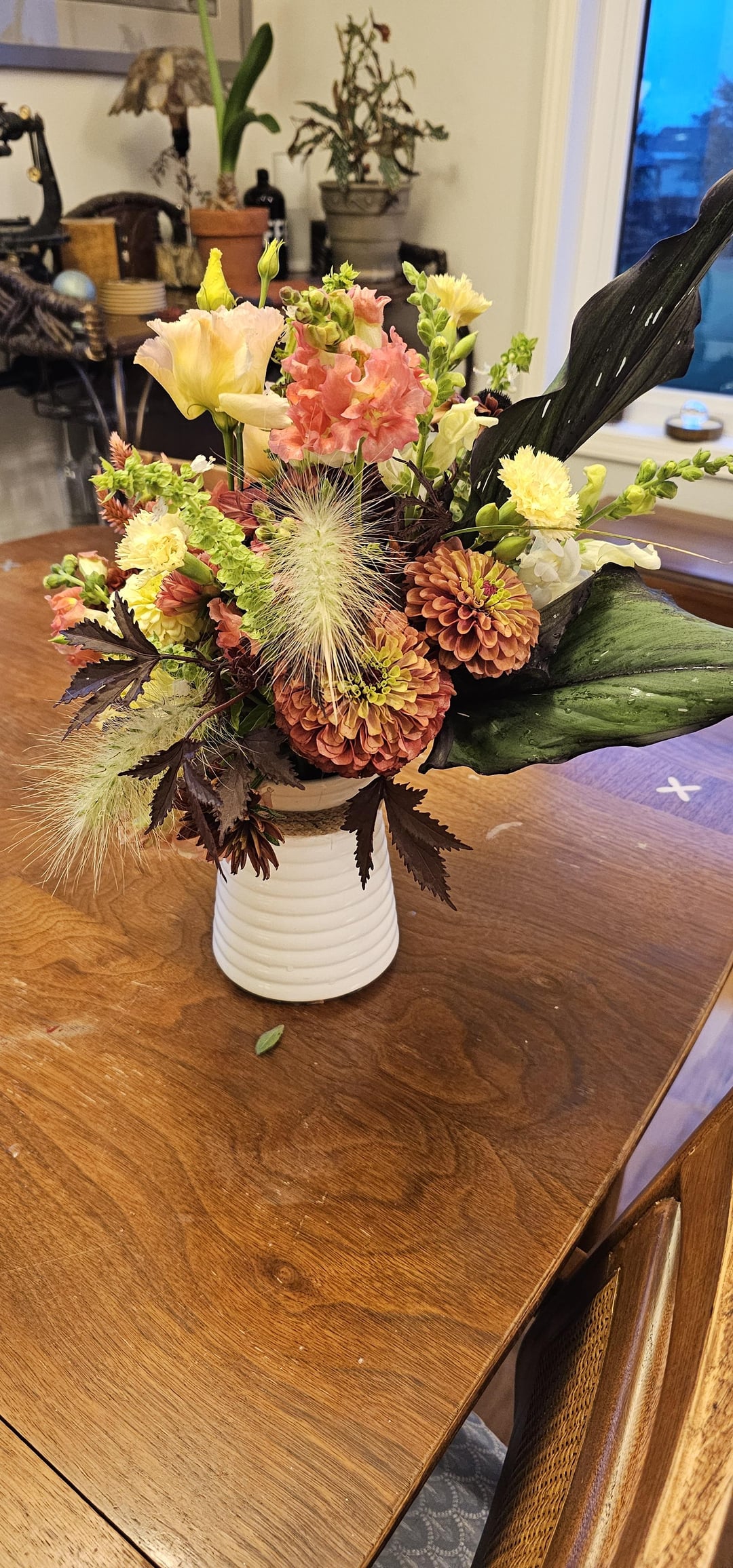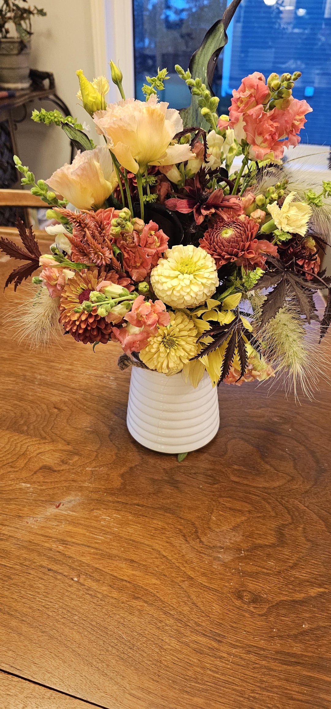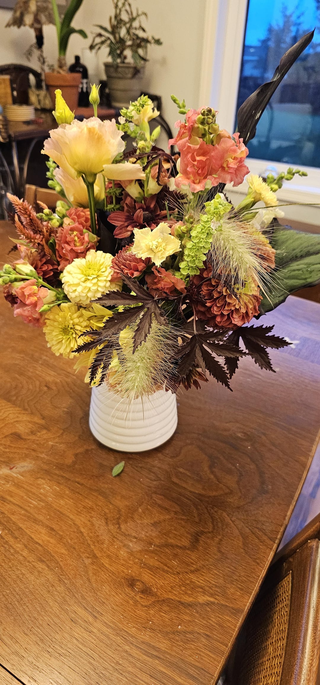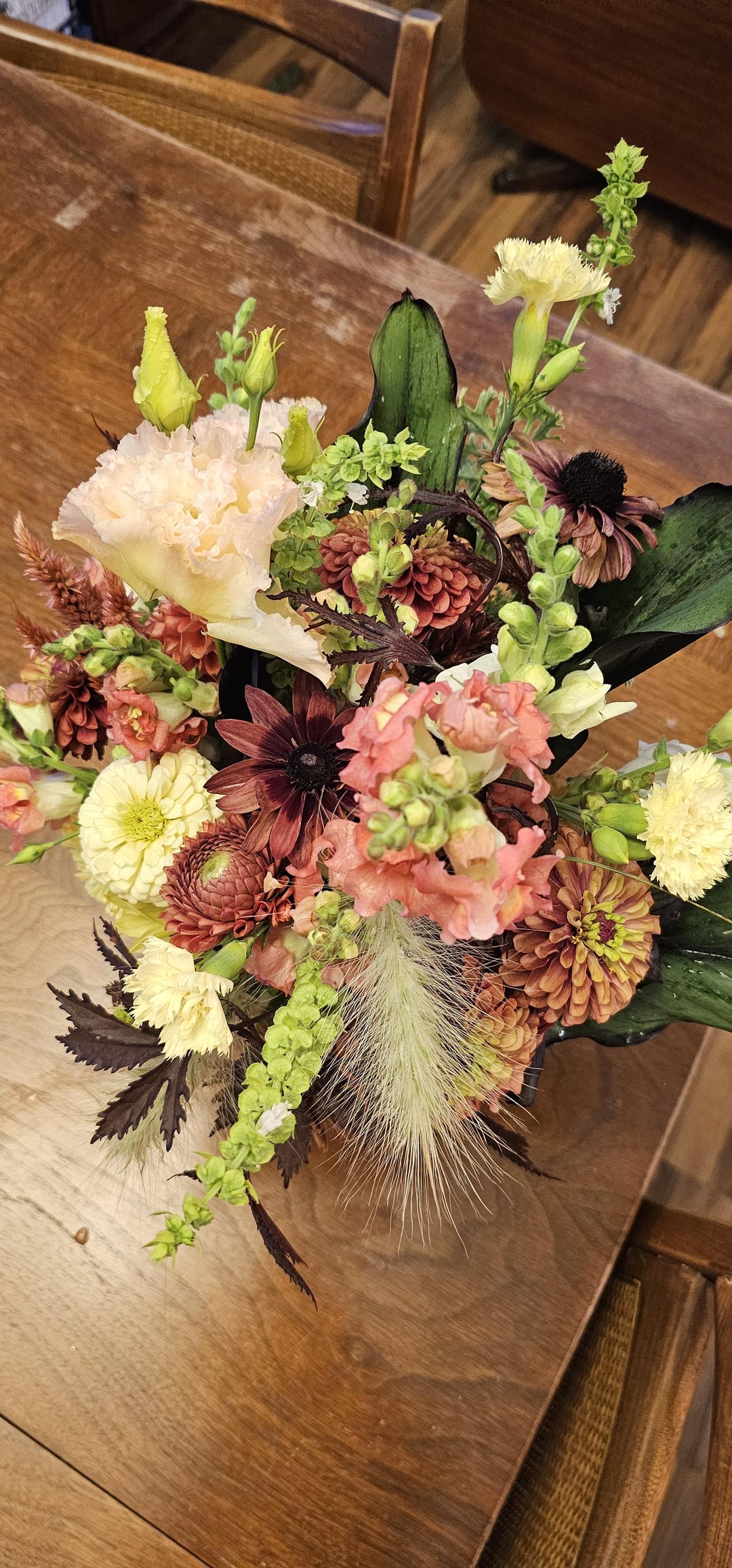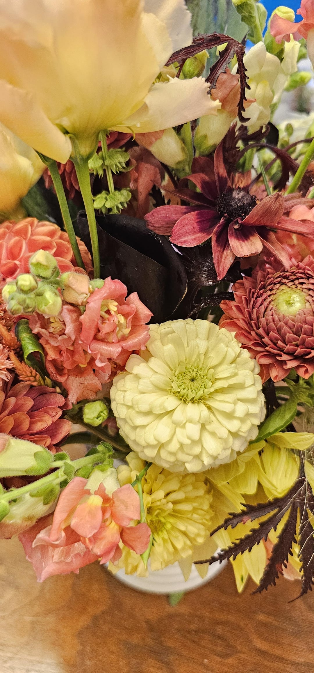 私の庭から友人に贈る花束。彼女はワインとクリーム色を希望していました。残念ながら、ワイン色のダリアはウイルスに感染していたため、準備ができませんでした。即興で作らなければなりませんでした。また、私の花を支える通常のフィルターは雨で壊れてしまいました。これは学習の練習になりました。そして今…. コルチゾンクリームの層