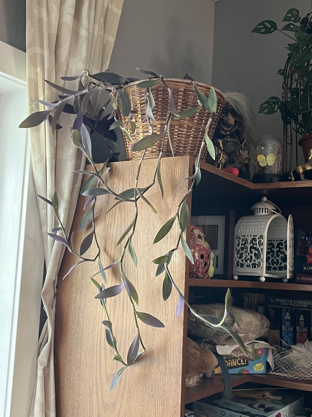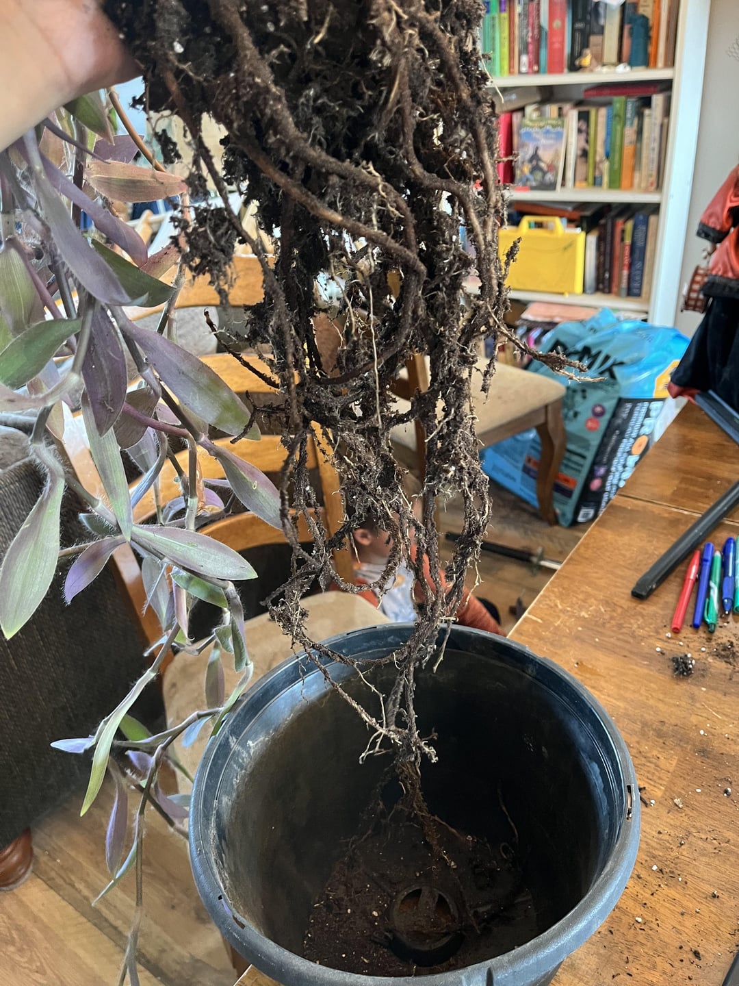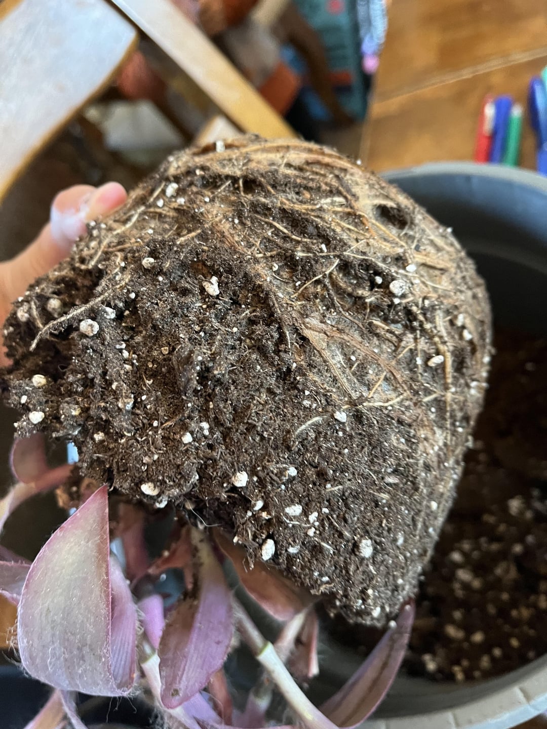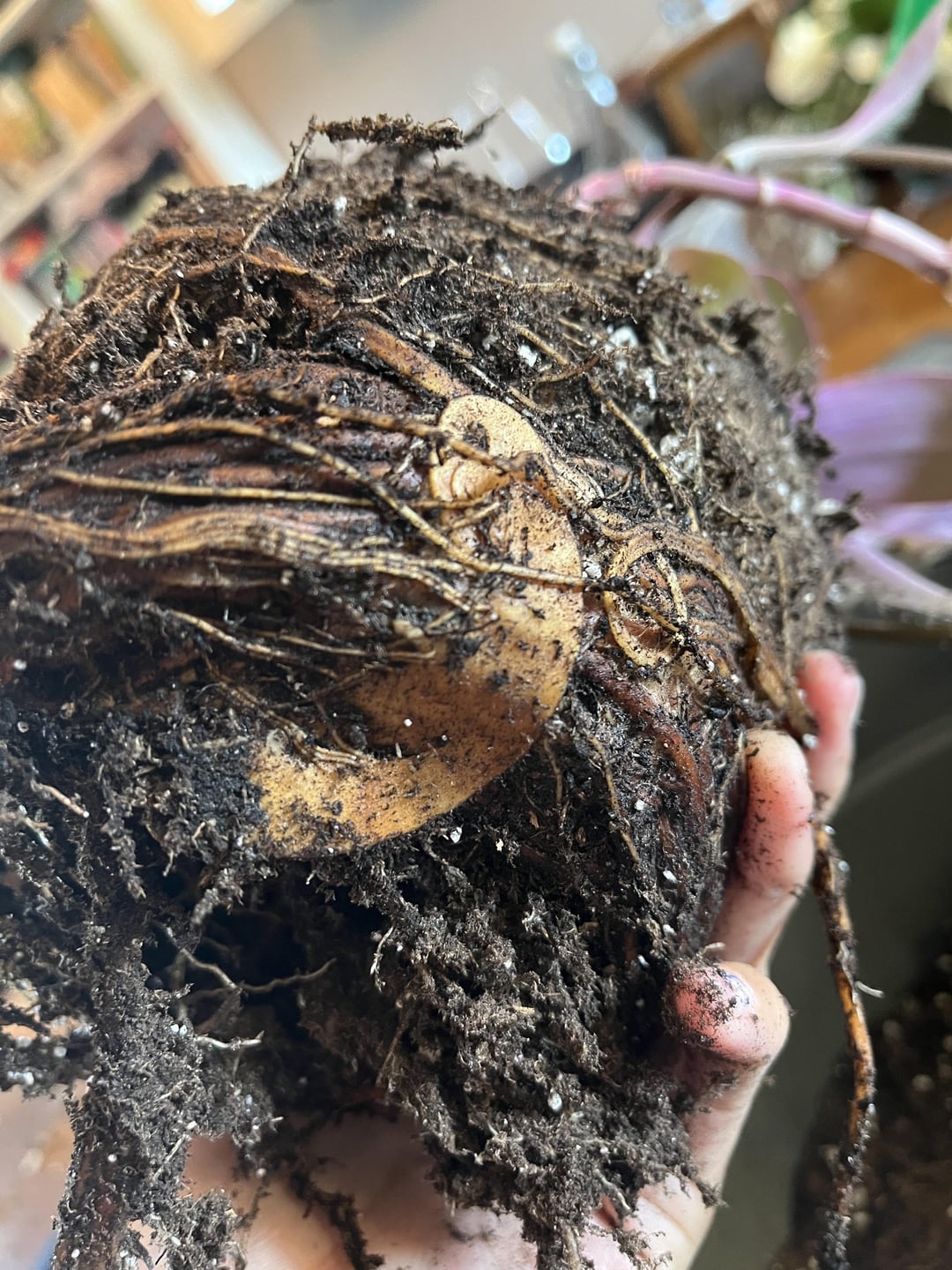 これにはちょっとびっくりです。この植物はシーズンの初めに植え替えたと思っていましたが、遅くとも昨年は植え替えていたはずです。ドレッサーの上に別の植物を置く場所を作るために、吊り鉢に植え替えました。また、写真 2 の平たいものを見たことがある人はいますか。最初は古い葉か何かだと思いました。根系の一部なのでしょうか。