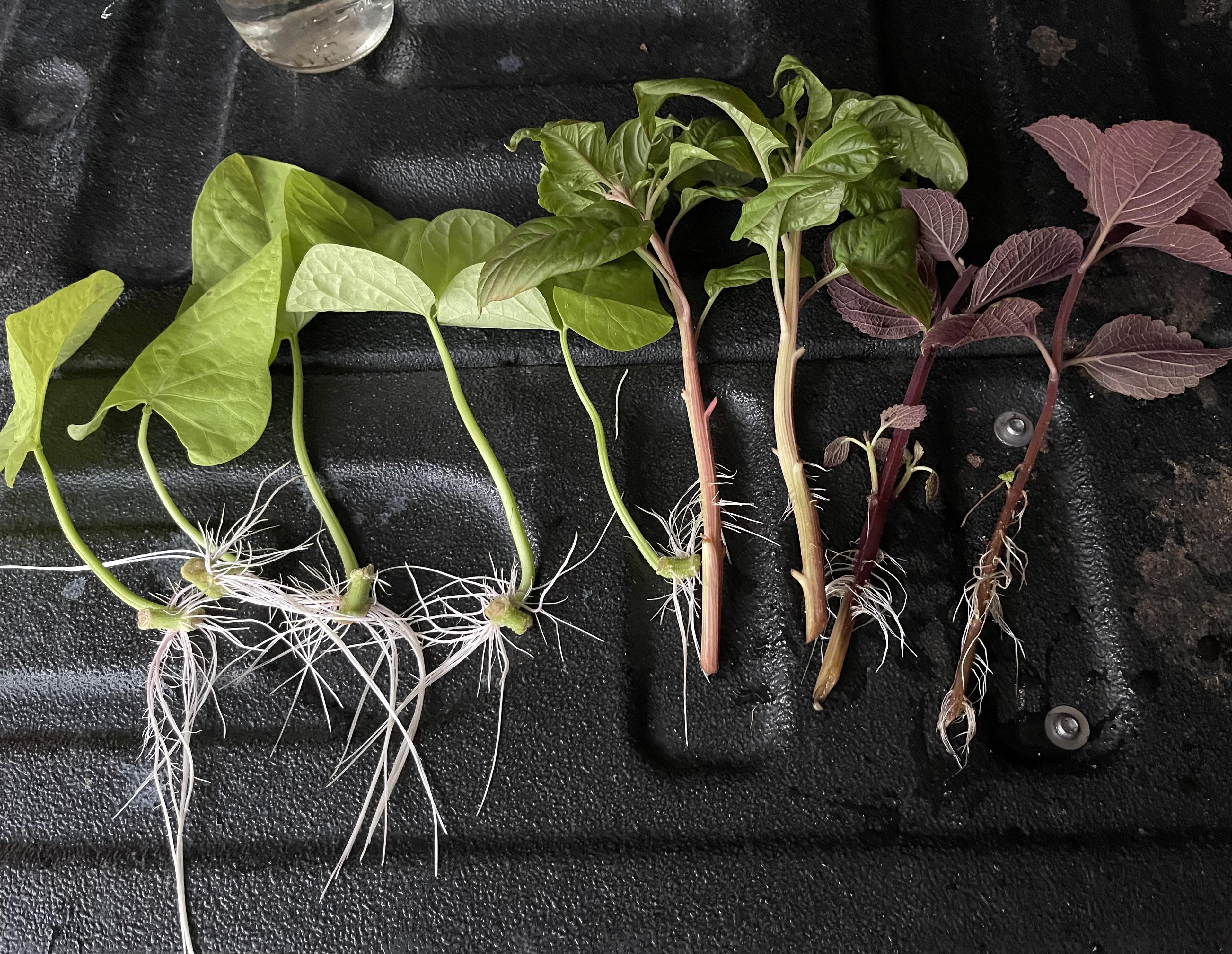サツマイモのつる、ケイトウ、コリウス。ローズマリーも育てていますが、時間がかかります。