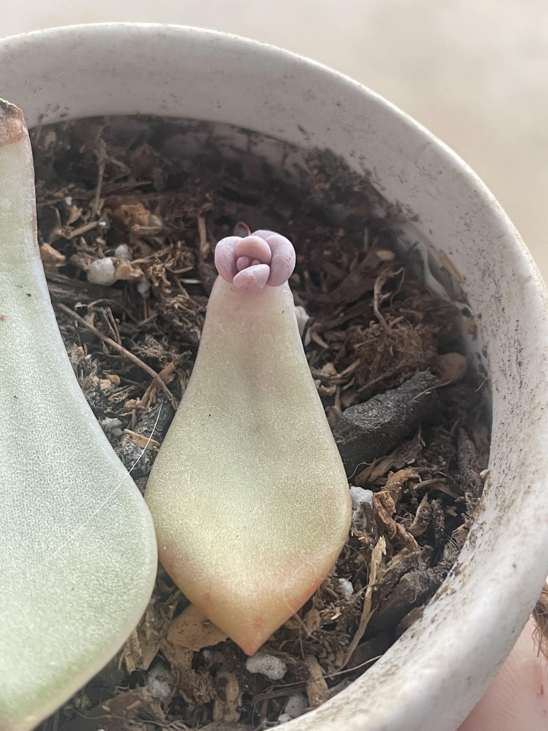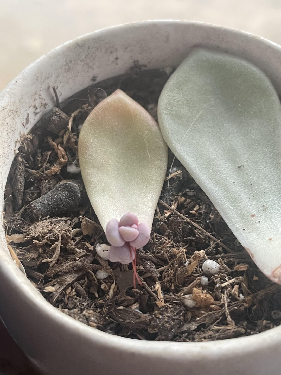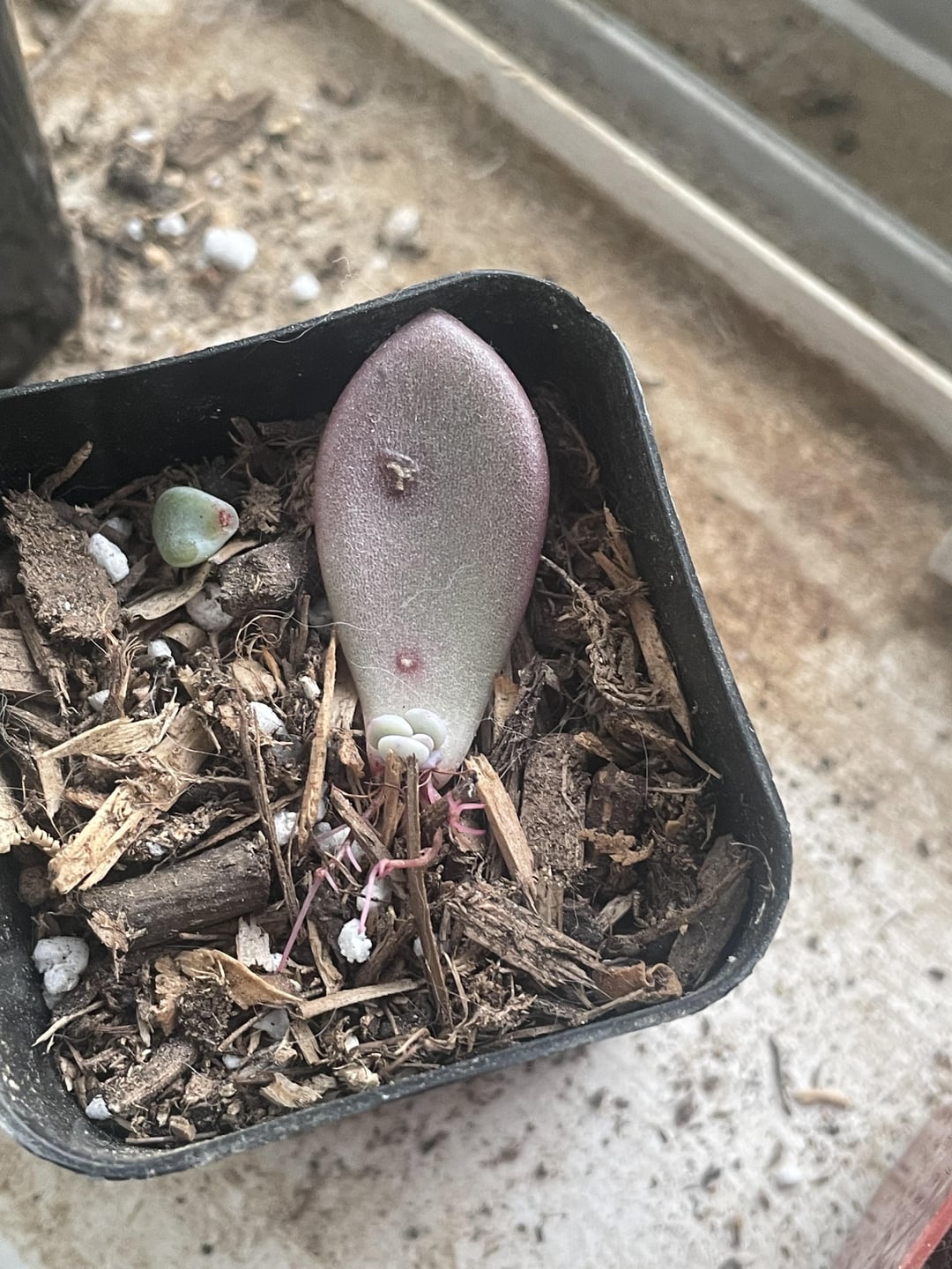 最初にクリスマスの日にこれらの葉を取り除きましたが、約3週間後に根が出始めました。 示されている最初の葉が最初に成長し、根よりも先に葉が成長し、最も大きく成長しました。 2週間経っても大きくなりません。 2つ目は次に始めて、先月葉が成長し始めたばかりです。 あちらの根は上向きに成長しています。 3 番目の根は最後に始まり、成長が最も遅いです。こちらの根は前方に伸びているのではなく、まっすぐ下に伸びています。