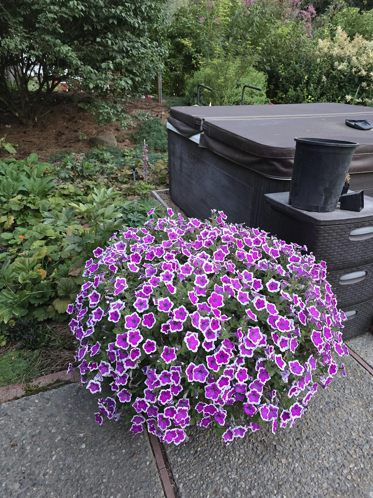 今年の春先に注文したフープラ ペチュニアが届きました。色も白い縁取りも気に入らなかったので、見えないところに鉢植えにしました… でも、すごい成長でした!