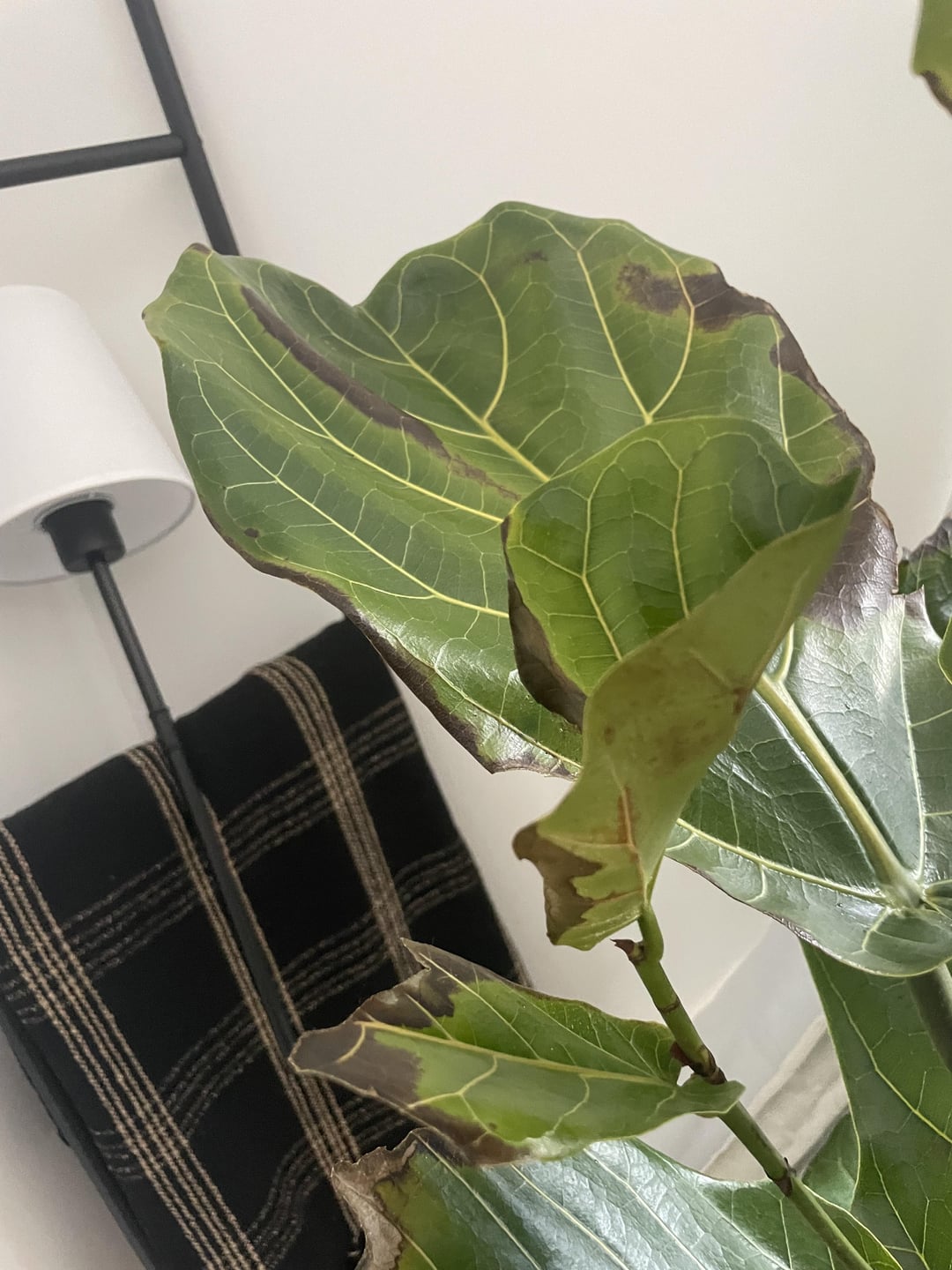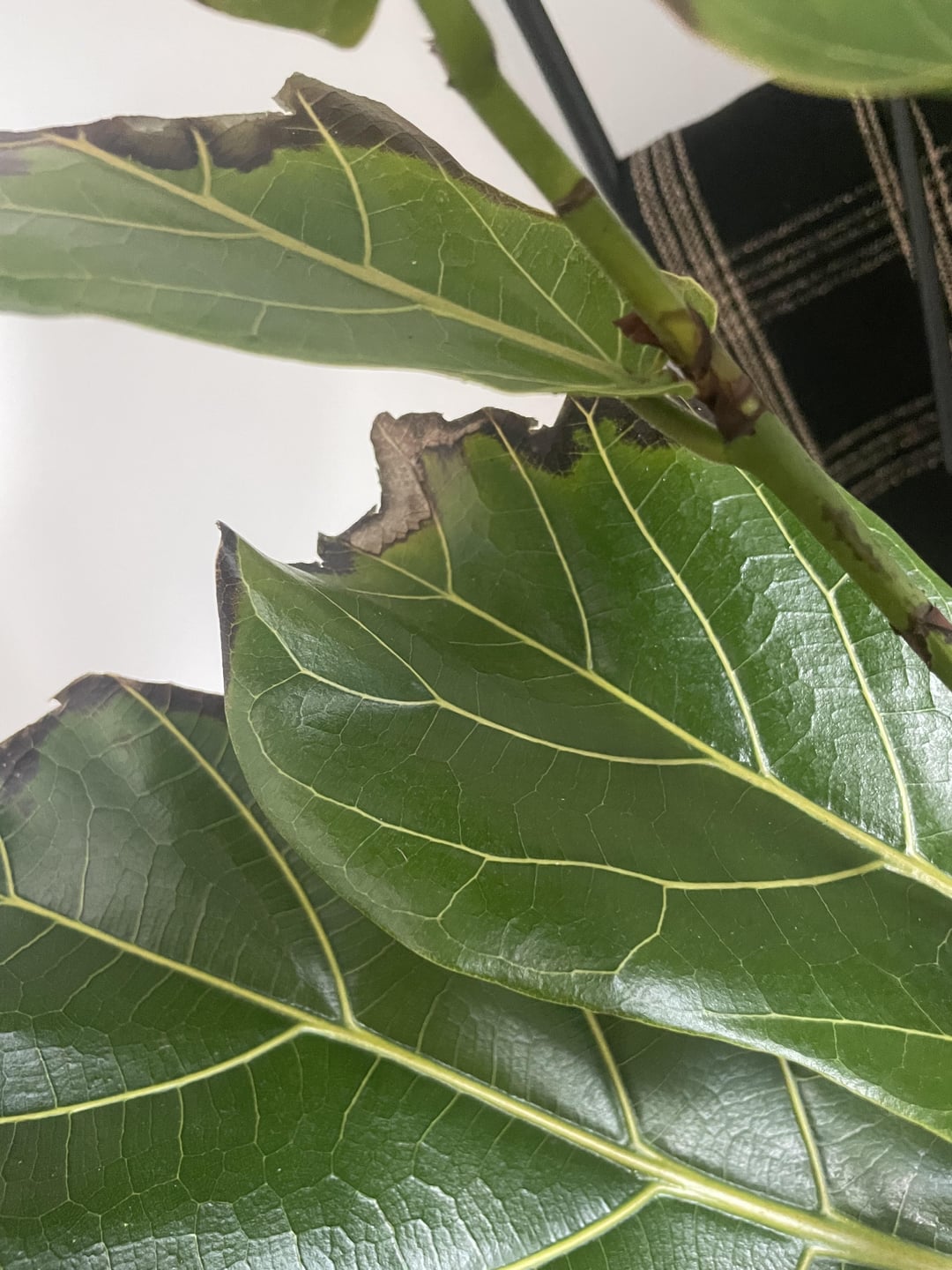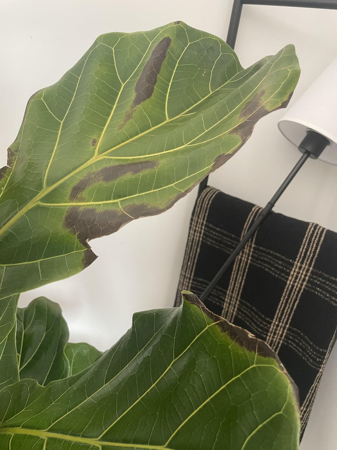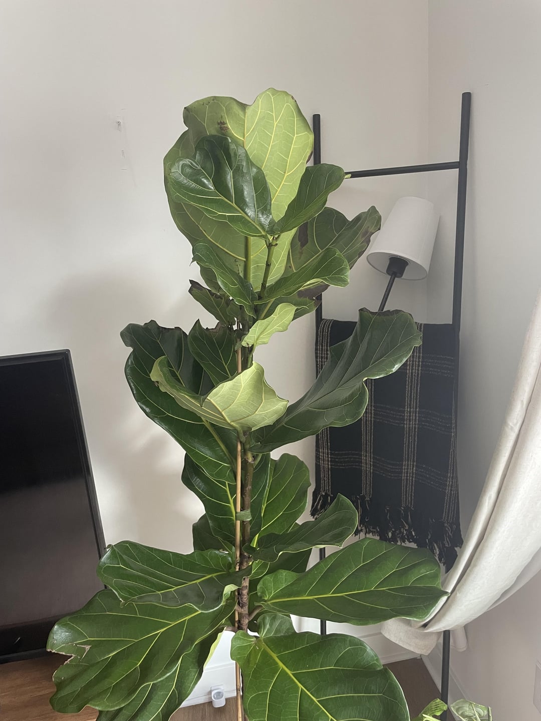 こんにちは!数か月前、私は植物を初めて育てるのですが(今では植物を何百万本も育てていて、植物に夢中になっています)、この5フィートのFLFをプレゼントされました。これは日焼けなのでしょうか?私の採光スペースはそれほど良くありませんが、これに気づくまで数日間窓のすぐそばに置いていました。あまり広がっていませんが、いくつか切り取りました。下の葉は大丈夫なので、根腐れは疑っていません。脱水症状かと思いましたが、土壌測定器を使用して、根系が乾燥しているときだけ水をやっています。水やりのたびに(2週間くらい、もう少し間隔を空けるかもしれません)、FLF Plant ResourceのFLF植物用肥料で肥料を与えています。また、土壌にニームオイルを塗ったり、葉を拭いたりするためにも使用しています。
