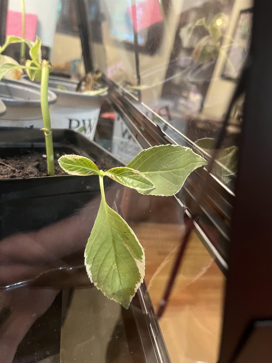 斑入りのアジサイの挿し木を増やそうとしています。3 週間ほど経ちましたが、葉がピンク色に染まっていることに気づきました。挿し木ごとに、一番上の葉にピンク色が現れます。なぜかわかりますか? できれば保存しておきたいです!