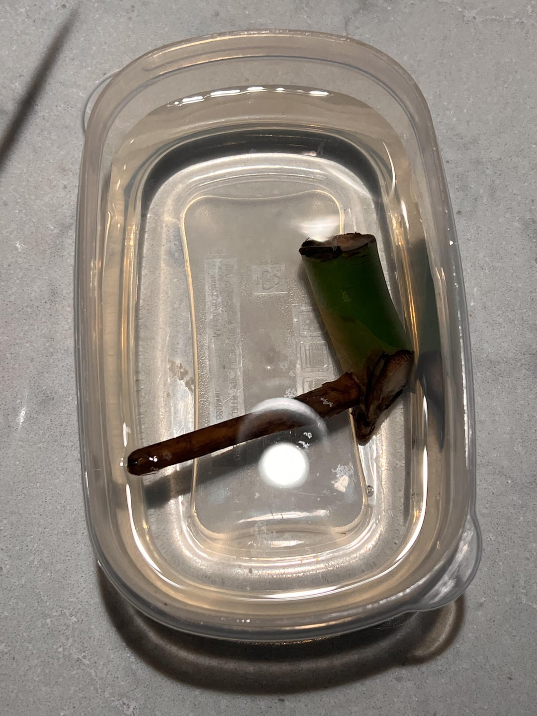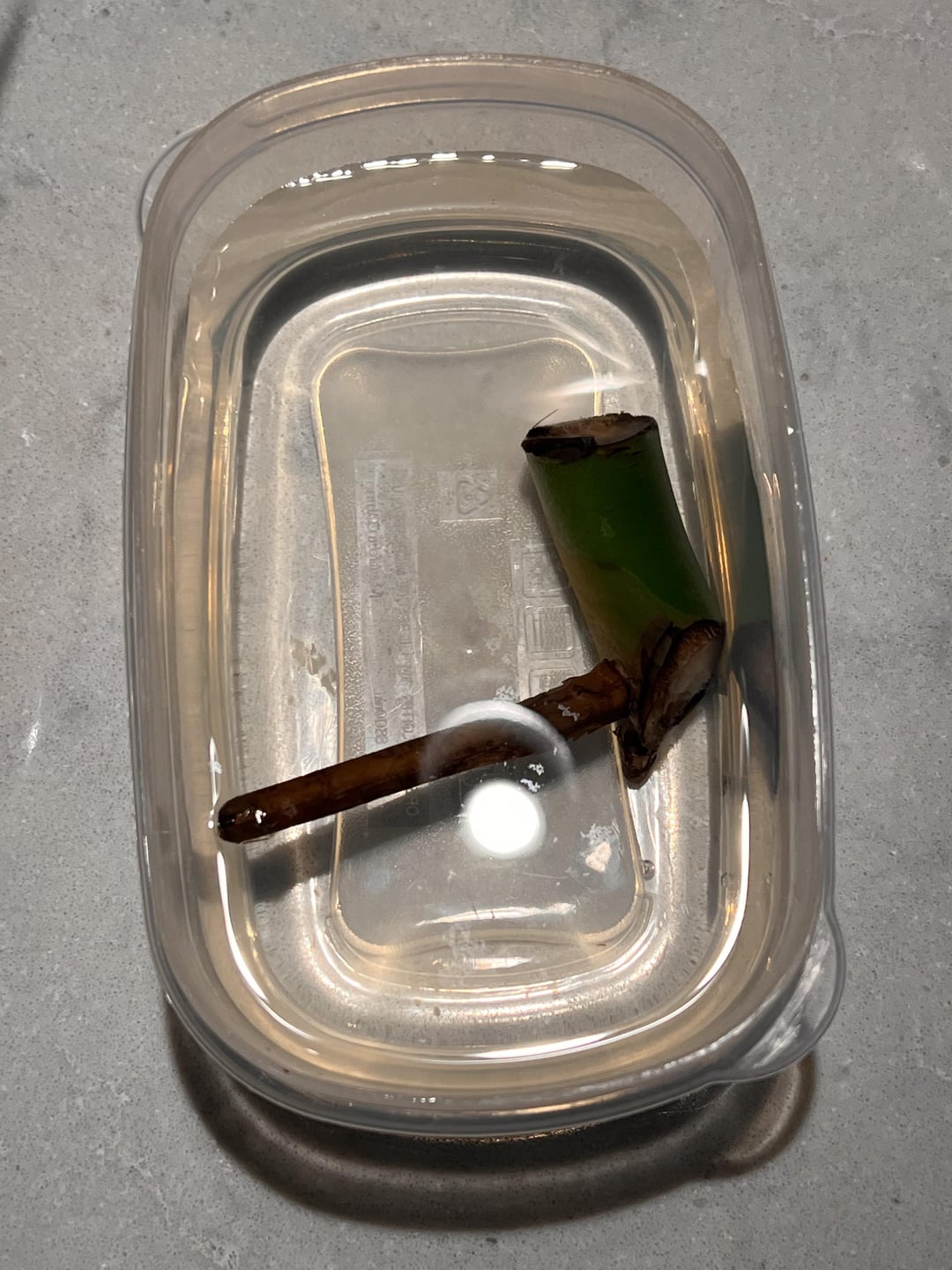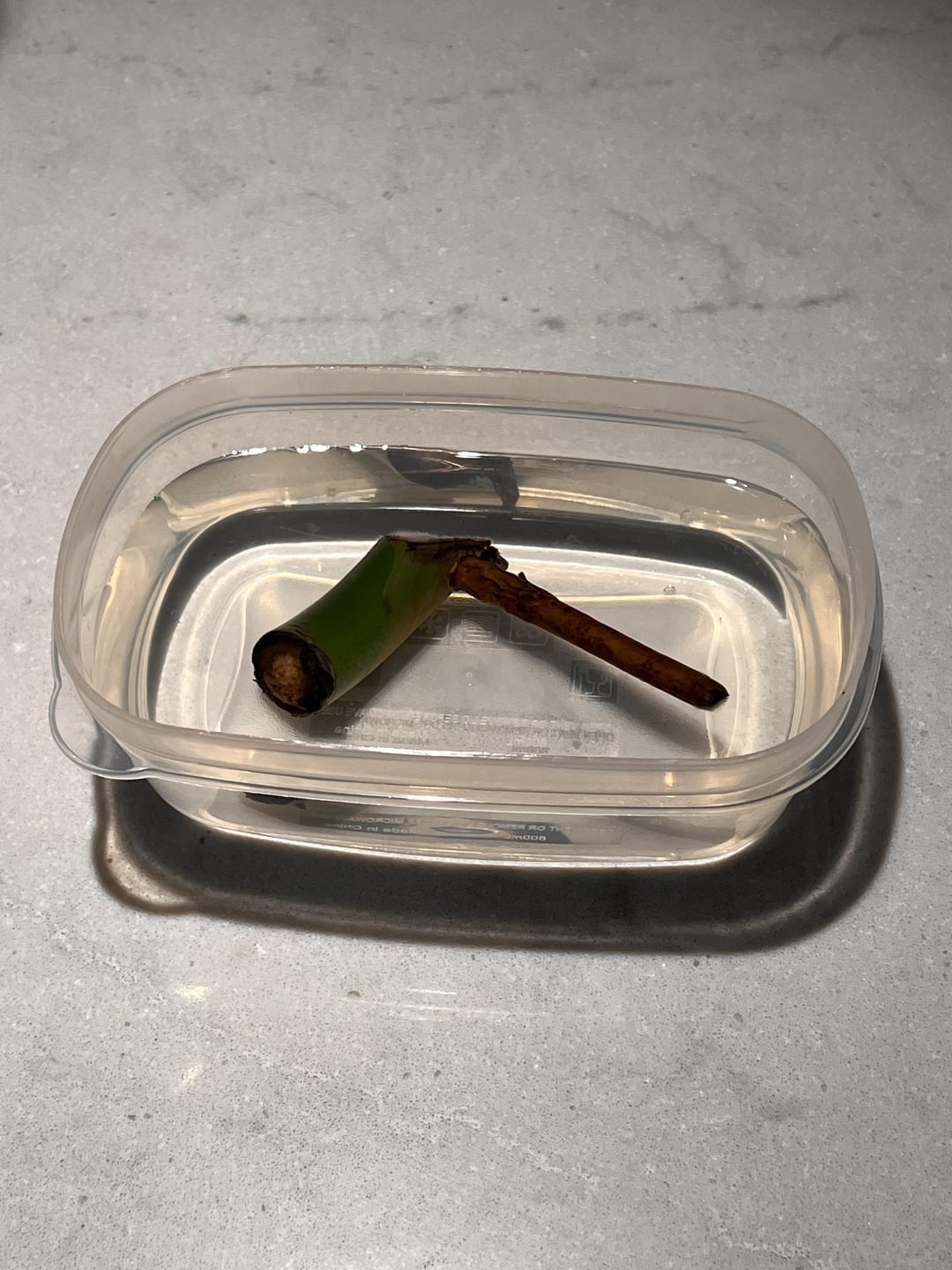 妹からこのモンステラの挿し木をもらったのですが、枯らしたくないのです。まっすぐな部分(シュート/根/ものの反対側)が妹が切り取ったところです。