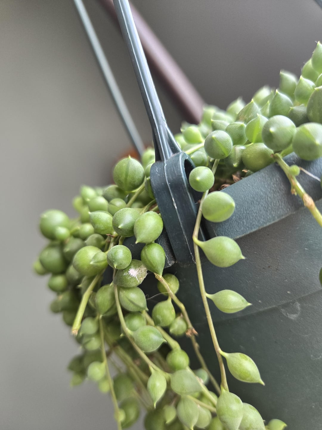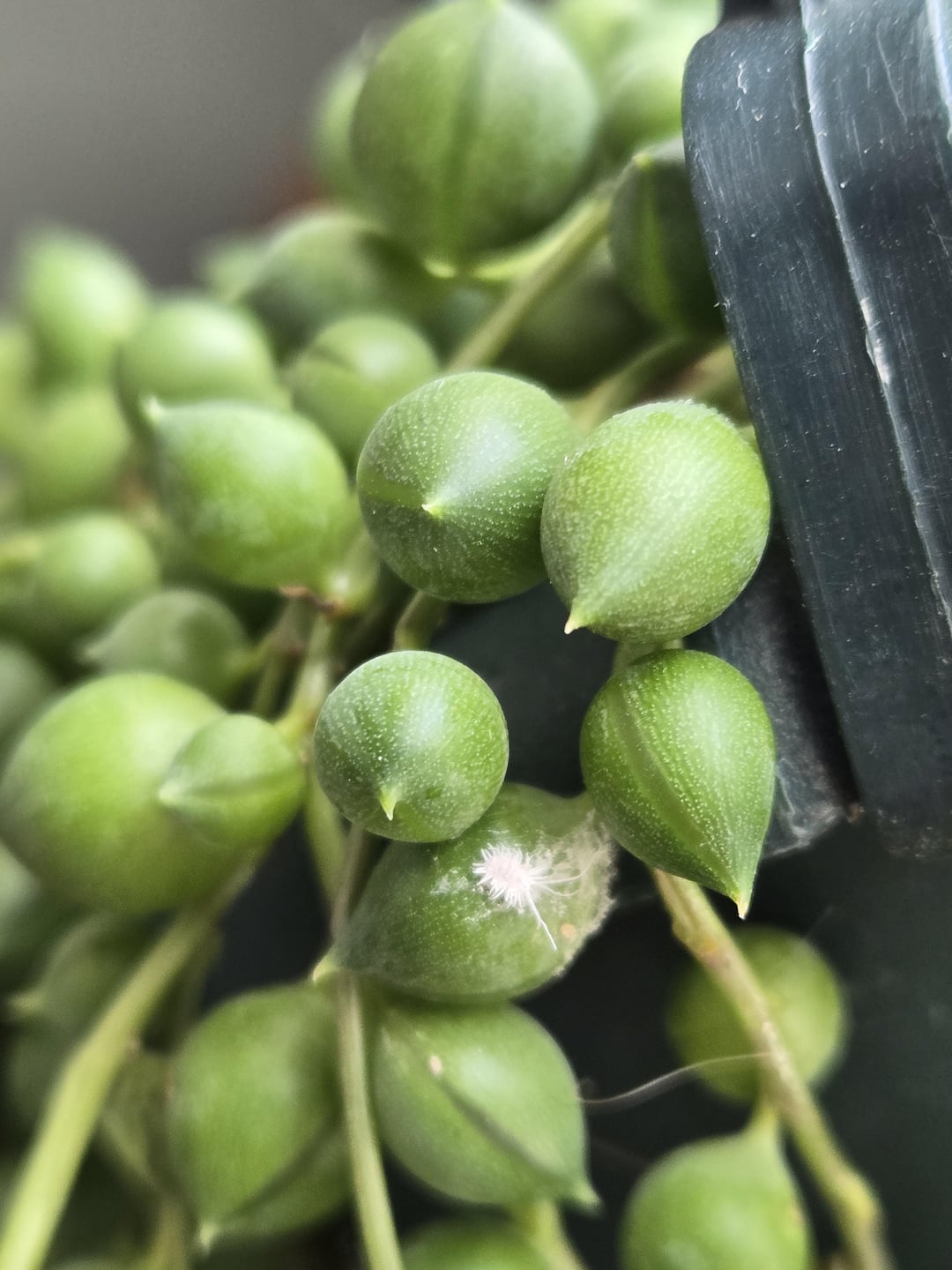 植物の上部には少しクモの巣があり、真珠の間には粘着性のある綿毛のような斑点がいくつかありました。