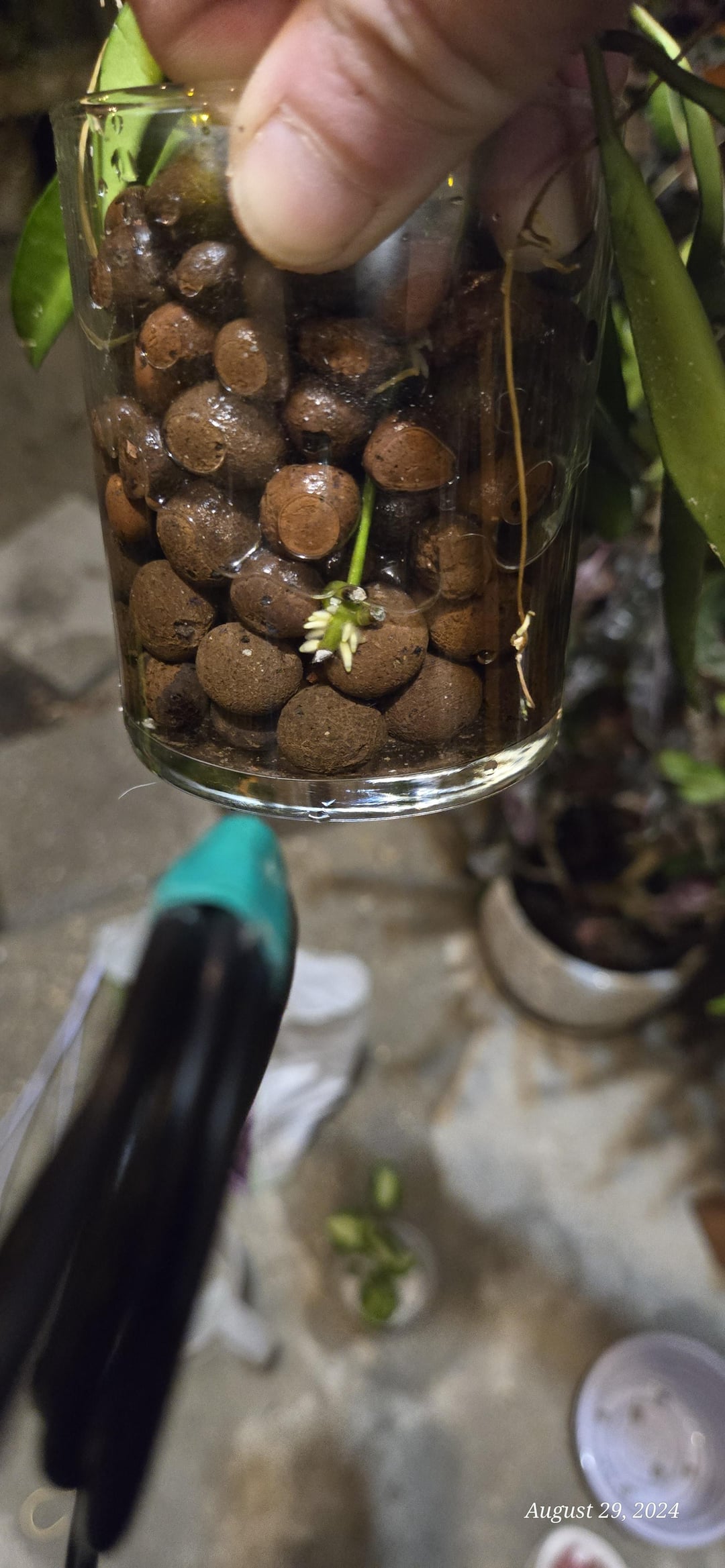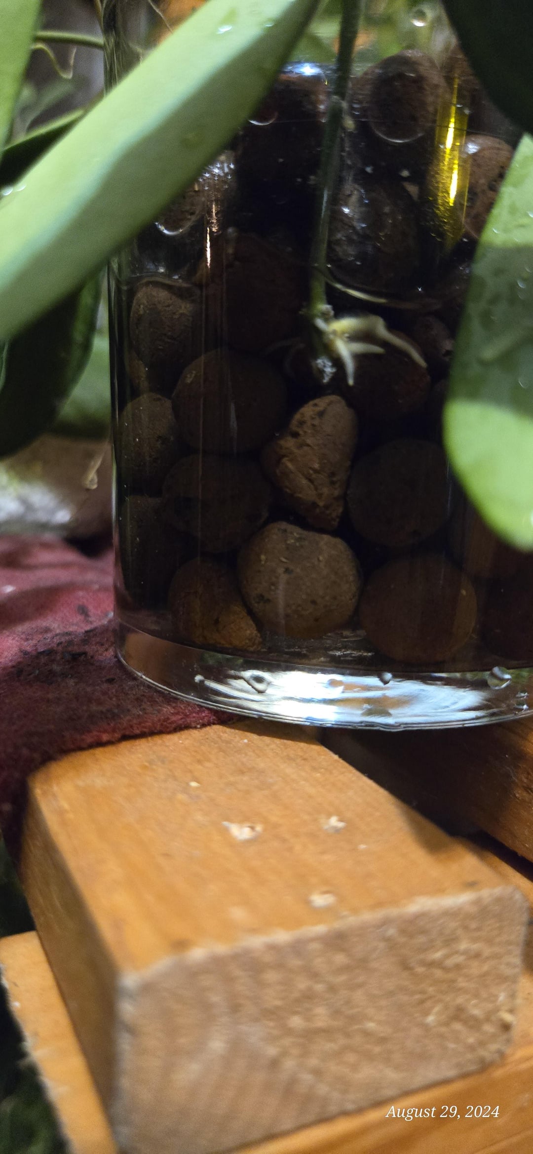 私の植物は根腐れを起こしていたので、最も健康な節の近くで切り取って水に挿したところ、これが出てきました。根かどうかはわかりませんが、根のように見えますが、少しぼやけています。ホヤにこのような根があるとは知りませんでした。