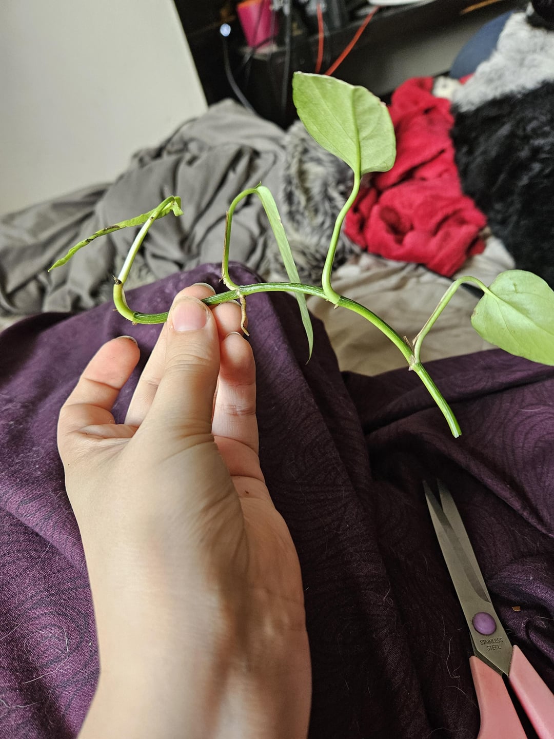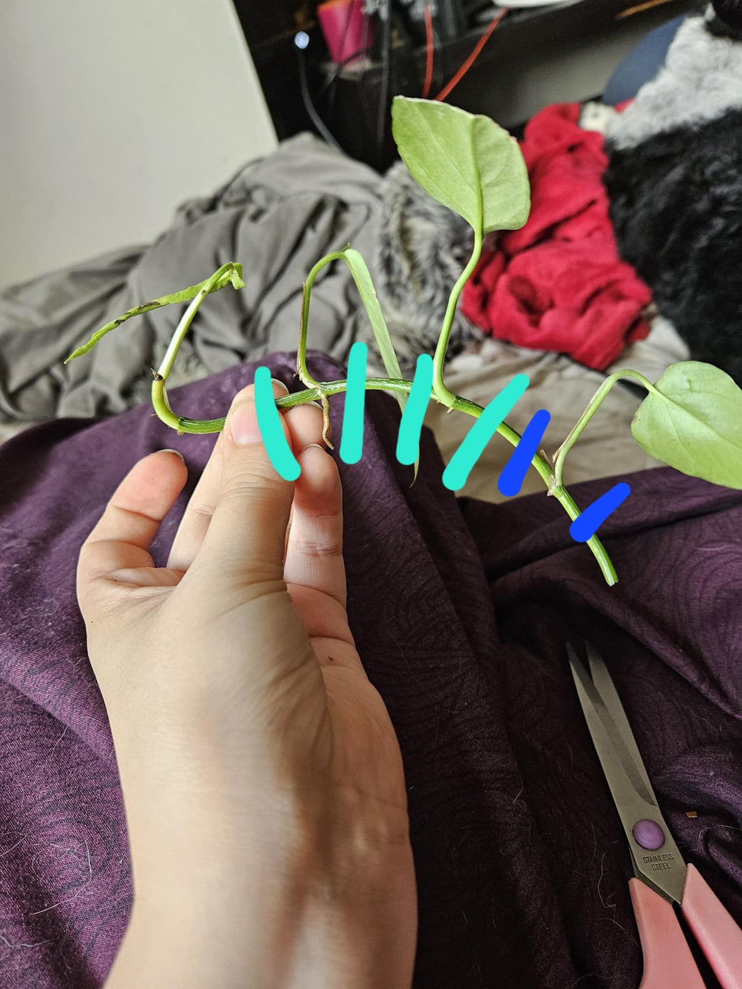 この植物が何なのか、100% 確信はありません。でも、私のガールフレンドがこれを育てていて、私も自分で育てたいと思っています。濡れた棒を使ったほうがいいのでしょうか、それとも節に近い方の端を切って水に挿したほうがいいのでしょうか? 2 枚目の写真は、濡れた棒を切るべきだと思うところです。節が真ん中にあるようにするためでしょうか? それとも間違っているのでしょうか?