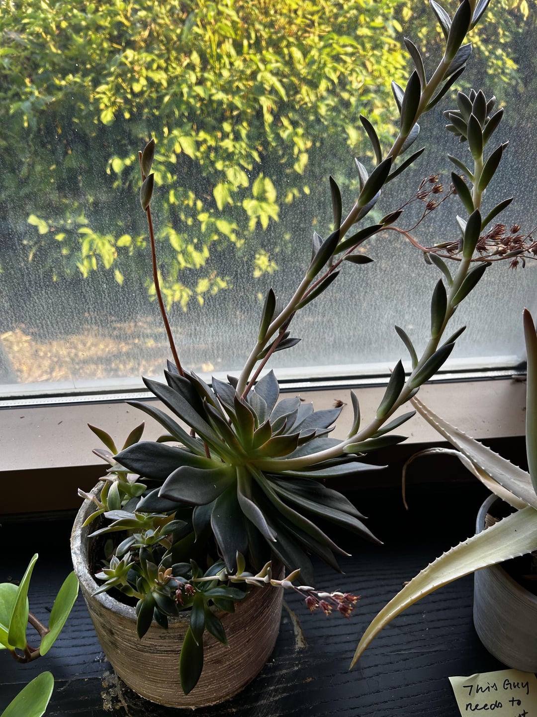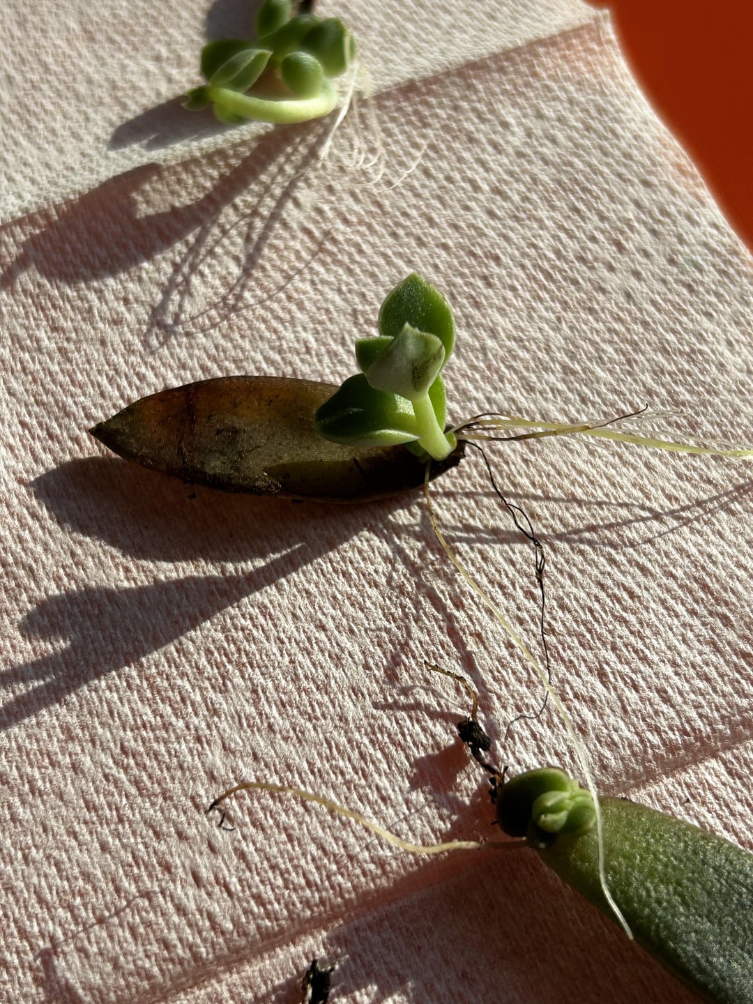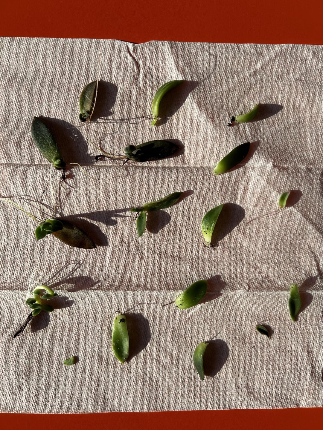 ひどく水をやりすぎたアロエベラをチェックしていたところ、たくさんの多肉植物の子株が鉢の底で根を張ろうとしていることに気付きました。