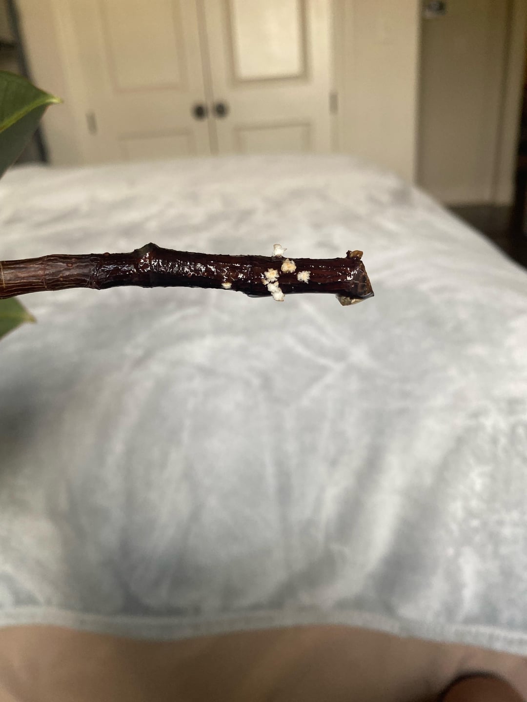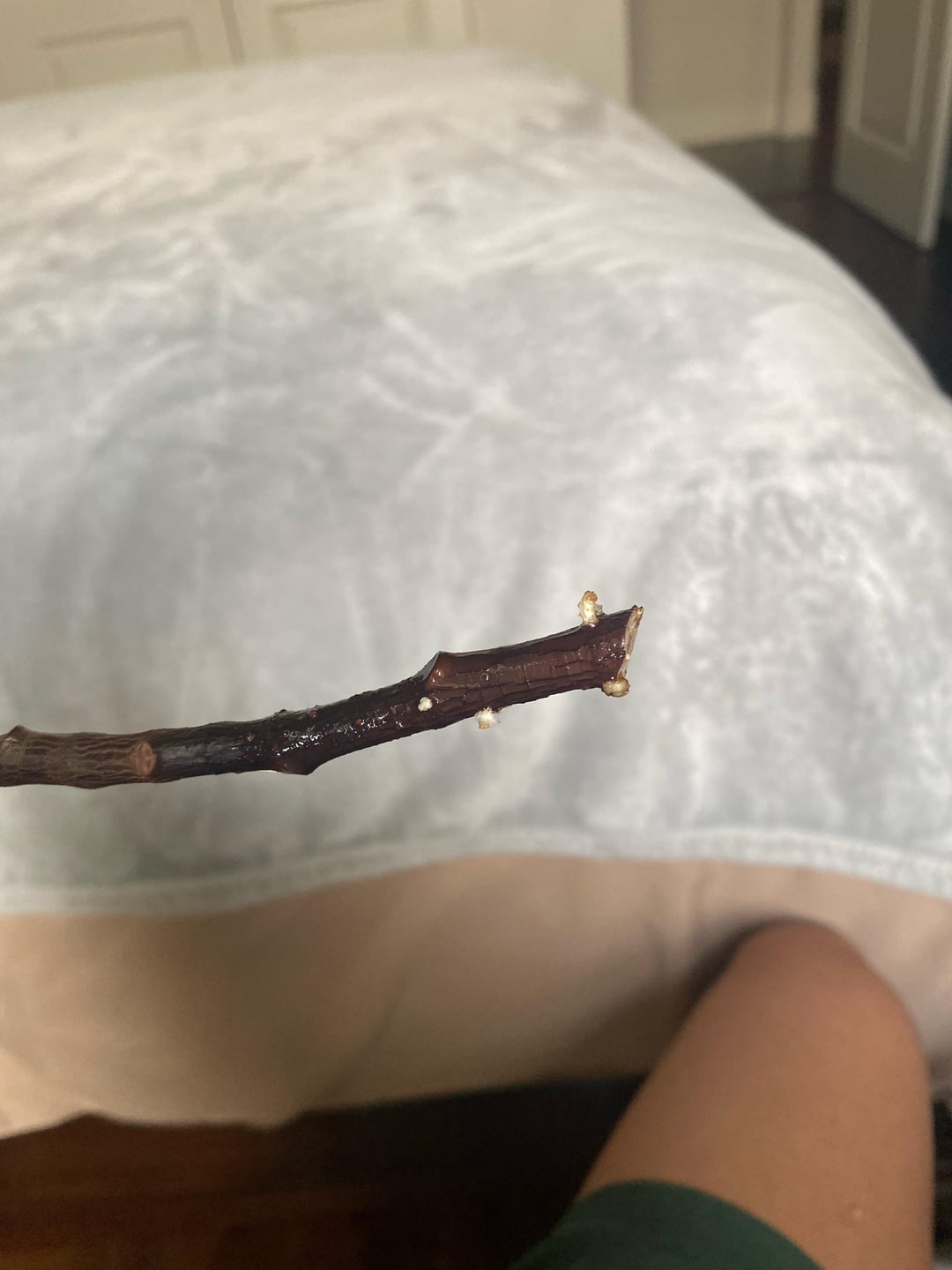 約 2 週間前に水に浸したのですが、小さな白い毛羽立ったものがついていて、先端が茶色くなっています。これは根でしょうか。腐らないようにするにはどうすればいいでしょうか。