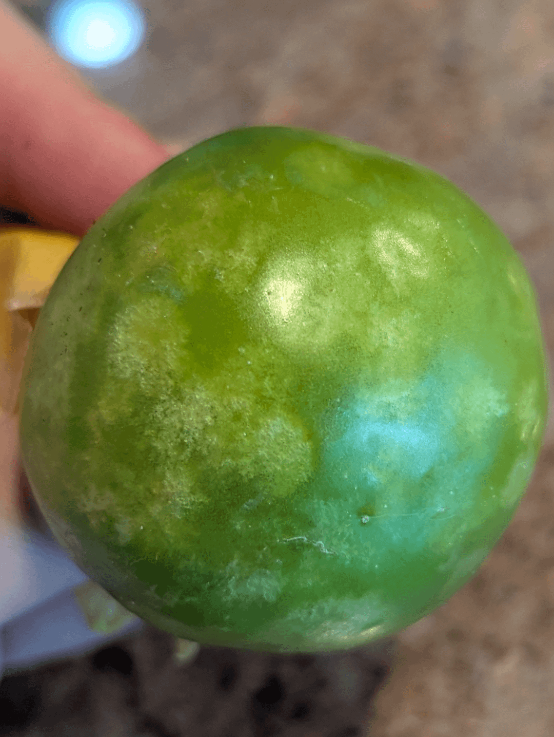 私のトマティーヨの果実の周りには白い斑点がいっぱいです。カメムシがたくさん飛んでいるのを見かけますが、これはカメムシの被害でしょうか? これらの果物は食べても安全でしょうか?