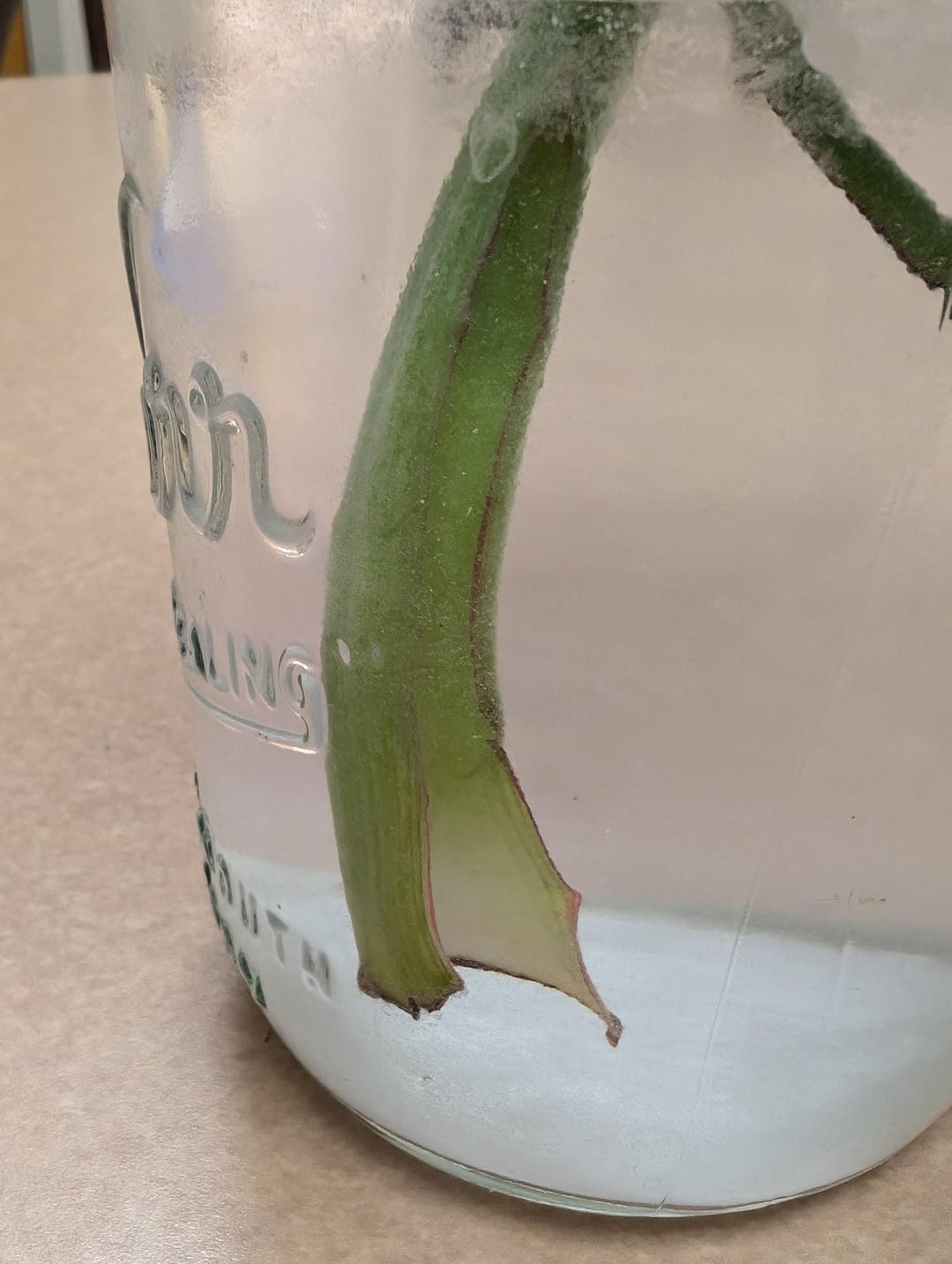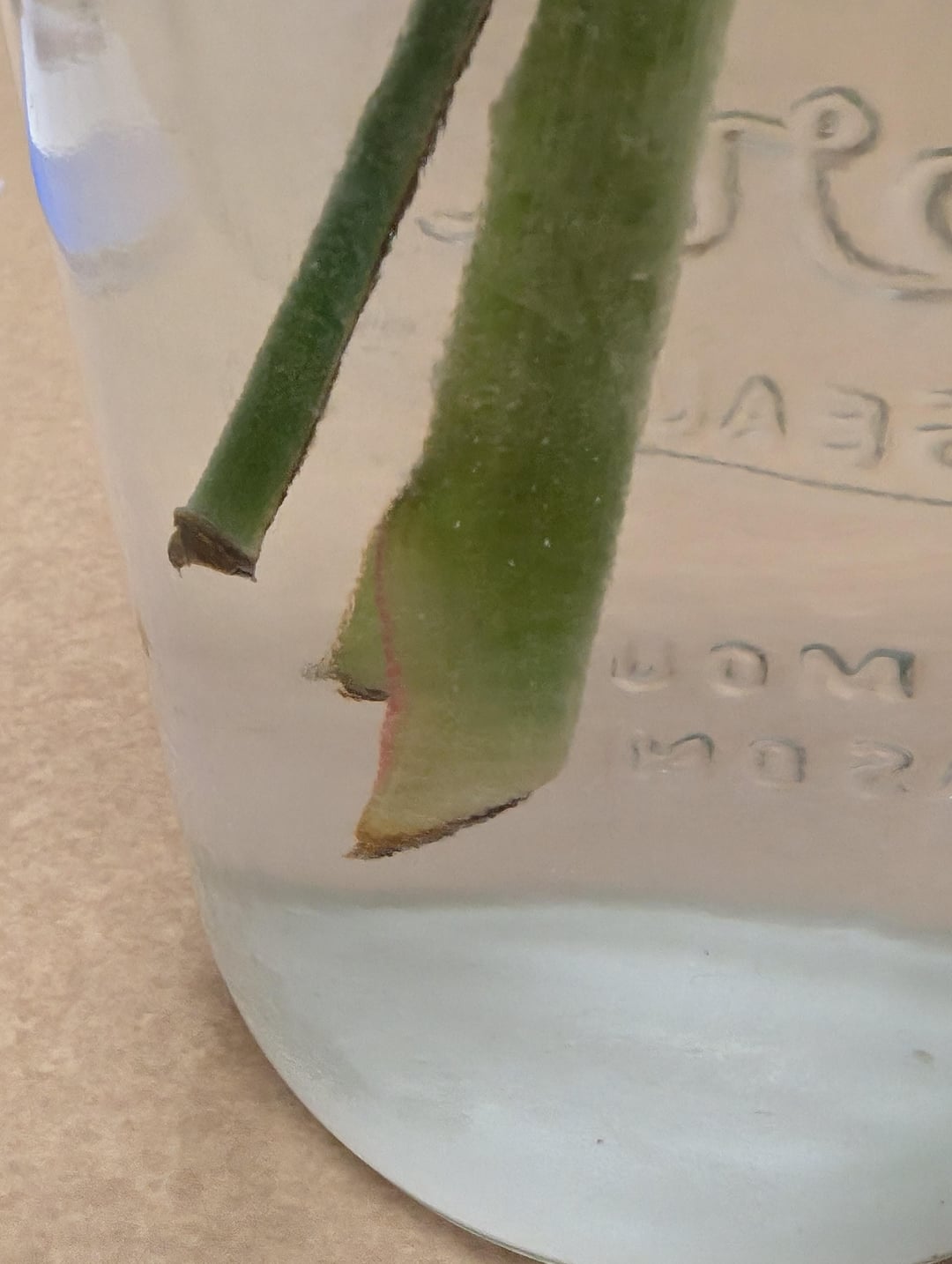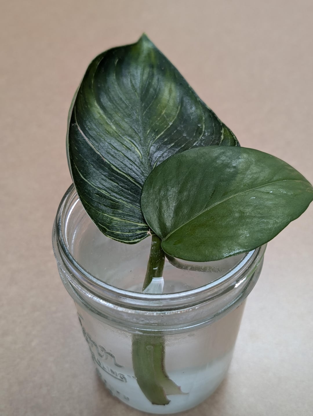 ポトスとフィロデンドロン バーキン。バーキンはホームデポで倒れて枯れかけていた植物から掘り起こしました。元気を回復させるために、発根ホルモンを混ぜた瓶に入れました。
