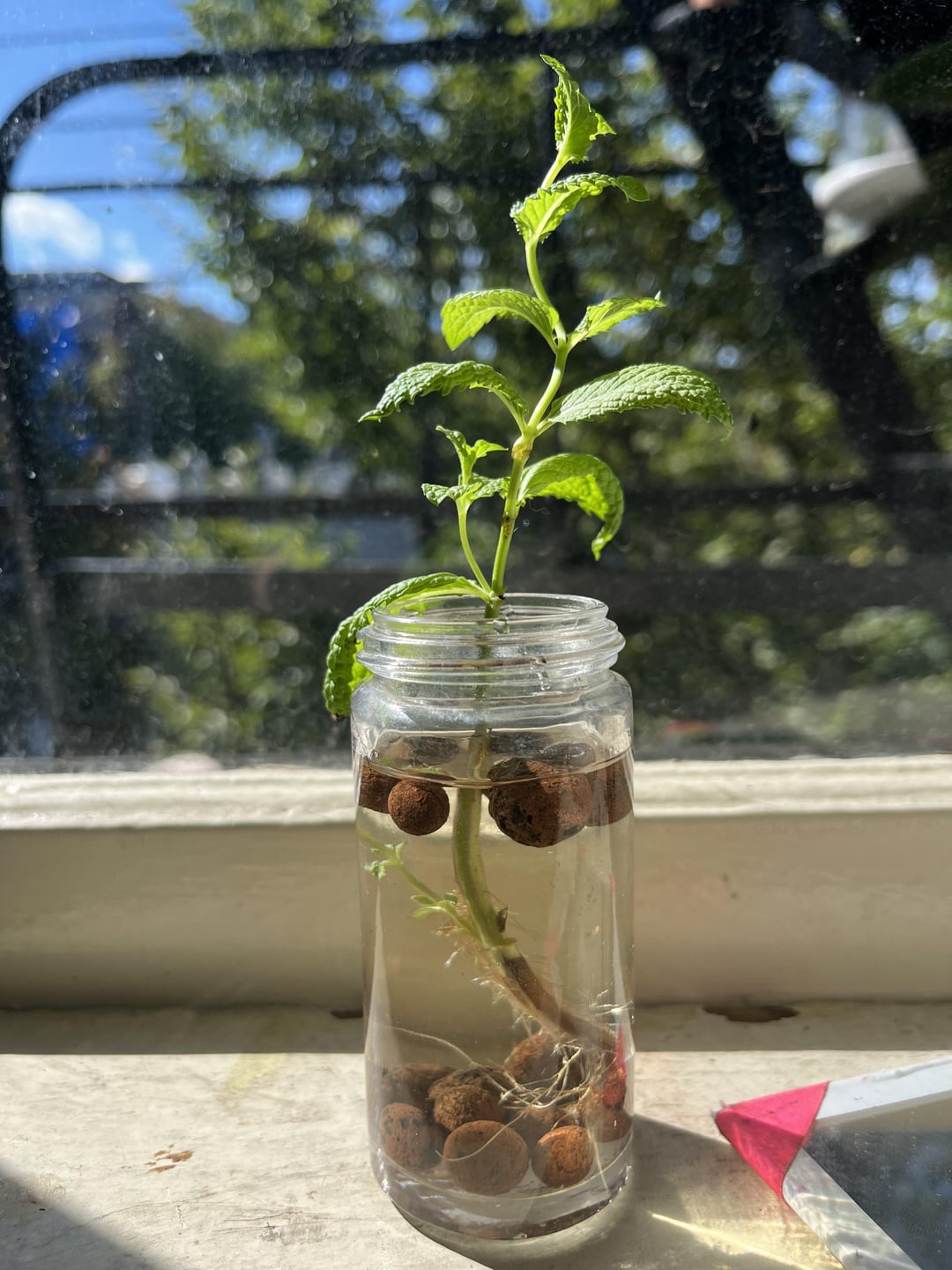 インスタグラムで、レストランでデザートにミントの葉が添えられていた女の子の投稿を見ました。彼女はそれを取って水に浸したら、見事にミントの葉が支えられたそうです!私が料理をしているレストランではミントの飾り付けをしているので、自分で確かめるために1枚持ち帰りました。ミントがいっぱい
