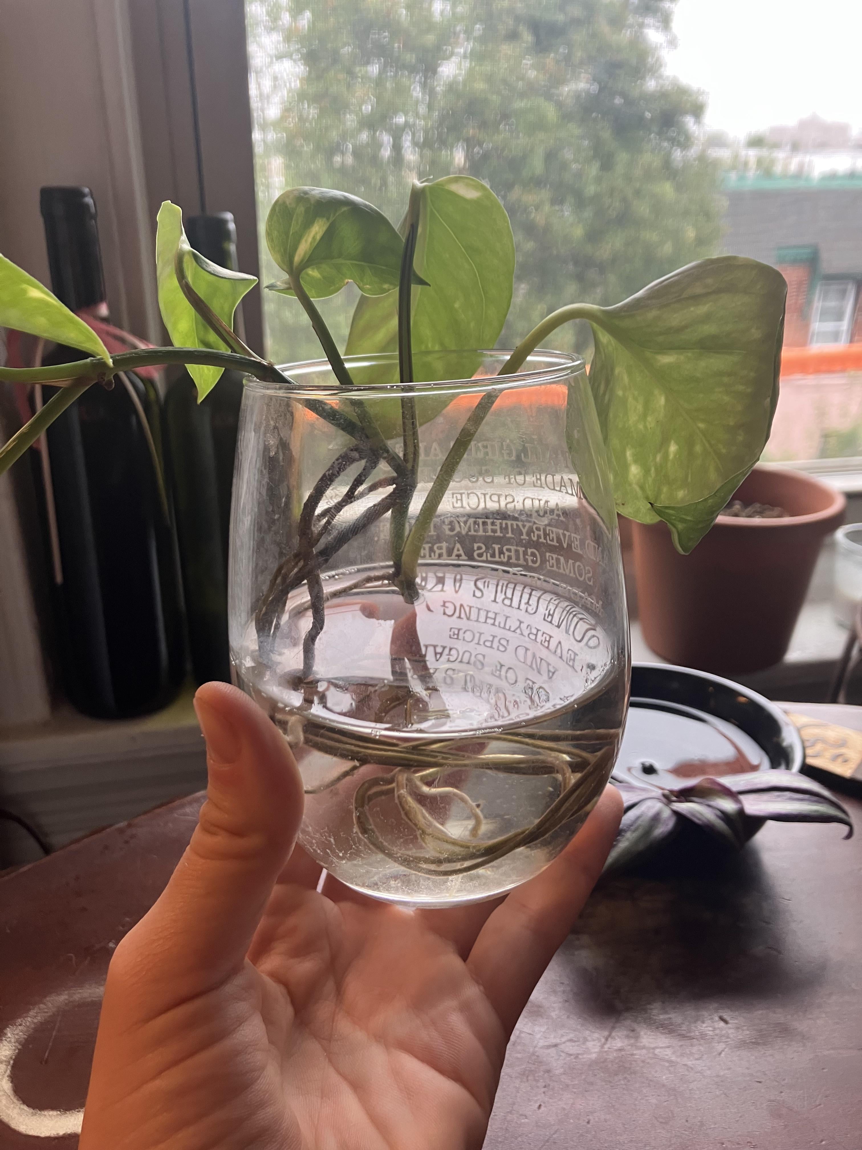 これはイケアで見つけた 2 枚の葉から始まりました。水に浸したら成長して根付きました。土に植え替えてもいいですか、それとも根が長くなりすぎたのでしょうか。根の先端だけが白いのはなぜかわかりません。