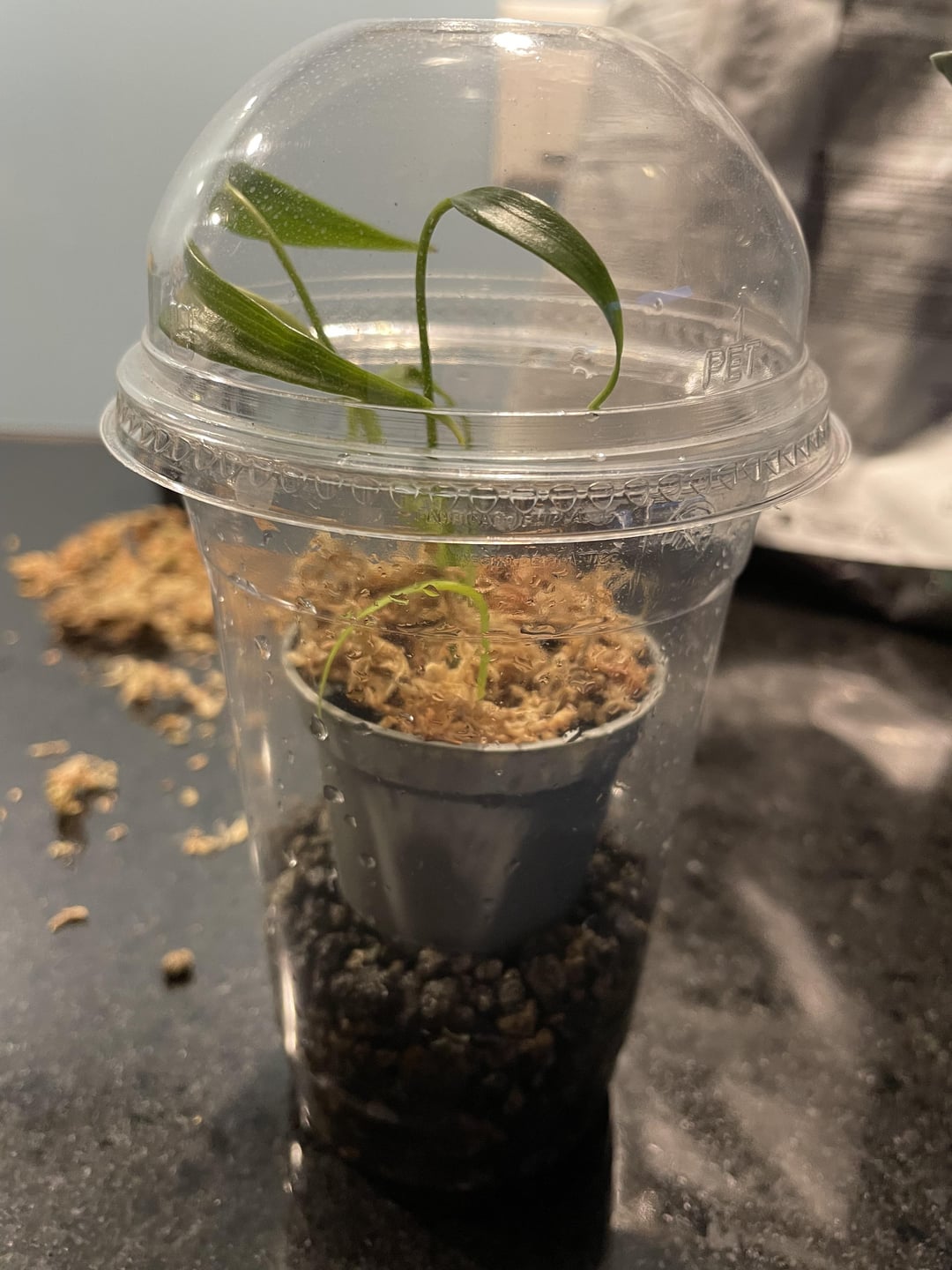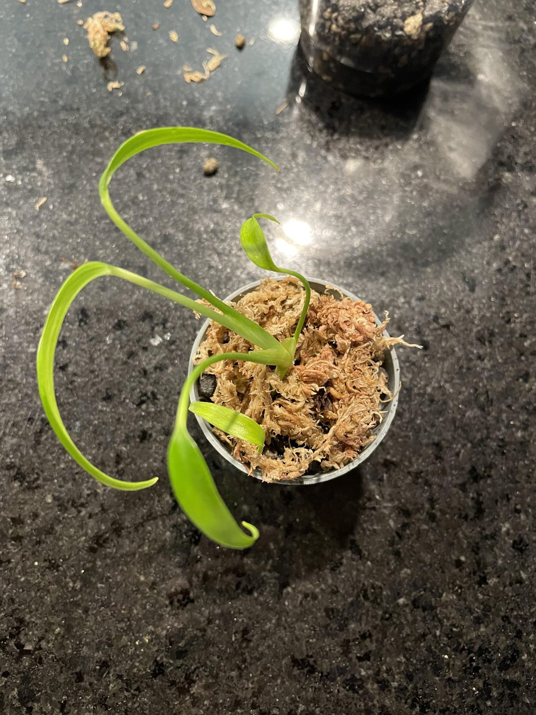 ミズゴケに植えて数週間後、少し大きめの鉢にレチューザポンを植えることにしました。湿気を保つためにミズゴケも敷きました。