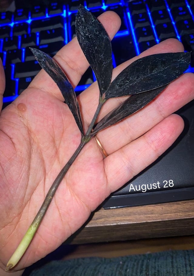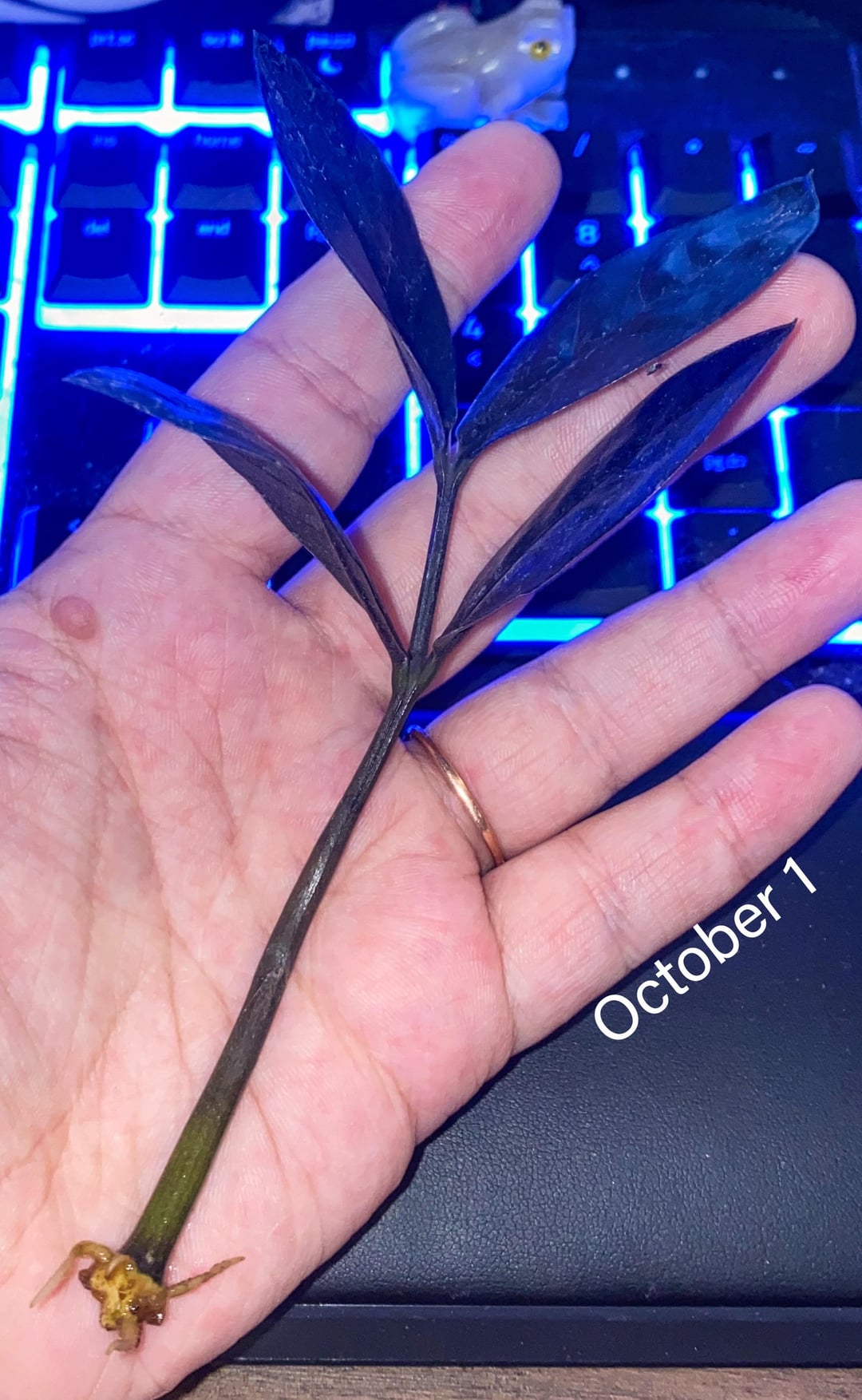 私の地元のウォルマートには、長い間腐って水浸しになっていたレイブンZZプラントがいくつかあったので、腐って鉢から落ちたこの小さな植物を喜んで家に持ち帰りました。端を切り取って、一晩机の上に忘れてしまいました(おっと)、ポトスの切り抜きを入れたかわいい花瓶に挿したところ、とてもうまくいきました。