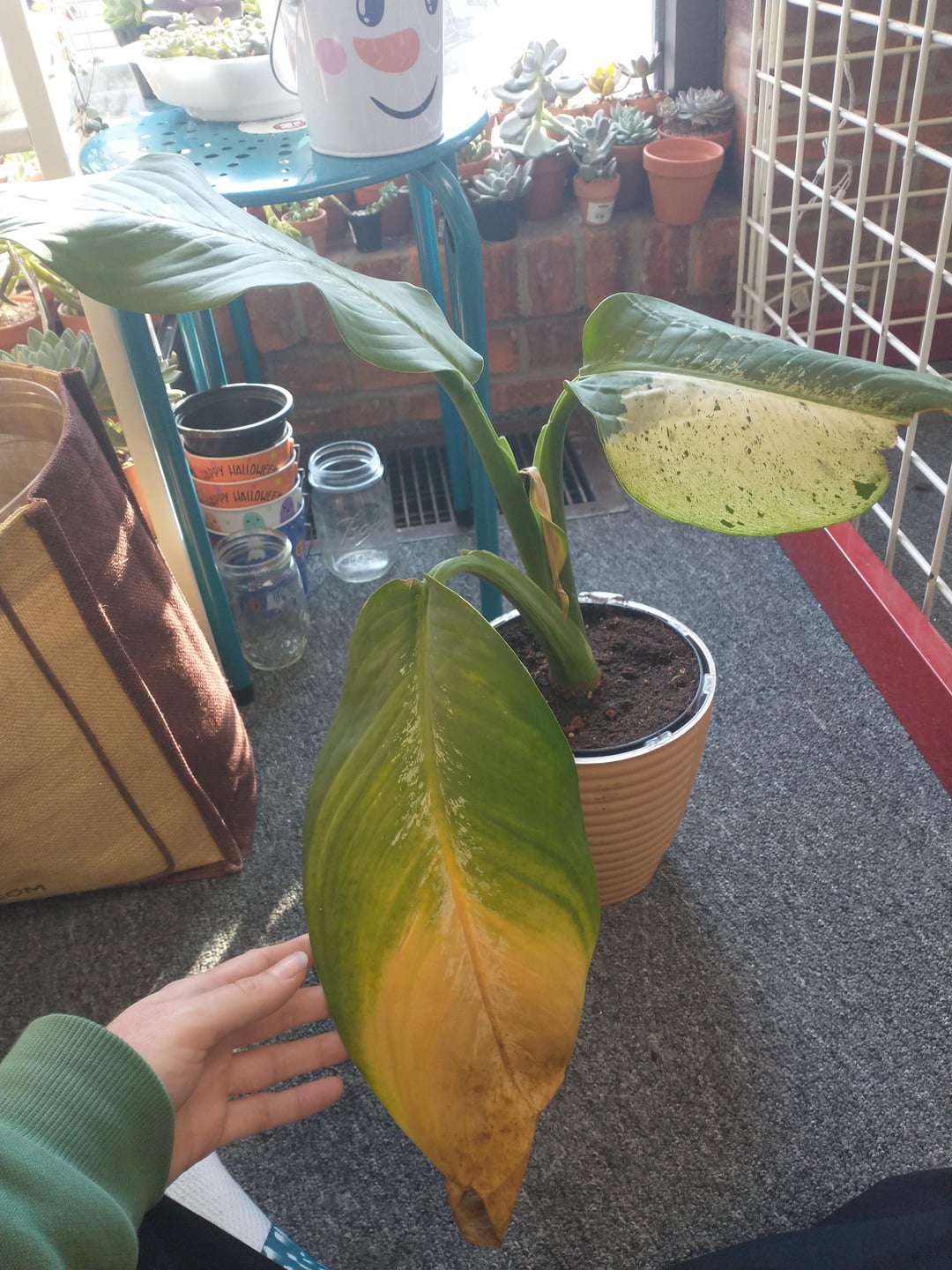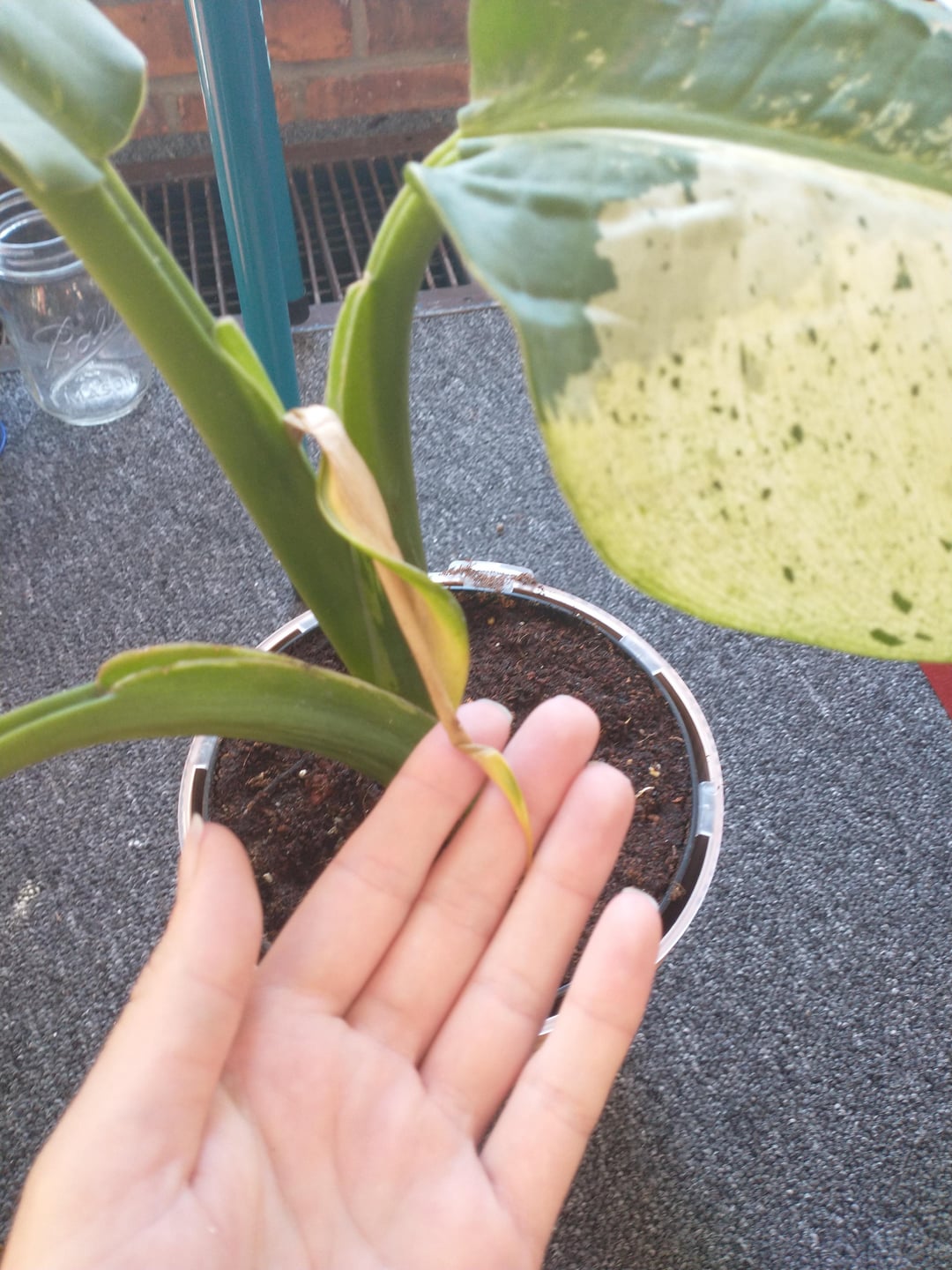 水を土に当て、葉が枯れるのを防ぎます