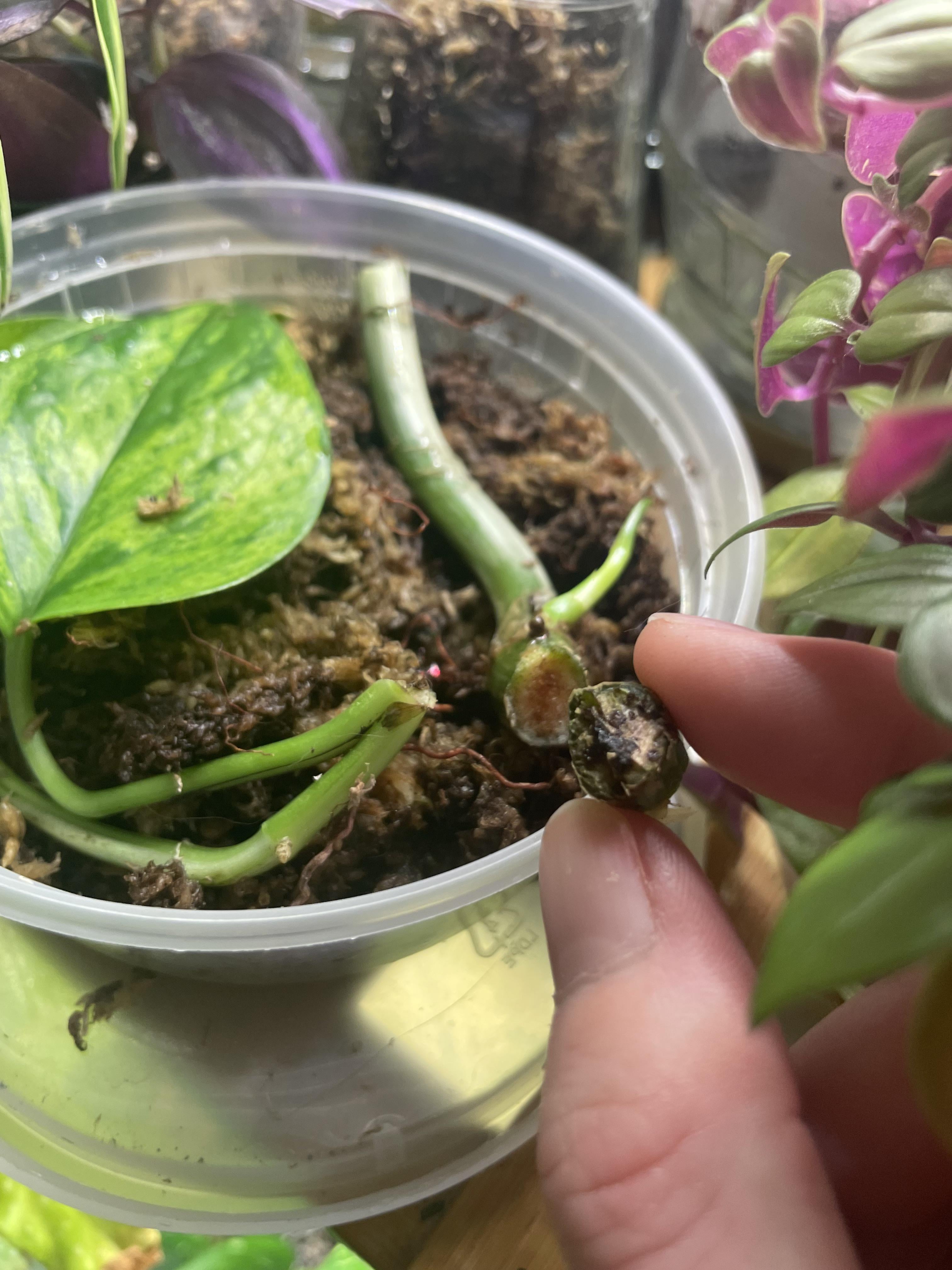 文字通り昨日気づきました。清潔なハサミで腐った部分を切り取り、最後に過酸化物を少し塗りました。今夜、私が持っているピースが外れました。昨日の腐る前の赤い斑点がとても心配です。これはぜひ生かしておきたいフィロマヨイの挿し木です。まだ葉だけが生えていて根が生えていないので余計に心配です。