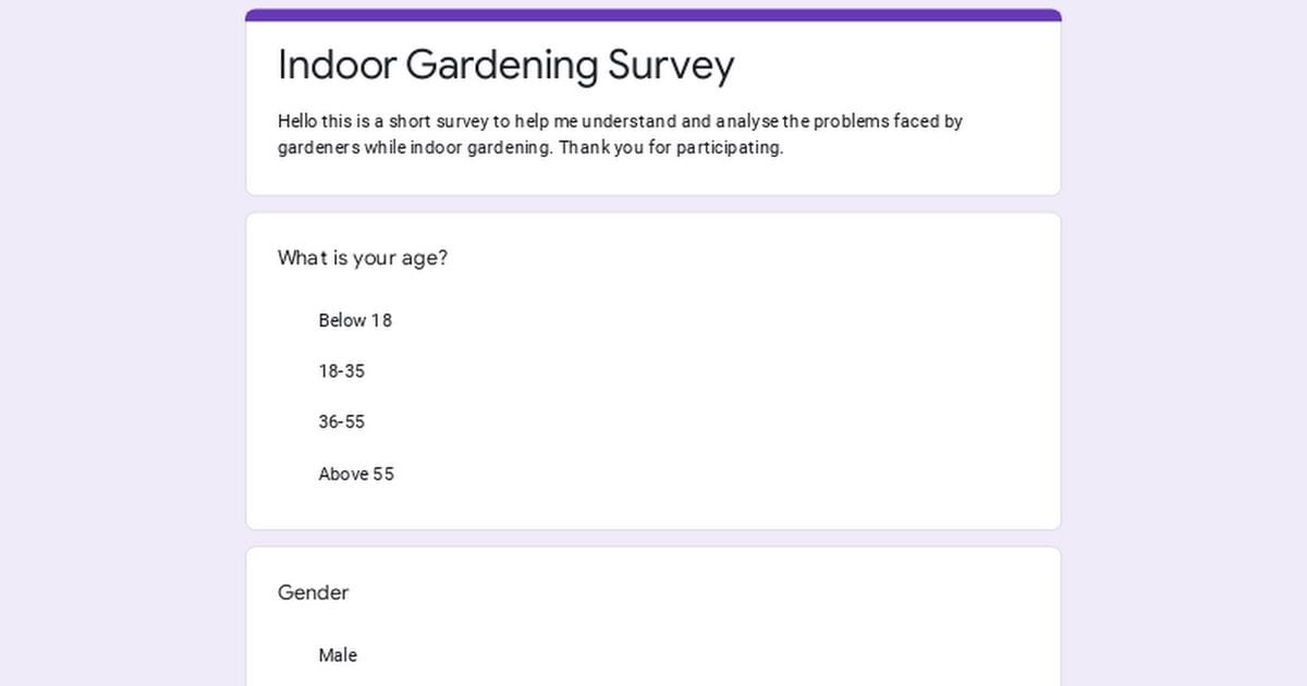 こんにちは、私は室内ガーデニングをもっと簡単に、もっと身近なものにするデザインにとても情熱を持っている大学生です。貴重なお時間を割いてこの短いアンケートにご協力いただければ幸いです。