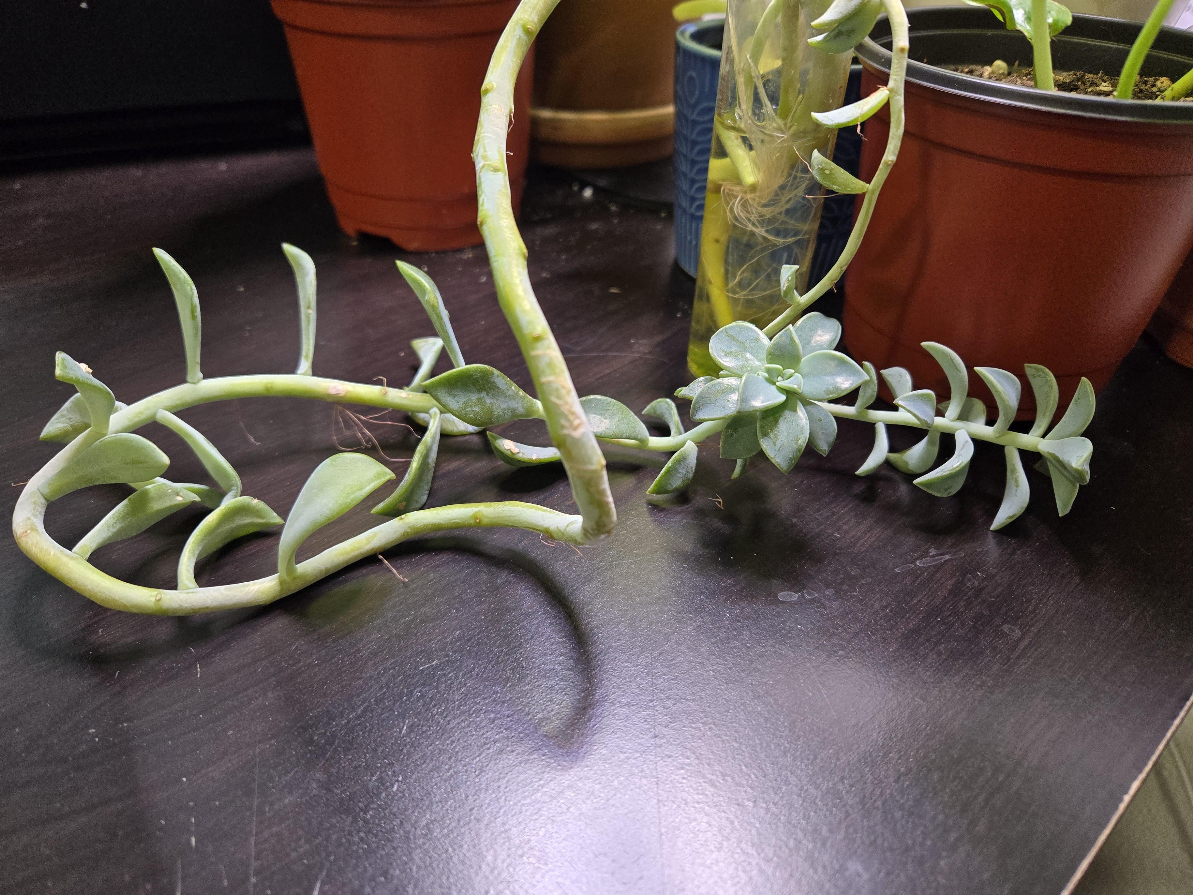 この多肉植物は同僚から贈られたもので、過去5か月間水中で育てていたようです。私の植物識別アプリは、それが幽霊植物/革花弁であることを示していますが、サンプル写真はすべて、はるかにコンパクトな植物です。茎に沿ってたくさんの根が出ているので、彼が土に憧れていることがわかります。 この男は光を奪われすぎて、非常に脚が長くなったのでしょうか?アプリの識別は正しいでしょうか? これは葉で支柱を立てることができる多肉植物ですか?チョップとプロップ? 前もって感謝します!