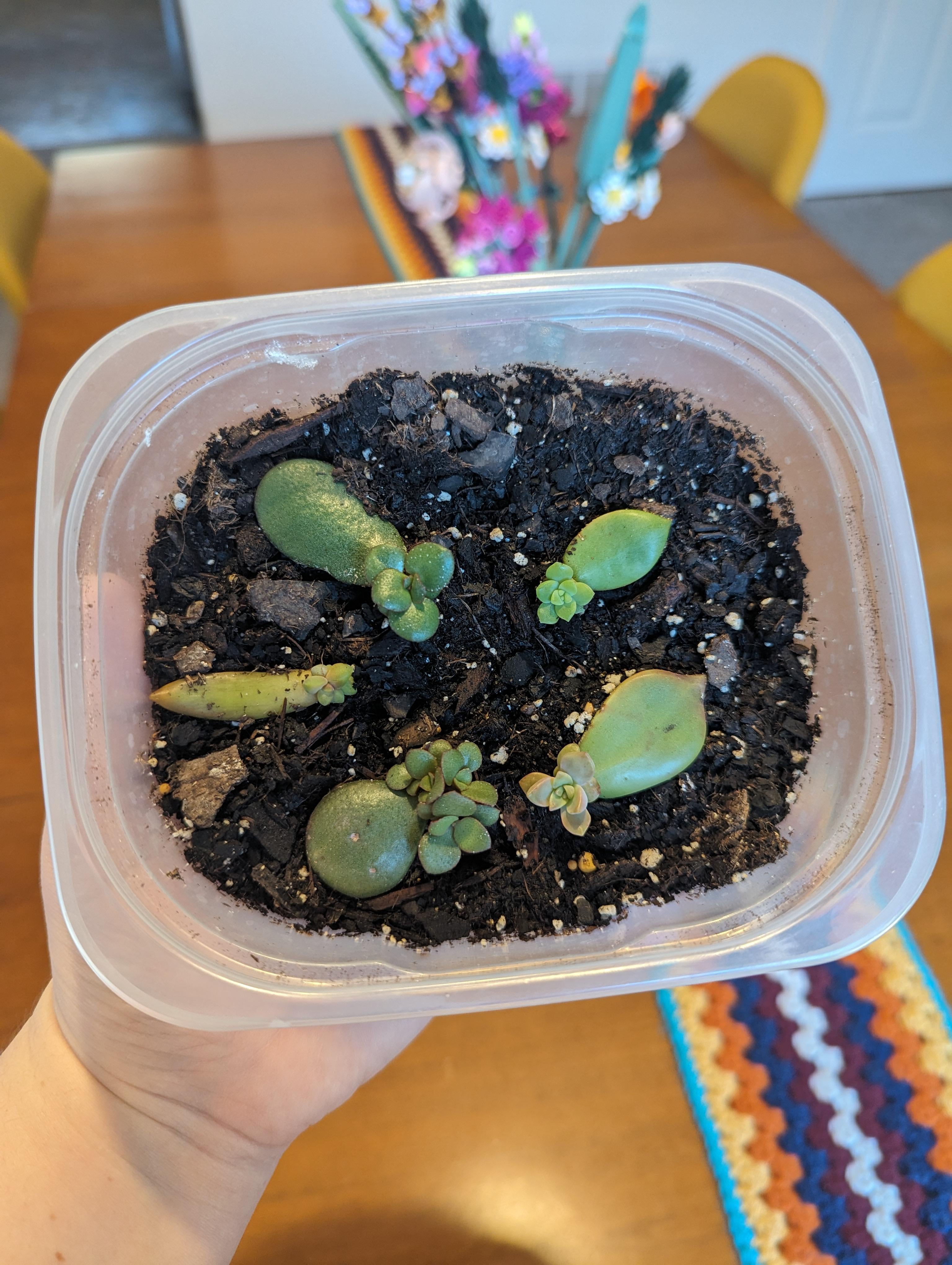 やあみんな! これらは私が(10月に)初めて拾った多肉植物の葉です。 皆さんが言うように、本当にメンテナンスはほとんど必要ありません。 一部が大きくなってきたので、いつ別々に鉢植えにすればよいのか気になります。 親葉がしぼんでしまうまで待つのでしょうか? それともスペースがなくなったらそれを行うだけですか? また — これらに ID はありますか? 初めての人を助けてくれてありがとう!