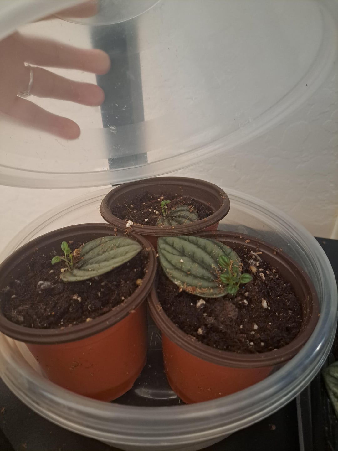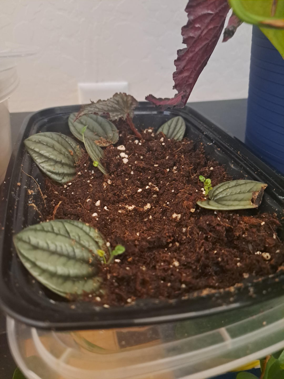 古いタッパーウェアと持ち帰り用コンテナをミニ温室として使用しましたが、小道具がこれほど満足したことはないと思います。 小さな幸せの葉🍃 😌