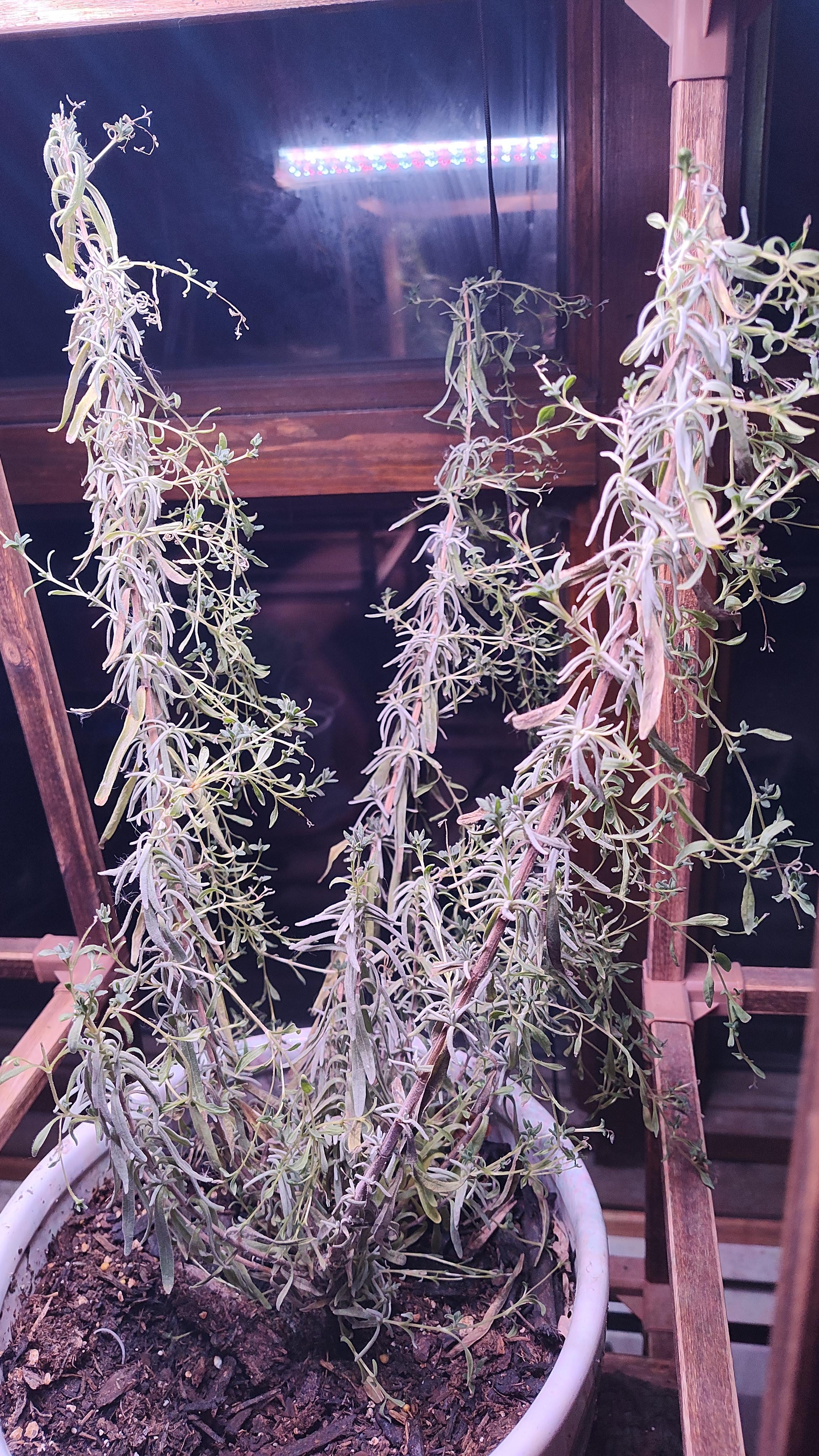 これは私が種から育ててほぼ1年になるイングリッシュラベンダーです。冬はとても厳しいので室内に置いています。 (私はミネソタに住んでいます)約3週間前には、新しい芽が生えてかなり健康そうに見えました。しかし今、葉は茶色に変色し、パリパリになっており、新しい芽は足を引きずっています。育成ライトを追加しましたが、役に立たないようです。これは私のお気に入りの植物の一つなので、助けていただければ幸いです。