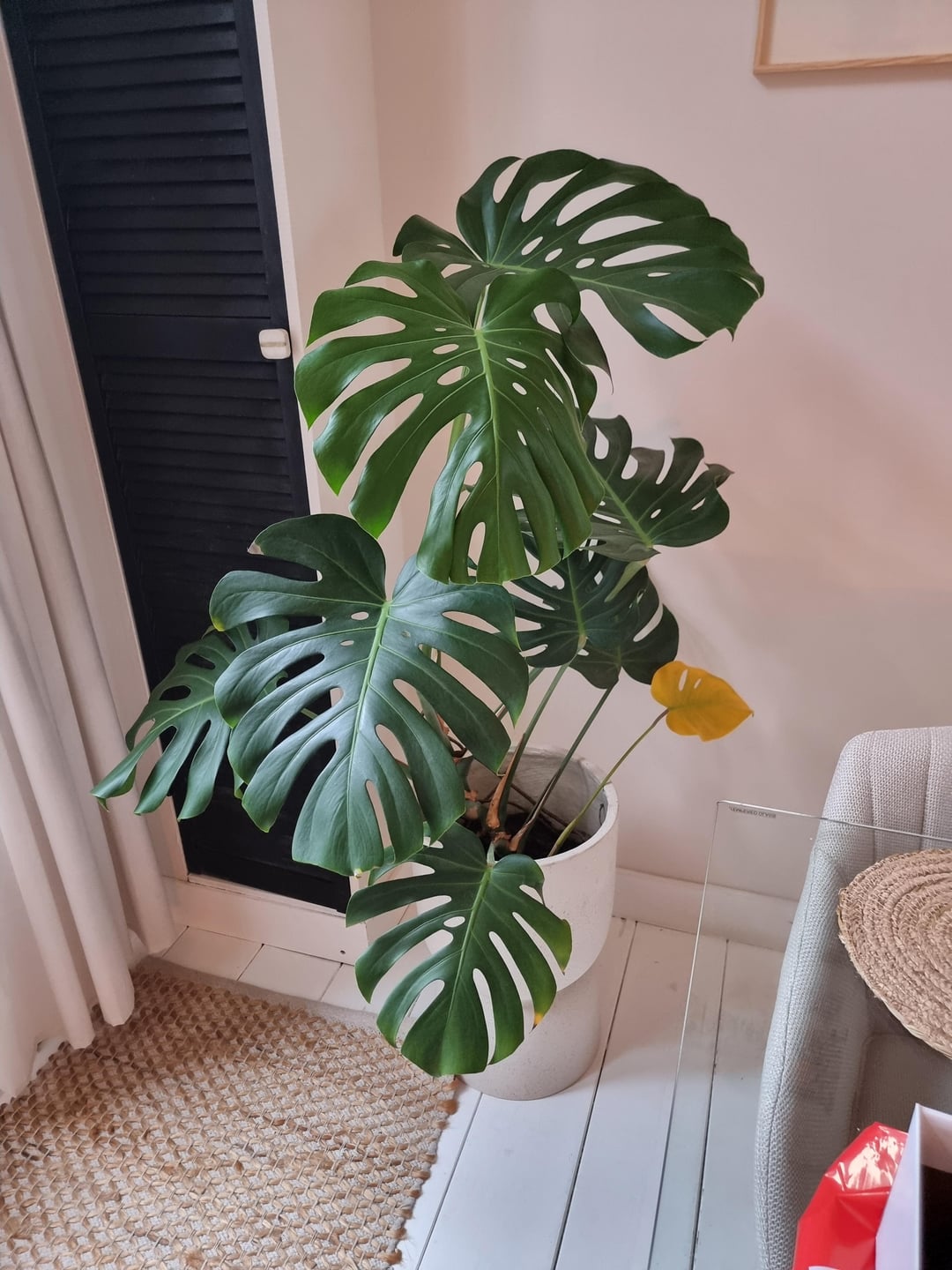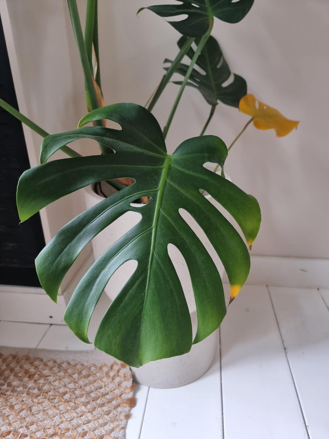 しかし、約1か月前から新しい(かなり大きな)鉢に植えているのですが、突然大きな葉が黄色っぽくなり、先端が茶色になり始めました。いくつかの点が変更されました: