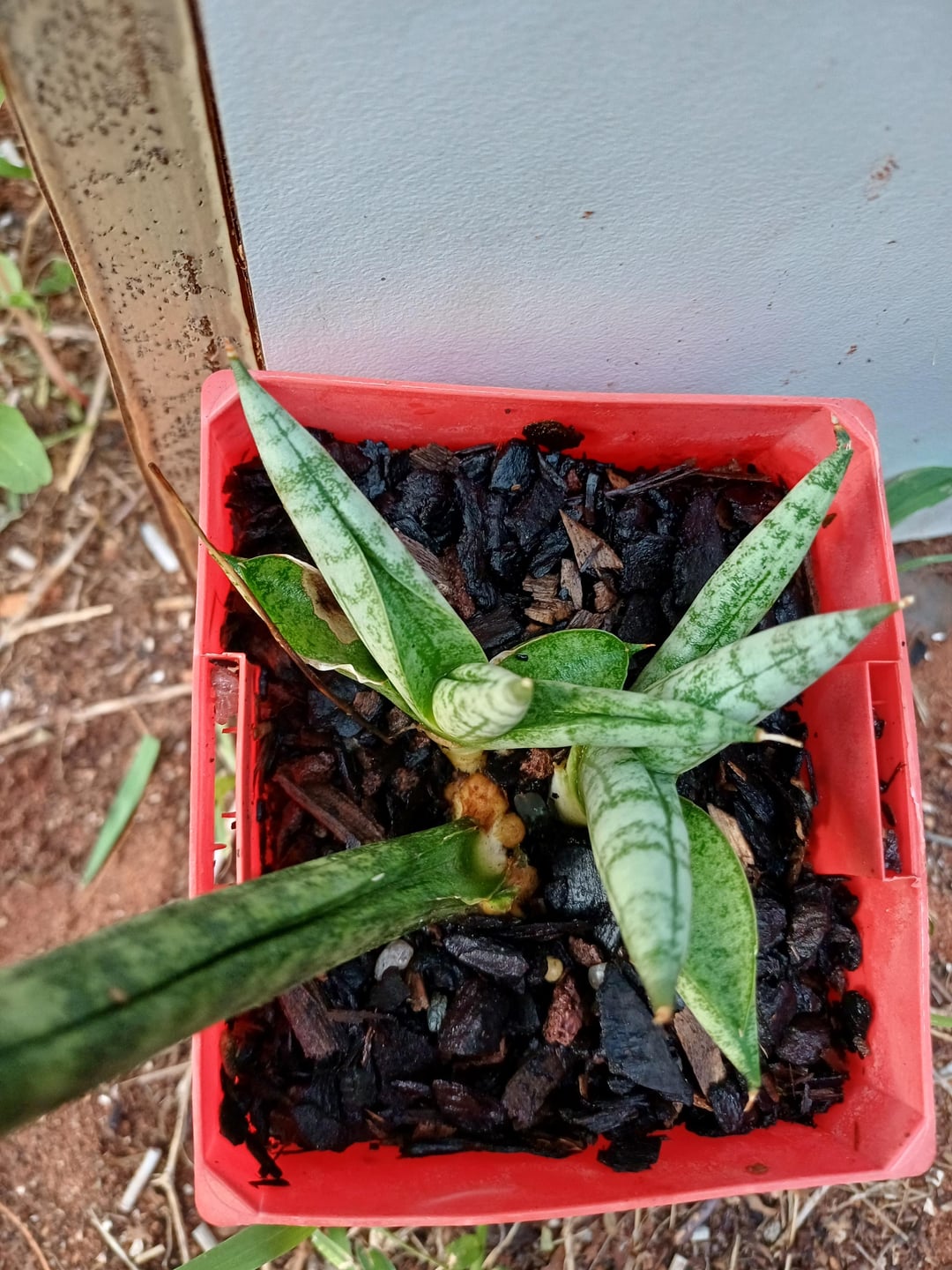 数か月前、このサンスベリアのヘビ植物の葉を他の植物と一緒にトレイに突っ込んだのですが、誤って割ってしまいました。今ではいくつかの植物が成長しました。今日はトレイの植え替えをしました。 醜い古い繁殖葉を切り取ってもいいですか?もう必要ですか?植物にはもう根が生えています。