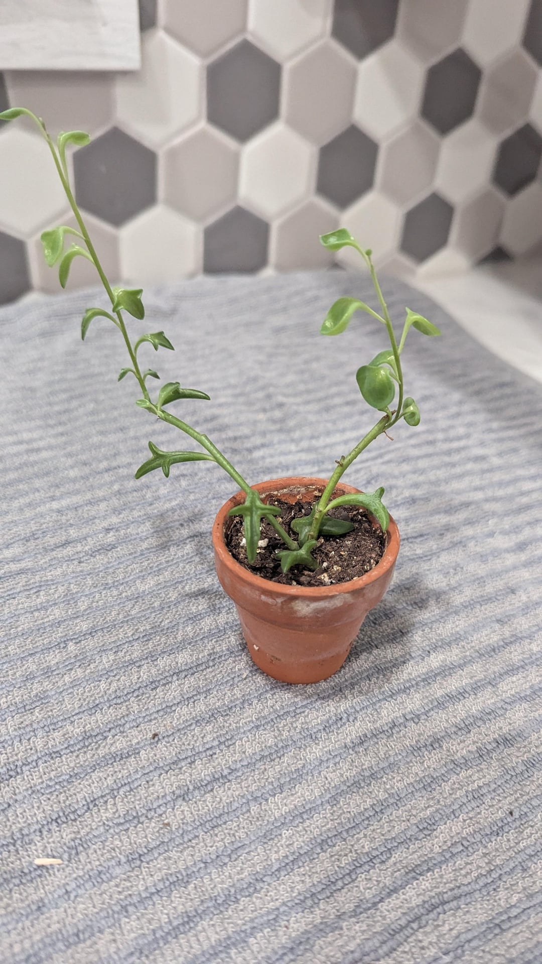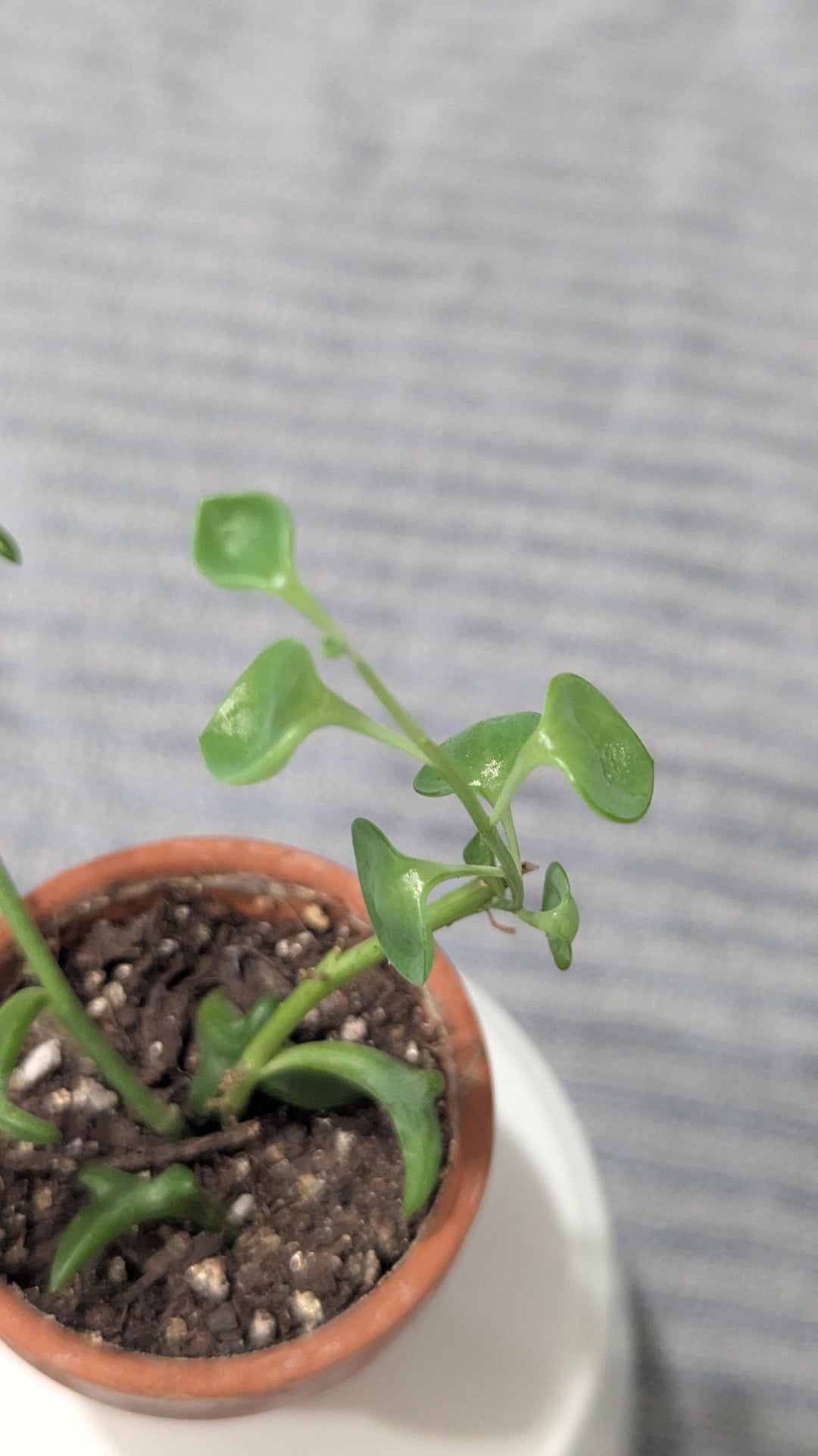 この鉢には2つの異なる部分が土に刺さっており、両方に垂直に新しい芽が生えています。左側の茎では、新しい成長は最初は丸いですが、最終的には典型的なイルカの形になります。右側の茎では、新しい成長は丸いままで、正しい形をとっていないようです。