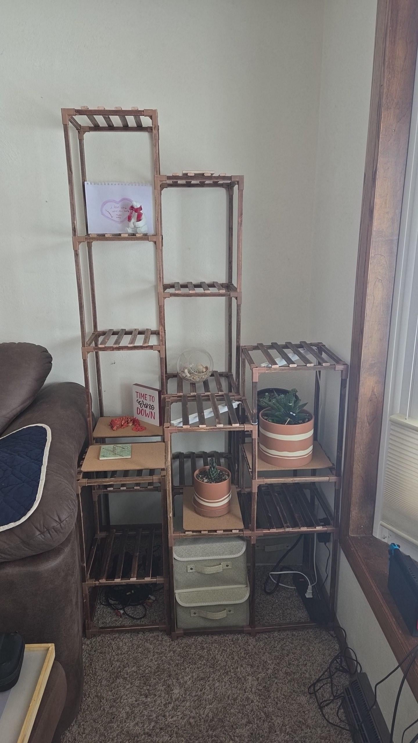 この棚のアイデアを探しています。私は真の低光植物のようなものはないことを知っていますが、このセットアップで働く/繁栄するものを見つけることができることを望んでいます。この棚は、大きな西向きの湾の窓の隣の角にあります。