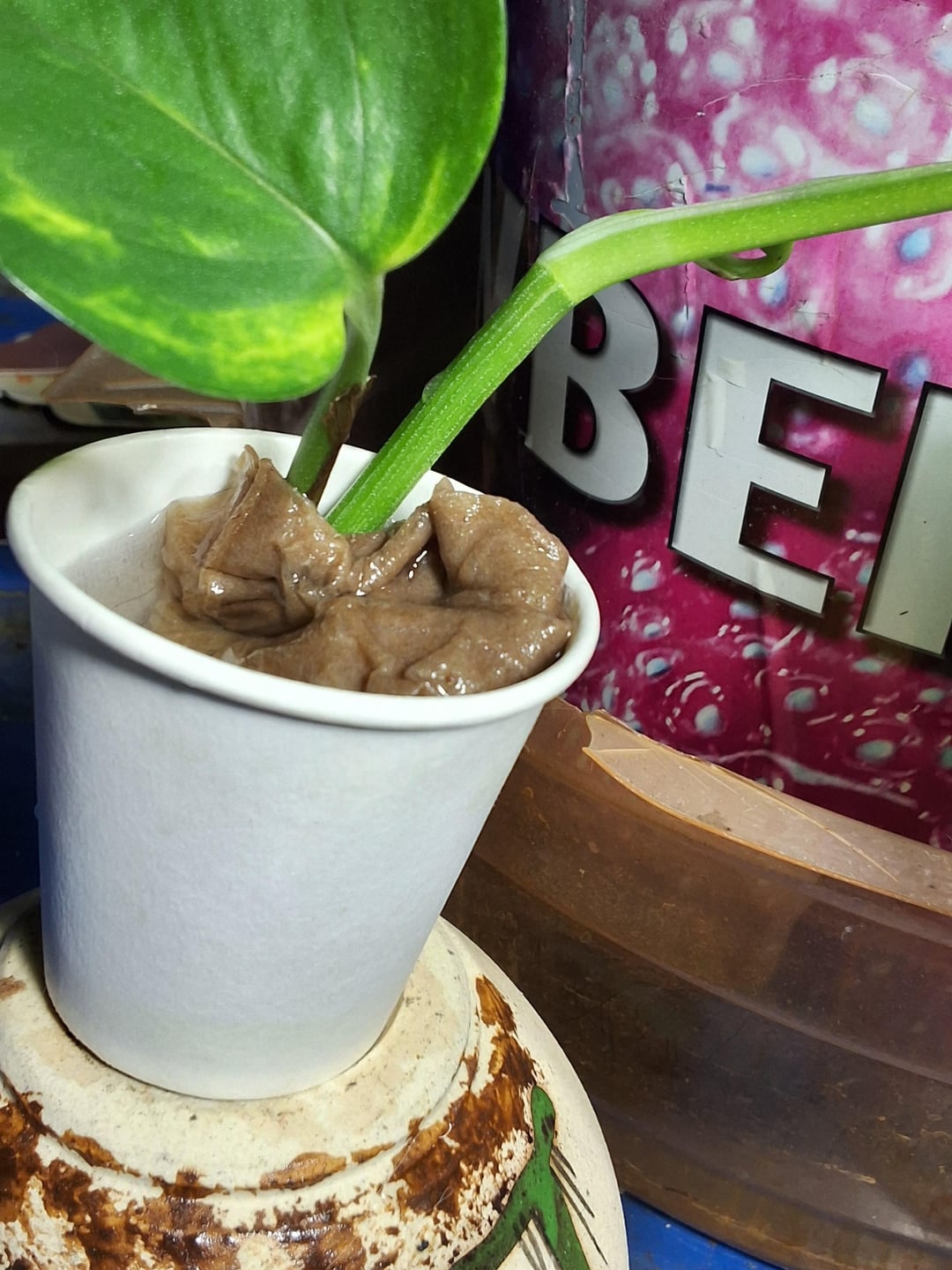 みなさん、みなさん、今日は妹と一緒にカフェにいました。私はそれを支払うように頼んだ後、私は切断を受けることを許されました!!私はプラントでタグをトリプルチェックしましたが、タグはそれが実際に白い多彩であるはずであることを示しました!!貧しいことは非常に低い照明でした(私は今、私はそれが私の成長照明の下にそれを持っていることを望んでいます、そして、私は多様化が戻ってくるでしょう!)私は現在、写真のために一時的にそれを直立させるために、ペーパータオル/ナプキンを水に入れたこの小さなカップにそれを持っています。私はタグが言ったことを書き留めるのを忘れていました、とにかくそれがどんな種類のポトスであるかを伝えるためにそこにいますか、それとも多様化が戻ってくるまで待たなければなりませんか?どんな提案でも大歓迎です