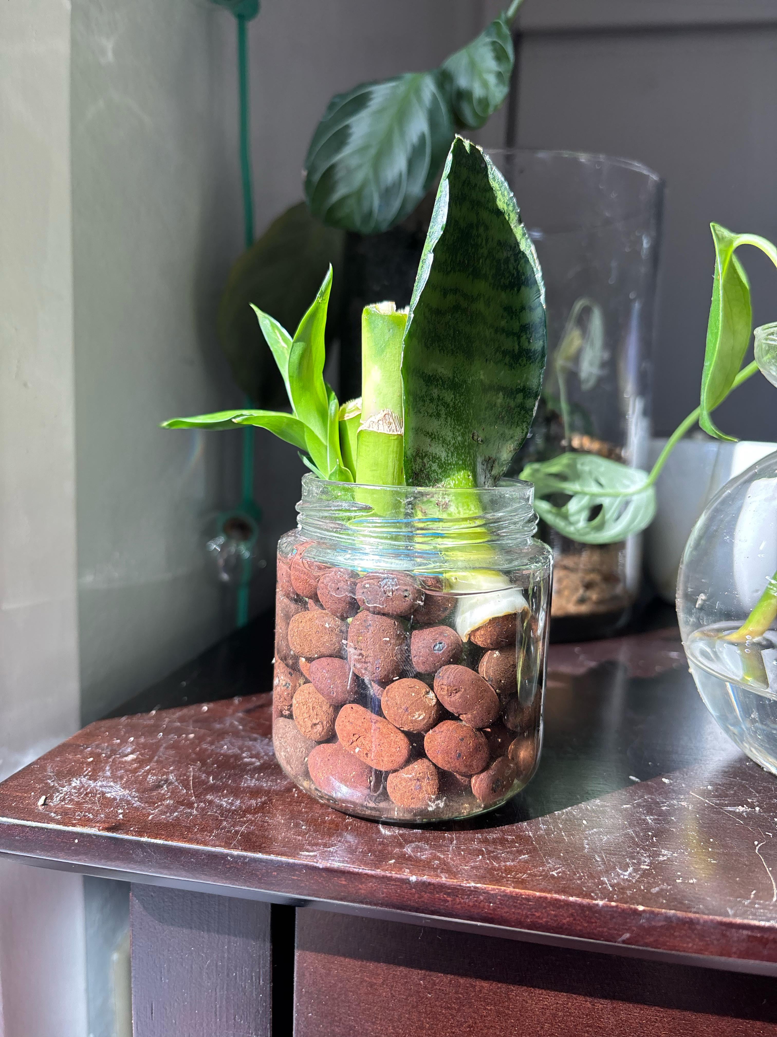 今日、この小さなヘビ植物の葉を見つけて、竹の小道具と一緒に入れました。彼らはこのようなレカと水で大丈夫でしょうか?