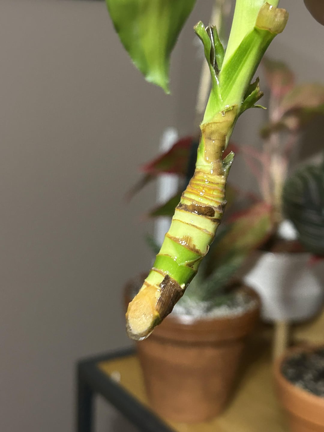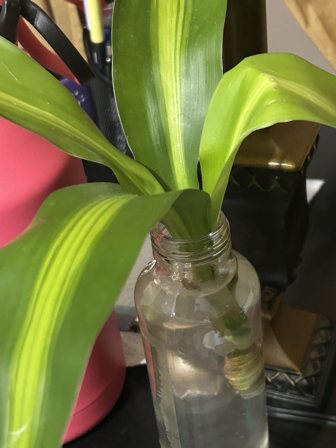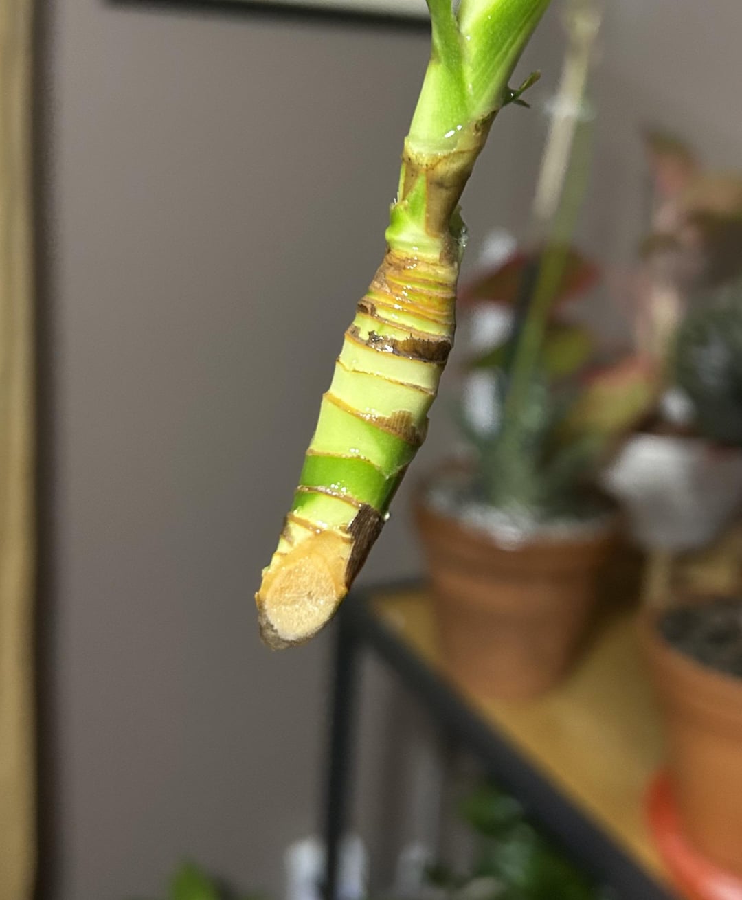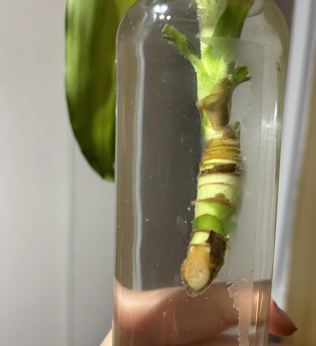私の幸運の植物のこの部分が折れたので、ギザギザの端を切り、発根ホルモンに浸し、約9日前に水に置きました。 根元は真っ白だったのですが、少し茶色くなってきた気がします。 放っておいても根が出るのでしょうか、それとも変な部分は切り取った方が良いのでしょうか?