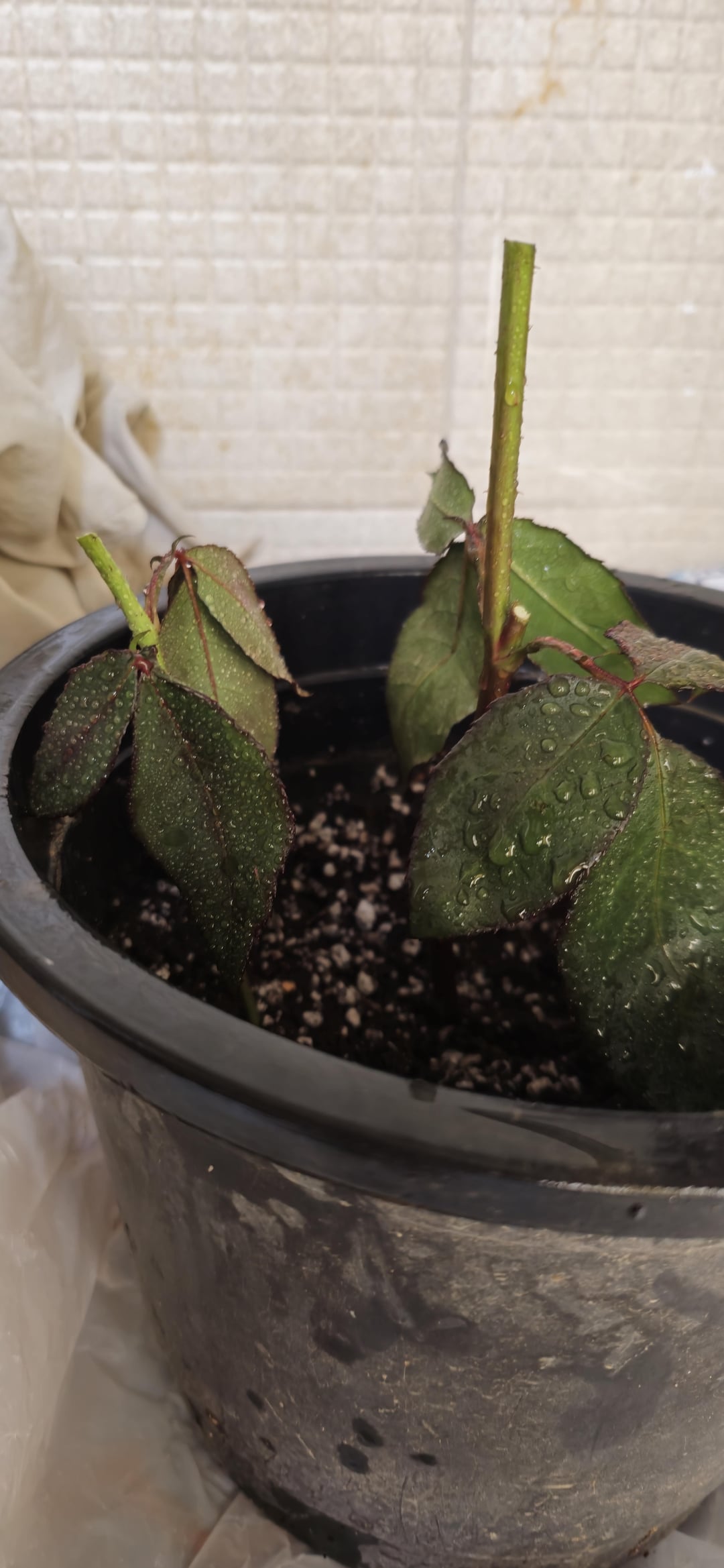 だから私はコメントを聞いて、私のバラの茎を半分にトリミングし、茎のいくつかのノードと底部をハサミで優しく削った。残念ながら、今のところはどんな種類の粉末も持っていません。