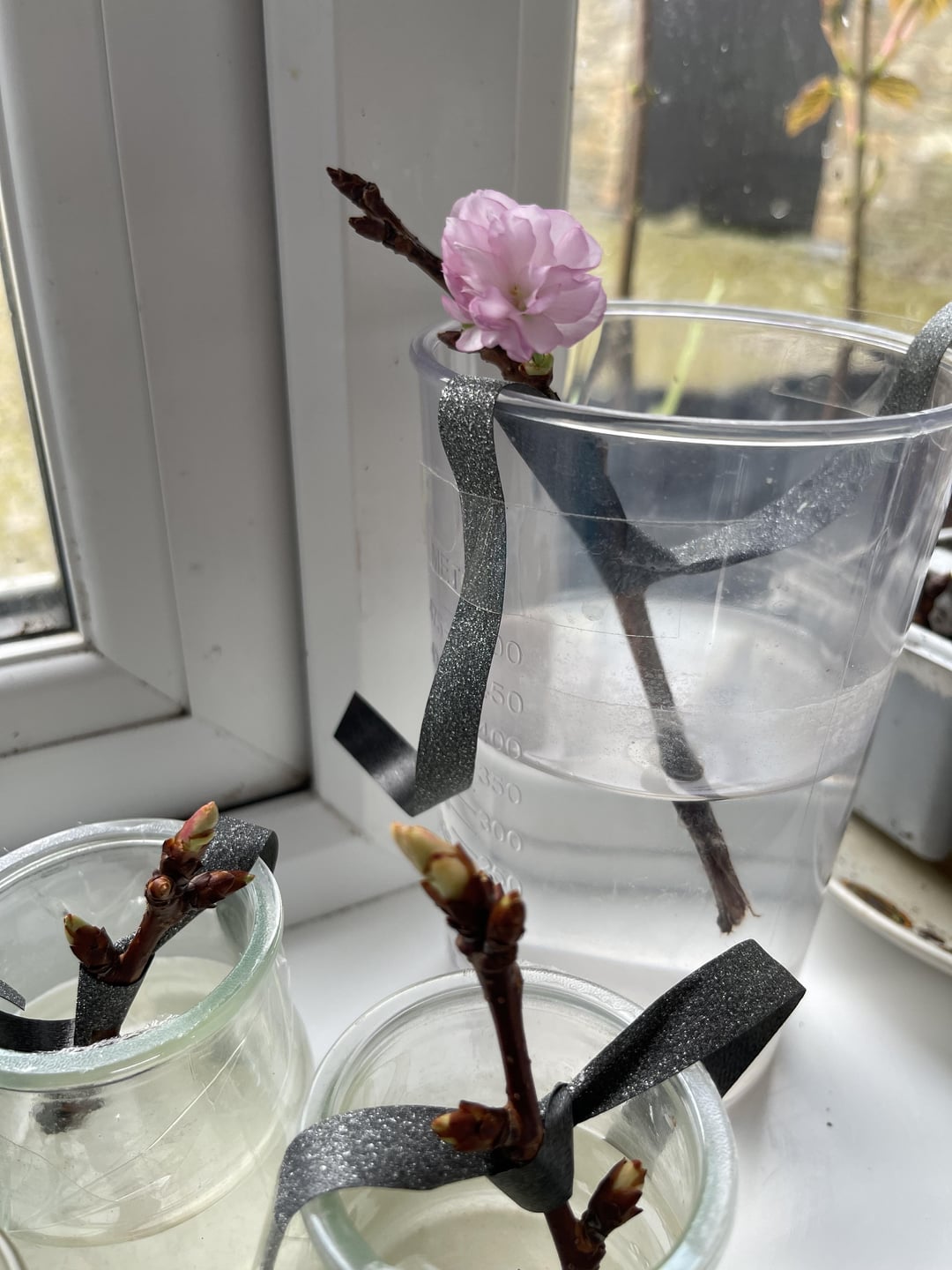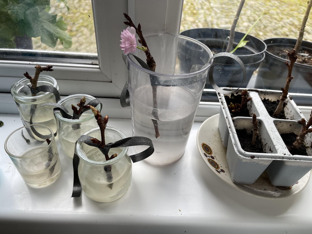 1か月前、私は遊び場で桜の2つの大きな枝を見つけました、それらがどれだけ切断されたかはわかりませんが、私はそれらを私と一緒に家に連れて帰りました、すぐにいくつかのピースを選択し、水を追加し、いくつかを水に加え、堆肥にしました。